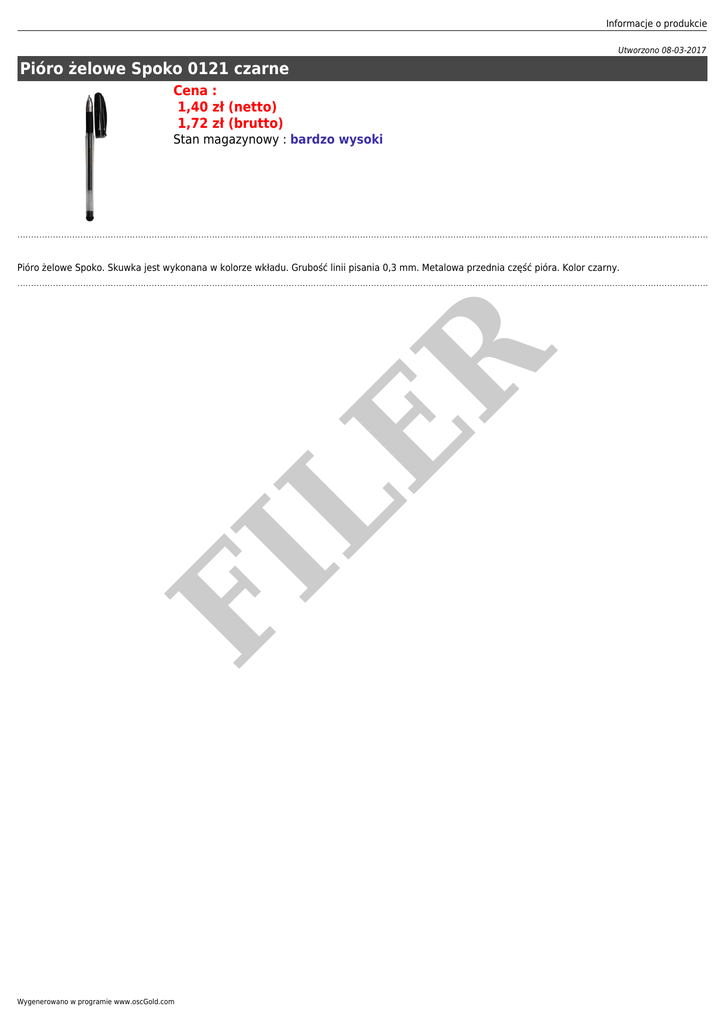 Informacje o produkcie Utworzono 08-03-2017 Pióro żelowe Spoko 0121 czarne Cena : 1,40 zł (netto) 1,72 zł (brutto) Stan magazynowy : bardzo wysoki FI LE R Pióro żelowe Spoko. Skuwka jest wykonana w kolorze wkładu. Grubość linii pisania 0,3 mm. Metalowa przednia część pióra. Kolor czarny. Wygenerowano w programie www.oscGold.com