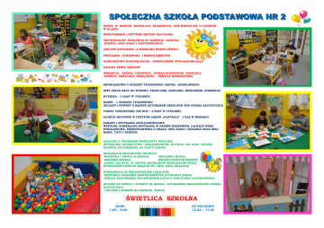 SPOŁECZNA SZKOŁA PODSTAWOWA NR 2 NAUKA W MAŁYCH ZESPOŁACH KLASOWYCH - (NIE WIĘCEJ NIŻ 12 UCZNIÓW W KLASIE) NOWATORSKIE I AKTYWNE METODY NAUCZANIA INDYWIDUALNE PODEJŚCIE DO KAŻDEGO DZIECKA -ROZWÓJ JEGO PASJI I ZAINTERESOWAŃ ZIELONE OTOCZENIE ( Z BOISKAMI) WOKÓŁ SZKOŁY PRZYJAZNA ATMOSFERA I BEZPIECZEŃSTWO KOMFORTOWE WARUNKI NAUKI – NOWOCZEŚNIE WYPOSAŻONE SALE GALOWY STRÓJ SZKOLNY WSPARCIE: -OPIEKĄ LOGOPEDY, -OPIEKĄ HIGIENISTKI SZKOLNEJ, -POMOCĄ PEDAGOGA SZKOLNEGO, -TERAPIĄ SENSORYCZNĄ OBOWIĄZKOWO 3 GODZINY TYGODNIOWO JĘZYKA ANGIELSKIEGO INNY JĘZYK OBCY DO WYBORU: FRANCUSKI, ROSYJSKI, HISZPAŃSKI, NIEMIECKI RYTMIKA – 2 RAZY W TYGODNIU BASEN – 1 GODZINA TYGODNIOWO (DOJAZD I POWRÓT Z BASENU AUTOKAREM SZKOLNYM POD OPIEKĄ NAUCZYCIELI) TANIEC TOWARZYSKI, HIP HOP – 2 RAZY W TYGODNIU ZAJĘCIA RUCHOWE W CENTRUM ZABAW „FANTAZJA” -1 RAZ W MIESIĄCU ZABAWY I SPOTKANIA OKOLICZNOŚCIOWE WSPÓLNE, KAMERALNE SPOTKANIA W GRONIE RODZINNYM, ŁĄCZĄCE WIĘZI POKOLENIOWE, PRZEDSTAWIENIA Z OKAZJI DNIA BABCI I DZIADZIA ORAZ DNIA MAMY, TATY I DZIECKA DBAŁOŚĆ O TWORZENIE WSPÓLNOTY SZKOLNEJ (WYCIECZKI EDUKACYJNO - KRAJOZNAWCZE, WYJŚCIA DO KINA, TEATRU, MUZEUM, FILHARMONII, NA PLACE ZABAW) REALIZACJA PROJEKTÓW UNIJNYCH -WARZYWA I OWOCE W SZKOLE, -SZKLANKA MLEKA -RADOSNA SZKOŁA, -KSIĄŻKI NASZYCH MARZEŃ -AIESEC (ZAJĘCIA W JĘZYKU ANGIELSKIM PROWADZONE PRZEZ STUDENTÓW Z INNYCH KRAJÓW NP. CHIN, INDII, BRAZYLII) WSPÓŁPRACA ZE ŚRODOWISKIEM LOKALNYM -DZIECIĘCA AKADEMIA BEZPIECZEŃSTWA (PATRONAT WSPiA) -SZKOŁA PARTNERSKA WOJEWÓDZKIEJ STACJI POGOTOWIA RATUNKOWEGO DOJAZD DO SZKOŁY I POWRÓT ZE SZKOŁY AUTOKAREM SZKOLNYM POD OPIEKĄ NAUCZYCIELA ( ODJAZD I POWRÓT NA PARKING TESCO) ŚWIETLICA SZKOLNA RANO 7.00 – 8.00 PO POŁUDNIU 12.30 – 17.00 Społeczna Szkoła Podstawowa Nr 2 Społeczne Gimnazjum Nr 2 Społeczne Liceum Ogólnokształcące Społeczne Gimnazjum Nr 2 35-111 Rzeszów ul. Wyspiańskiego 16 a kontakt: Tel. 17 85 44 118 [email protected] www.spoleczna2.pl Zapraszamy !