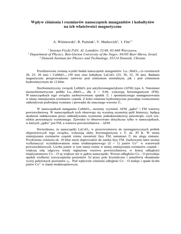 Wpływ ciśnienia i rozmiarów nanocząstek manganitów i kobaltytów na ich właściwości magnetyczne A. Wiśniewski1, R. Puźniak1, V. Markovich2, I. Fita1,3 1 2 Instytut Fizyki PAN, Al. Lotników 32/46, 02-668 Warszawa, Department of Physics, Ben-Gurion University of the Negev, 84105 Beer-Sheva, Israel, 3 Donetsk Institute for Physics and Technology, 83114 Donetsk, Ukraine Przedstawione zostaną wyniki badań nanocząstek manganitów: La1−xMnO3+δ (o rozmiarach 20, 25, 30 nm) i CaMnO3–δ (50 nm) oraz kobaltytu LaCoO3 (25, 30, 32, 38 nm). Badania magnetyczne przeprowadzono zarówno pod ciśnieniem normalnym, jak i pod ciśnieniem hydrostatycznym do 12 kbar. Stechiometryczny związek LaMnO3 jest antyferromagnetykiem (AFM) typu A. Natomiast niestechiometryczne próbki La1−xMnO3+δ, dla δ > 0.06, wykazują ferromagnetyzm (FM). W nanocząstkach tego związku zaobserwowano spadek TC i spontanicznego namagnesowania w miarę zmniejszania rozmiarów cząstek. Z kolei ciśnienie hydrostatyczne powoduje wzmocnienie oddziaływań podwójnej wymiany i prowadzi do znacznego wzrostu TC. W nanocząstkach manganitu CaMnO3-δ możemy wyróżnić AFM „jądro” i FM warstwę powierzchniową. W nanocząstkach tych obserwuje się wyraźną asymetrię pętli histerezy, będącą skutkiem indukowania przez oddziaływania wymienne jednokierunkowej anizotropii, czyli tzw. efektu przesunięcia wymiennego. Zjawisko to obserwowano dotychczas tylko w nanocząstkach, w których „jądro” jest FM, a warstwa powierzchniowa – AFM. Stwierdzono, że nanocząstki LaCoO3, w przeciwieństwie do niemagnetycznych próbek objętościowych tego związku, wykazują słaby ferromagnetyzm z TC ok. 85 K. W miarę zmniejszania rozmiarów cząstek rośnie zawartość fazy FM, natomiast TC nie ulega zmianie. Przyłożenie ciśnienia ok. 10 kbar może doprowadzić do zaniku fazy FM. Zachowanie takie można wytłumaczyć wyindukowaniem stanu średniospinowego (S = 1) jonów Co3+ w warstwach powierzchniowych. Liczba jonów w tym stanie rośnie w miarę zmniejszania rozmiarów cząstek – większą rolę odgrywa wtedy naprężona warstwa powierzchniowa, w której odległości międzyatomowe Co – O są większe niż w jądrze nanocząstki. Wzrost odległości Co – O powoduje spadek wielkości rozszczepienia poziomów 3d przez pole krystaliczne i umożliwia obsadzanie wyżej położonych poziomów eg. Pod wpływem ciśnienia odległość Co – O maleje i spada liczba jonów Co3+ w stanie średniospinowym.