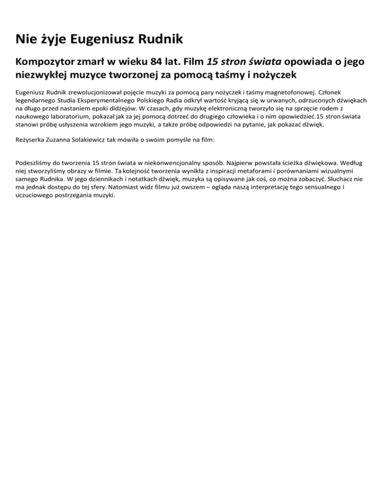 Nie żyje Eugeniusz Rudnik Kompozytor zmarł w wieku 84 lat. Film 15 stron świata opowiada o jego niezwykłej muzyce tworzonej za pomocą taśmy i nożyczek Eugeniusz Rudnik zrewolucjonizował pojęcie muzyki za pomocą pary nożyczek i taśmy magnetofonowej. Członek legendarnego Studia Eksperymentalnego Polskiego Radia odkrył wartość kryjącą się w urwanych, odrzuconych dźwiękach na długo przed nastaniem epoki didżejów. W czasach, gdy muzykę elektroniczną tworzyło się na sprzęcie rodem z naukowego laboratorium, pokazał jak za jej pomocą dotrzeć do drugiego człowieka i o nim opowiedzieć.15 stron świata stanowi próbę usłyszenia wzrokiem jego muzyki, a także próbę odpowiedzi na pytanie, jak pokazać dźwięk. Reżyserka Zuzanna Solakiewicz tak mówiła o swoim pomyśle na film: Podeszliśmy do tworzenia 15 stron świata w niekonwencjonalny sposób. Najpierw powstała ścieżka dźwiękowa. Według niej stworzyliśmy obrazy w filmie. Ta kolejność tworzenia wynikła z inspiracji metaforami i porównaniami wizualnymi samego Rudnika. W jego dziennikach i notatkach dźwięk, muzyka są opisywane jak coś, co można zobaczyć. Słuchacz nie ma jednak dostępu do tej sfery. Natomiast widz filmu już owszem – ogląda naszą interpretację tego sensualnego i uczuciowego postrzegania muzyki.