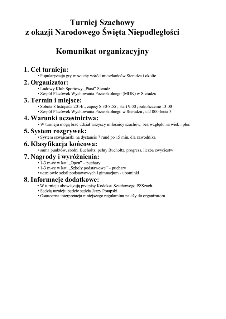 Turniej Szachowy z okazji Narodowego Święta Niepodległości Komunikat organizacyjny 1. Cel turnieju: • Popularyzacja gry w szachy wśród mieszkańców Sieradza i okolic 2. Organizator: • Ludowy Klub Sportowy „Piast” Sieradz • Zespół Placówek Wychowania Pozaszkolnego (MDK) w Sieradzu 3. Termin i miejsce: • Sobota 8 listopada 2014r., zapisy 8:30-8:55 ; start 9:00 ; zakończenie 13:00 • Zespół Placówek Wychowania Pozaszkolnego w Sieradzu , ul.1000-lecia 3 4. Warunki uczestnictwa: • W turnieju mogą brać udział wszyscy miłośnicy szachów, bez względu na wiek i płeć 5. System rozgrywek: • System szwajcarski na dystansie 7 rund po 15 min. dla zawodnika 6. Klasyfikacja końcowa: • suma punktów, średni Bucholtz, pełny Bucholtz, progress, liczba zwycięstw 7. Nagrody i wyróżnienia: • 1-3 m-ce w kat. „Open” – puchary • 1-3 m-ce w kat. „Szkoły podstawowe” – puchary • uczniowie szkół podstawowych i gimnazjum - upominki 8. Informacje dodatkowe: • W turnieju obowiązują przepisy Kodeksu Szachowego PZSzach. • Sędzią turnieju będzie sędzia Jerzy Potapski • Ostateczna interpretacja niniejszego regulaminu należy do organizatora