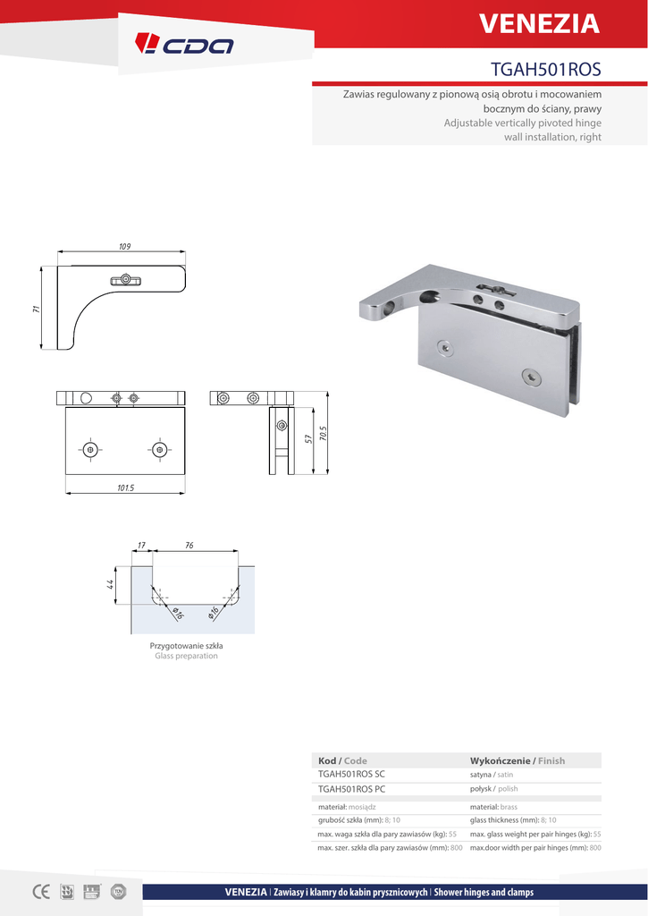 VENEZIA TGAH501ROS Zawias regulowany z pionową osią obrotu i mocowaniem bocznym do ściany, prawy Adjustable vertically pivoted hinge wall installation, right 70.5 57 71 109 101.5 76 ∅1 6 ∅1 6 44 17 Przygotowanie szkła Glass preparation Kod / Code TGAH501ROS SC satyna / satin Wykończenie / Finish TGAH501ROS PC połysk / polish materiał: mosiądz material: brass grubość szkła (mm): 8; 10 glass thickness (mm): 8; 10 max. waga szkła dla pary zawiasów (kg): 55 max. glass weight per pair hinges (kg): 55 max. szer. szkła dla pary zawiasów (mm): 800 max.door width per pair hinges (mm): 800 VENEZIA І Zawiasy i klamry do kabin prysznicowych І Shower hinges and clamps