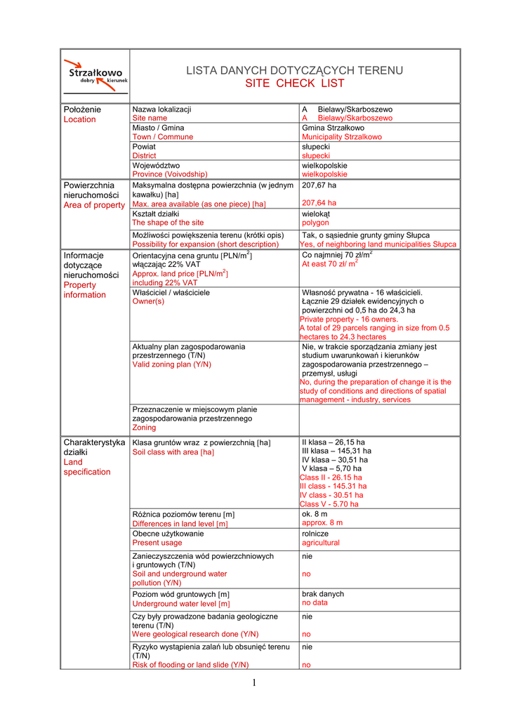 lista danych dotyczących terenu site check list