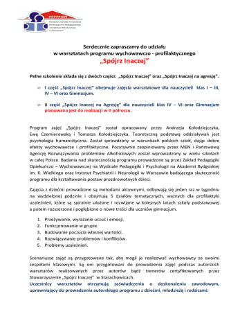Serdecznie zapraszamy do udziału w warsztatach programu wychowawczo - profilaktycznego „Spójrz Inaczej” Pełne szkolenie składa się z dwóch części: „Spójrz Inaczej” oraz „Spójrz Inaczej na agresję”. • I część „Spójrz Inaczej” obejmuje zajęcia warsztatowe dla nauczycieli klas I – III, IV – VI oraz Gimnazjum. • II część „Spójrz Inaczej na Agresję” dla nauczycieli klas IV – VI oraz Gimnazjum planowana jest do realizacji w II półroczu. Program zajęć „Spójrz Inaczej” został opracowany przez Andrzeja Kołodziejczyka, Ewę Czemierowską i Tomasza Kołodziejczyka. Teoretyczną podstawą oddziaływań jest psychologia humanistyczna. Został sprawdzony w warunkach polskich szkół, dając dobre efekty wychowawcze i profilaktyczne. Pozytywnie zaopiniowany przez MEN i Państwową Agencję Rozwiązywania problemów Alkoholowych został wprowadzony w wielu szkołach w całej Polsce. Badania nad skutecznością programu prowadzone są przez Zakład Pedagogiki Opiekuńczo – Wychowawczej na Wydziale Pedagogiki i Psychologii na Akademii Bydgoskiej im. K. Wielkiego oraz Instytut Psychiatrii i Neurologii w Warszawie badającego skuteczność programu dla kształtowania postaw prozdrowotnych dzieci. Zajęcia z dziećmi prowadzone są metodami aktywnymi, odbywają się jeden raz w tygodniu na wydzielonej godzinie i obejmują 5 działów tematycznych, ważnych dla profilaktyki uzależnień, które są spiralnie ułożone i rozwijane w kolejnych latach szkoły podstawowej a potem rozszerzone i pogłębione o nowe treści dla uczniów gimnazjum. 1. 2. 3. 4. 5. Przeżywanie, wyrażanie uczuć i emocji. Funkcjonowanie w grupie. Budowanie poczucia własnej wartości. Rozwiązywanie problemów i konfliktów. Problemy uzależnień. Scenariusze zajęć są przygotowane tak, aby mogli je realizować wychowawcy ze swoimi zespołami klasowymi. Są oni przygotowani do prowadzenia zajęć podczas autorskich warsztatów realizowanych przez autorów bądź trenerów certyfikowanych przez Stowarzyszenie „Spójrz Inaczej” w Starachowicach. Uczestnicy warsztatów otrzymują zaświadczenia o doskonaleniu zawodowym, uprawniający do prowadzenia autorskiego programu z dziećmi, młodzieżą i rodzicami. WARSZTATY PROGRAMU WYCHOWAWCZO - PROFILAKTYCZNEGO „SPÓJRZ INACZEJ” DLA NAUCZYCIELI KLAS I - III TERMIN I OPIS REALIZACJI FORMY: 26,27,28,29 październik 2013r. Warsztat przygotowujący do prowadzenia zajęć w klasach I – III obejmuje pełne 4 dni zajęć. Przez pierwsze dwa dni uczestnicy poznają filozofię programu, ćwiczą komunikację wspierającą w relacji uczeń-uczeń, uczeń- nauczyciel oraz aktywne metody pracy z dziećmi. Zdobywają podstawowe wiadomości i umiejętności konieczne w skutecznej realizacji zajęć, a także przygotowują się do prowadzenia zajęć z dziećmi. Trzeci i czwarty dzień warsztatu poświęcone są na realizację zajęć w klasach oraz omawianie tych zajęć i informacji zwrotnych od innych uczestników warsztatu. Jest to trudna, ale skuteczna forma przygotowań. CEL GŁÓWNY: Celem tego programu jest taki wpływ na dziecko, aby radziło sobie lepiej, bez nadmiernego napięcia z rozwiązywaniem problemów, których dostarcza mu życie, aby rozumiało siebie, umiało współżyć z innymi i potrafiło również w samym sobie znajdować oparcie w trudnych sytuacjach. Zakładając, że jednym z podstawowych źródeł uzależnień jest zła adaptacja do ról i warunków życiowych, dlatego profilaktyka uzależnień powinna koncentrować się na kształtowaniu osobowości dziecka od najmłodszych lat pobytu dziecka w szkole, wspieraniu jego rozwoju zarówno przez treści programowe, jak również osobisty kontakt z nauczycielem, zwłaszcza w klasach I – III. W klasach objętych programem dzieci nie tylko zwiększyły swoje kompetencje społeczne, ale także swoje nastawienie do koleżanek i kolegów w klasie i zyskiwały ich sympatię. Dzięki niej dzieci wcześniej nieakceptowane zyskiwały możliwość zaspokojenia potrzeby przynależności i uznania oraz rozwoju swych społecznych umiejętności w kontaktach z rówieśnikami w klasie szkolnej. NABYTE KOMPETENCJE I UMIEJĘTNOŚCI: Prowadzenie zajęć z dziećmi według zaproponowanych scenariuszy. Rozumienie sensu tego rodzaju pracy z dziećmi, co pomoże w budowaniu własnych programów wychowawczo - profilaktycznych. Skuteczne oddziaływanie w trudnych sytuacjach pojawiających się podczas pracy z grupą dzieci. Dobrze rozumiana współpraca z rodzicami. ILOŚĆ GODZIN: 35 godzin dydaktycznych CENA SZKOLENIA: 350 zł/os (Dokonanie opłaty po zebraniu grupy, a przed datą rozpoczęcia szkolenia). NABÓR TRWA DO DNIA: 16 października 2013r. Zgłoszenia przyjmowane są na podstawie wypełnionego formularza zgłoszeń dostarczonego do siedziby ośrodka osobiście, drogą mailową lub faxem (formularz do pobrania na www.polkowice. edu.pl – dział FORMY DOSKONALENIA). Osoba do kontaktu: specjalista ds. szkoleń Martyna Łabyk tel. 76 746 15 70 WARSZTATY PROGRAMU WYCHOWAWCZO - PROFILAKTYCZNEGO „SPÓJRZ INACZEJ” DLA NAUCZYCIELI KLAS IV – VI TERMIN I OPIS REALIZACJI FORMY: 22,23,24,25,26,27 listopad 2013r. Warsztat przygotowujący do prowadzenia zajęć w klasach IV – VI został podzielony na dwa lub trzy spotkania. Na pierwszą część składają się: integracja grupy i budowanie atmosfery bezpieczeństwa, przedstawienie filozofii i treści programu, ćwiczenie ważnych umiejętności potrzebnych do skutecznej realizacji zajęć z dziećmi, ćwiczenie umiejętności metod wykorzystywanych w programie, symulacja scenariuszy zajęć. Druga część to: zajęcia w szkole z dziećmi ( dwa dni), analiza zajęć z dziećmi – udzielanie informacji zwrotnych przez uczestników warsztatu, omówienie trudnych sytuacji z jakimi spotkali się nauczyciele podczas prowadzonych spotkań z dziećmi. Trzecia część warsztatu: poświęcona jest analizie scenariuszy dotyczącyc