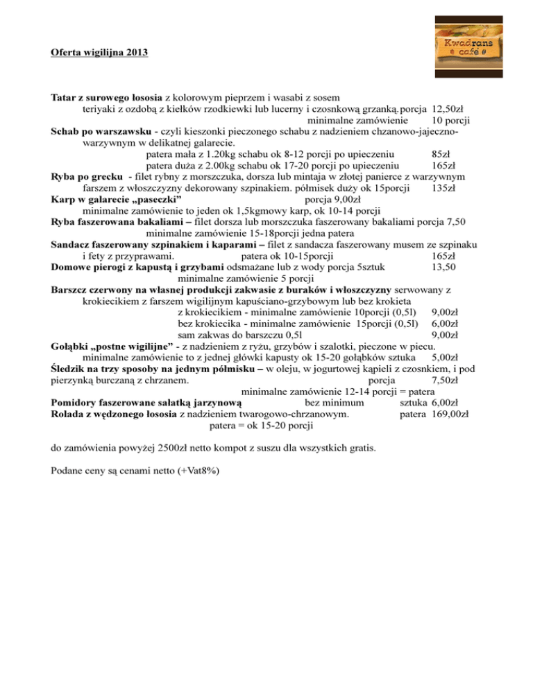 Oferta wigilijna 2013 Tatar z surowego łososia z kolorowym pieprzem i wasabi z sosem teriyaki z ozdobą z kiełków rzodkiewki lub lucerny i czosnkową grzanką.porcja 12,50zł minimalne zamówienie 10 porcji Schab po warszawsku - czyli kieszonki pieczonego schabu z nadzieniem chzanowo-jajecznowarzywnym w delikatnej galarecie. patera mała z 1.20kg schabu ok 8-12 porcji po upieczeniu 85zł patera duża z 2.00kg schabu ok 17-20 porcji po upieczeniu 165zł Ryba po grecku - filet rybny z morszczuka, dorsza lub mintaja w złotej panierce z warzywnym farszem z włoszczyzny dekorowany szpinakiem. półmisek duży ok 15porcji 135zł Karp w galarecie „paseczki” porcja 9,00zł minimalne zamówienie to jeden ok 1,5kgmowy karp, ok 10-14 porcji Ryba faszerowana bakaliami – filet dorsza lub morszczuka faszerowany bakaliami porcja 7,50 minimalne zamówienie 15-18porcji jedna patera Sandacz faszerowany szpinakiem i kaparami – filet z sandacza faszerowany musem ze szpinaku i fety z przyprawami. patera ok 10-15porcji 165zł Domowe pierogi z kapustą i grzybami odsmażane lub z wody porcja 5sztuk 13,50 minimalne zamówienie 5 porcji Barszcz czerwony na własnej produkcji zakwasie z buraków i włoszczyzny serwowany z krokiecikiem z farszem wigilijnym kapuściano-grzybowym lub bez krokieta z krokiecikiem - minimalne zamówienie 10porcji (0,5l) 9,00zł bez krokiecika - minimalne zamówienie 15porcji (0,5l) 6,00zł sam zakwas do barszczu 0,5l 9,00zł Gołąbki „postne wigilijne” - z nadzieniem z ryżu, grzybów i szalotki, pieczone w piecu. minimalne zamówienie to z jednej główki kapusty ok 15-20 gołąbków sztuka 5,00zł Śledzik na trzy sposoby na jednym półmisku – w oleju, w jogurtowej kąpieli z czosnkiem, i pod pierzynką burczaną z chrzanem. porcja 7,50zł minimalne zamówienie 12-14 porcji = patera Pomidory faszerowane sałatką jarzynową bez minimum sztuka 6,00zł Rolada z wędzonego łososia z nadzieniem twarogowo-chrzanowym. patera 169,00zł patera = ok 15-20 porcji do zamówienia powyżej 2500zł netto kompot z suszu dla wszystkich gratis. Podane ceny są cenami netto (+Vat8%)