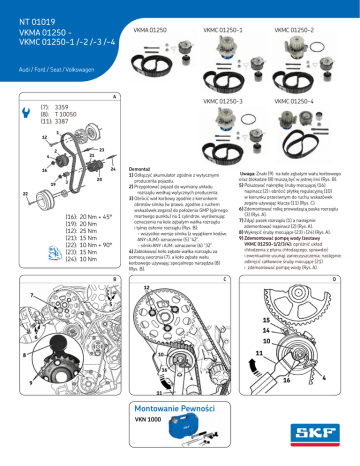 9A GB NT 01019 VKMA 01250 VKMC 01250-1 /-2 /-3 /-4 Audi / Ford / Seat / Volkswagen A (7): 3359 (8): T 10050 (11): 3387 (16): 20 Nm + 45° (19): 20 Nm (12): 25 Nm (21): 15 Nm (22): 10 Nm + 90° (23): 15 Nm (24): 10 Nm (13) : 20 N.m (15) : 15 N.m (16) : 15 N.m tall Confidence AT / SKODA / VOLKSWAGEN 12 B REMOVAL 1) Disconnecting the battery according to the manufacturing guidelines. 2) Prepare the vehicle for the timing VKMA 01250 VKMC 01250-1 replacement according to the manufacturing guidelines. 3) Turn the crankshaft in the engine rotation direction up to TDC. Check the alignment of the timing marks of the camshaft sprocket (3) (Fig. B) and of the crankshaft pulley (4) (Fig. C). Note: If necessary, turn the crankshaft one extra turn to align the marks. 4) Remove the crankshaft pulley. 5) Slacken the tensioner roller nut (13) (Fig. D) and remove the timing belt. 6) Remove the tensioner roller (2). A). 7) Remove the stud (15) (Fig.VKMC 01250-3 8) Removing the water pump (for VKMC 01113-1/2): firstly, bleed the cooling circuit, check it is clean, and clean if required; secondly, fully loosen the water pump fastening bolts (16) and remove the pump (12) (Fig. A). 19) Check the tensioner roller setting (2): the moving pointer (9) must be aligned with the notch (11) to make sure the tension is set (Fig. G). VKMC 01250-2 20) If the marks of the tensioner roller are not aligned, remove the timing belt. Then restart the adjustment operation from step 13). 21) Refit the elements removed in reverse order to removal. 22) Fill the cooling circuit with the permanent fluid recommended. 23) Check the circuit’s leak-tightness when the engine reaches its running temperature and secure the level of coolant when the engine is at ambient temperature (20° C). VKMC 01250-4 REFITTING Caution: Carefully clean the bearing surfaces of the tensioner roller. 9) Refitting the water pump: Firstly, fit the new water pump (12), tighten the waterpump bolts (16) to the torque of 15 N.m, then check Demontaż that akumulator the water pump pulley runs properly, andUwaga: Znaki (9) na kole zębatym wału korbowego 1) Odłączyć zgodnie z wytycznymi oraz blokadzie (8) muszą być w jednej linii (Rys. B). has no pojazdu. hard or locking spots. producenta 10) Fit and tighten the new stud (15) to the5) Poluzować nakrętkę śruby mocującej (16) 2) Przygotować pojazd do wymiany układu napinacz (2) i obrócić płytkę regulacyjną (10) torquewedług of 15 N.m (Fig. A).producenta. rozrządu wytycznych 11)wał Check the alignment of the timing marks w kierunku przeciwnym do ruchu wskazówek 3) Obrócić korbowy zgodnie z kierunkiem (3) (Fig. B).(w prawo, zgodnie z ruchem zegara używając klucza (11) (Rys. C). obrotów silnika 12) Fit the newdotensioner 6) Zdemontować rolkę prowadzącą paska rozrządu wskazówek zegara) położeniaroller GMP (2): (górnego - Fit the positioning pin (5)wyrównując in the hole (6) of (3) (Rys. A). martwego punktu) na 1 cylindrze, the engine block (Fig. D). 7) Zdjąć pasek rozrządu (1) a następnie oznaczenia na kole zębatym wałka rozrządu - Fit the new washer (14) and the new nut (13) zdemontować napinacz (2) (Rys. A). i tylnej osłonie rozrządu (Rys. B): (Fig. D). 8)Wykręcić śruby mocujące (23) i (24) (Rys. A). - wszystkie wersje silnika (z wyjątkiem kodów: 13) Fit the new belt (1) on the crankshaft 9) Zdemontować pompę wody (zestawy ANY i AJM): oznaczenie (5) “4Z”, sprocket. VKMC 01250-1/2/3/4): opróżnić układ - silniki ANY i AJM: oznaczenie (6) “3Z”. 14) Refit the lower timing casing and refit then chłodzenia z płynu chłodzącego, sprawdzić 4) Zablokować koło zębate wałka rozrządu za tighten the crankshaft pulley. i ewentualnie usunąć zanieczyszczenia; następnie pomocą15) sworznia koło zębateof wału Check (7), thea alignment the timing marks odkręcić całkowicie śruby mocujące (21) korbowego używając specjalnego narzędzia (8) (4) (Fig. C). Continue installing the belt in the (Rys. B).following order: water pump sprocket, i zdemontować pompę wody (Rys. A). tensioner roller and camshaft sprocket. C D 16) Tighten the timing belt (1): - Turn the adjustment dial (7) (Fig. D) of the tensioner roller (2) anti-clockwise and clockwise fully 5 times from maximum position to maximum position by using the wrench (8). - Turn the adjustment dial (7) of the tensioner roller (2) fully anti-clockwise and then slacken the tensioner until the moving pointer (9) is aligned with the notch (11) (Fig. E). 17) Tighten the new fastening nut (13) of the tensioner roller (2) to a torque of 20 N.m (Fig. D). 18) Rotate the crankshaft two turns in the engine rotation direction up to TDC. Check the alignment of the marks (3) (Fig. B) and (4) (Fig. C). Montowanie Pewności VKN 1000 E Montaż Uwaga. Najpierw dokładnie oczyścić powierzchnię przylegania rolki/napinacza do bloku silnika. 10)Zamontować pompę wody: przykręcić nową pompę wody (20), stosując moment 15 Nm do śrub mocujących (21); następnie sprawdzić czy koło pasowe pompy płynnie się obraca. 11)Dokręcić nowe śruby mocujące napinacz (23) i rolkę prowadzącą (24) momentem odpowiednio 15 Nm i 10 Nm (Rys. A). 12)Poluzować śruby koła wałka rozrządu (12), a następnie obrócić kołem pasowym tak, aby śruby znalazły się pośrodku jego podłużnych otworów i lekko dokręcić śruby (12) (Rys. C). 13)Umieścić szpilkę blokującą (4) w otworze nowego napinacza (2) (Rys. A). 14)Zamontować nowy napinacz (2): umieścić kołek pozycjonujący (14) w gnieździe (15) bloku silnika (Rys. D). 15)Za pomocą klucza (11) obracać płytką regulacyjną (10) napinacza (2) w kierunku zgodnym z ruchem wskazówek zegara tak długo jak jest to możliwe (Rys. D). Ręką dokręcić nakrętkę mocującą (16) (Rys. D). 16)Założyć nowy pasek rozrządu (1) w następującej kolejności: koło zębate wałka rozrządu, napinacz, koło zębate wału korbowego, pompa wody. 17)Założyć nową rolkę prow
