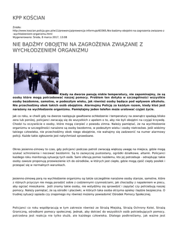 KPP KOŚCIAN Źródło: http://www.koscian.policja.gov.pl/w11/prewencja/prewencja-informuje/63365,Nie-badzmy-obojetni-na-zagrozenia-zwiazane-z -wychlodzeniem-organizmu.html Wygenerowano: Środa, 8 marca 2017, 13:08 NIE BĄDŹMY OBOJĘTNI NA ZAGROŻENIA ZWIĄZANE Z WYCHŁODZENIEM ORGANIZMU Kiedy na dworze panują niskie temperatury, nie zapominajmy, że są osoby które mogą potrzebować naszej pomocy. Problem ten dotyka w szczególności wszystkie osoby bezdomne, samotne, w podeszłym wieku, jak również osoby będące pod wpływem alkoholu. Nie przechodźmy obok takich osób obojętnie. Alarmujmy Policję za każdym razem, kiedy ktoś jest narażony na wychłodzenie organizmu. Pamiętajmy jeden telefon może uratować czyjeś życie. Jak co roku, w chwili gdy na dworze następuje gwałtowne ochłodzenie i temperatury na zewnątrz spadają blisko zera lub poniżej, policjanci zwracają się do wszystkich z apelem o to, aby nie byli obojętni na czyjąś krzywdę. Chodzi tu oczywiście o osoby, które mogą cierpieć z powodu zimna. Należy pamiętać, że na wychłodzenie organizmu w szczególności narażone są osoby bezdomne, w podeszłym wieku i osoby nietrzeźwe. Jeśli widzimy takiego człowieka, nie przechodźmy obok niego obojętnie, nie wahajmy się zadzwonić na numer alarmowy policji. Każde takie zgłoszenie jest natychmiast sprawdzane. Okres jesienno-zimowy to czas, gdy policjanci podczas patroli zwracają większą uwagę na miejsca, gdzie mogą szukać schronienia i nocować bezdomni. Są to zazwyczaj pustostany, ogródki działkowe, altanki. Policjanci każdego roku monitorują sytuację tych osób. Sami oferują pomoc każdemu, kto jej potrzebuje - odnajdując takie osoby zawsze proponują przewiezienie ich do ośrodków, w których jest ciepło, gdzie mogą zjeść ciepły posiłek i przespać się w normalnych warunkach. Jesienno-zimową porą na wychłodzenie organizmu są także szczególnie narażone osoby starsze, samotne, które z różnych przyczyn nie mogą poradzić sobie z codziennymi czynnościami, jak chociażby z napaleniem w piecu, aby ogrzać mieszkanie. Jeśli znamy takie osoby, nie wstydźmy się sprawdzić i zapytać czy potrzebują naszej pomocy. Należy pamiętać, że są ośrodki i placówki, w których taka osoba otrzyma opiekę i będzie bezpieczna. O trudnej sytuacji sąsiada czy znajomego my również możemy powiadomić Ośrodek Pomocy Społecznej. Policjanci co roku współpracują w tym zakresie również ze Strażą Miejską, Strażą Ochrony Kolei, Strażą Graniczną, ośrodkami pomocy społecznej. Jednak, aby dotrzeć do wszystkich osób potrzebujących pomocy, potrzebna jest reakcja nie tylko służb, ale każdego człowieka. Dlatego podkreślamy, jak ważne jest zaangażowanie i informowanie ośrodków pomocy społecznej o osobach bezradnych, samotnych i bezdomnych potrzebujących pomocy. Pamiętajmy, że każdy ma obowiązek reagować na cudzą krzywdę. Nie bądźmy obojętni wobec tych, którzy zwłaszcza teraz mogą potrzebować naszej pomocy. Wystarczy tylko jeden telefon pod numer 112, 997 lub pogotowia ratunkowego. Nasze zainteresowanie, być może przyczyni się do tego, że uratujemy komuś życie. Naszym wspólnym obowiązkiem jest dbałość o życie i zdrowie drugiego człowieka. Dlatego każdy śpiący na ławce, osłabiony czy nietrzeźwy człowiek to sygnał działania dla mundurowych. Nie przechodźmy obok takich osób obojętnie. Pamiętajmy jeden telefon może uratować czyjeś życie. Ocena: 0/5 (0) Tweetnij