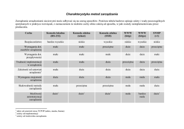 Charakterystyka metod zarządzania Zarządzanie urządzeniami sieciowymi moŜe odbywać się na szereg sposobów. PoniŜsza tabela hasłowo opisuje zalety i wady poszczególnych spotykanych w praktyce rozwiązań, z zaznaczeniem Ŝe niektóre cechy silnie zaleŜą od sposobu, w jaki zostały zaimplementowane przez producenta. Cecha Konsola lokalna (RS-232) Konsola zdalna (telnet) Konsola zdalna (SSH) WWW (http) WWW (https) SNMP (v1) bardzo wysokie niskie wysokie niskie wysokie niskie Wymagania dot. zasobów urządzenia małe małe przeciętne duŜe duŜe przeciętne Wymagania dot. przepływności małe małe małe duŜe duŜe małe Trudność implementacji w urządzeniu mała mała duŜa przeciętna duŜa przeciętna ZaleŜność od ustawień urządzenia1 mała duŜa duŜa duŜa duŜa duŜa Wymagana znajomość urządzenia duŜa duŜa duŜa mała mała mała Skalowalność metody zarządzania mała przeciętna przeciętna mała mała duŜa MoŜliwość automatyzacji zarządzania duŜa2 duŜa2 duŜa2 mała bardzo mała duŜa3 Bezpieczeństwo 1 takŜe od ustawień stosu TCP/IP (adres, maska, brama) zaleŜy od implementacji 3 zaleŜy od środowiska zarządzania 2