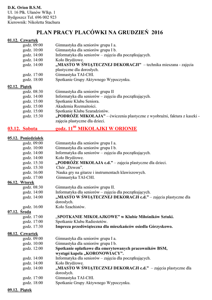 D.K. Orion B.S.M. Ul. 16 Płk. Ułanów Wlkp. 1 Bydgoszcz Tel. 696 002 923 Kierownik: Nikoletta Stachura PLAN PRACY PLACÓWKI NA GRUDZIEŃ 2016 01.12. Czwartek godz. 09:00 godz. 10:00 godz. 14:00 godz. 14:00 godz. 14:00 godz. 17:00 godz. 18:00 02.12. Piątek godz. 08:30 godz. 14:00 godz. 15:00 godz. 15:00 godz. 15:00 godz. 15:30 03.12. Sobota 05.12. Poniedziałek godz. 09:00 godz. 10:00 godz. 14:00 godz. 14:00 godz. 15:30 godz. 15:30 godz. 16:00 godz. 17:00 06.12. Wtorek godz. 08:30 godz. 14:00 godz. 14:00 godz. 16:00 07.12. Środa godz. 17:00 godz. 17:00 godz. 17:30 08.12. Czwartek godz. 09:00 godz. 10:00 godz. 12:00 godz. 14:00 godz. 14:00 godz. 14:00 godz. 17:00 godz. 18:00 09.12. Piątek Gimnastyka dla seniorów grupa I a. Gimnastyka dla seniorów grupa I b. Informatyka dla seniorów – zajęcia dla początkujących. Koło Brydżowe. „MIASTO W ŚWIĄTECZNEJ DEKORACJI” – technika mieszana - zajęcia plastyczne dla dorosłych. Gimnastyka TAI-CHI. Spotkanie Grupy Aktywnego Wypoczynku. Gimnastyka dla seniorów grupa II Informatyka dla seniorów – zajęcia dla początkujących. Spotkanie Klubu Seniora. Akademia Rozmaitości. Spotkanie Klubu Szaradzistów. „PODRÓŻE MIKOŁAJA” – ćwiczenia plastyczne z wyobraźni, faktura z kaszki zajęcia plastyczne dla dzieci. godz. 1100 MIKOŁAJKI W ORIONIE Gimnastyka dla seniorów grupa I a. Gimnastyka dla seniorów grupa I b. Informatyka dla seniorów – zajęcia dla początkujących. Koło Brydżowe. „PODRÓŻE MIKOŁAJA c.d.” – zajęcia plastyczne dla dzieci. Chór „Dzwon”. Nauka gry na gitarze i instrumentach klawiszowych. Gimnastyka TAI-CHI. Gimnastyka dla seniorów grupa II. Informatyka dla seniorów – zajęcia dla początkujących. „MIASTO W ŚWIĄTECZNEJ DEKORACJI c.d.” – zajęcia plastyczne dla dorosłych. Koło Szachistów. „SPOTKANIE MIKOŁAJKOWE” w Klubie Miłośników Sztuki. Spotkanie Klubu Radiestetów. Impreza przedświąteczna dla mieszkańców osiedla Górzyskowo. Gimnastyka dla seniorów grupa I a. Gimnastyka dla seniorów grupa I b. Spotkanie opłatkowe dla emerytowanych pracowników BSM, wystąpi kapela „KORONOWIACY”. Informatyka dla seniorów – zajęcia dla początkujących. Koło Brydżowe. „MIASTO W ŚWIĄTECZNEJ DEKORACJI c.d.” – zajęcia plastyczne dla dorosłych. Gimnastyka TAI-CHI. Spotkanie Grupy Aktywnego Wypoczynku. godz. 08:30 godz. 14:00 godz. 15:00 godz. 15:00 godz. 15:00 godz. 15:30 12.12. Poniedziałek godz. 09:00 godz. 10:00 godz. 14:00 godz. 14:00 godz. 15:30 godz. 15:30 godz. 16:00 godz. 16:30 godz. 17:00 13.12. Wtorek godz. 08:30 godz. 14:00 godz. 14:00 godz. 16:00 godz. 17:00 14.12. Środa godz. 17:00 godz. 17:00 15.12. Czwartek godz. 09:00 godz. 10:00 godz. 14:00 godz. 14:00 godz. 14:00 godz. 17:00 godz. 18:00 16.12. Piątek godz. 08:30 godz. 14:00 godz. 15:00 godz. 15:00 godz. 15:00 godz. 15:30 godz. 16:00 19.12. Poniedziałek godz. 09:00 godz. 10:00 godz. 14:00 godz. 14:00 godz. 15:30 godz. 15:30 godz. 16:00 godz. 17:00 20.12. Wtorek godz. 08:30 Gimnastyka dla seniorów grupa II Informatyka dla seniorów – zajęcia dla początkujących. Spotkanie Klubu Seniora. Akademia Rozmaitości. Spotkanie Klubu Szaradzistów. „PŁASKORZEŹBY Z PLASTELINY NA TALERZYKACH” - zajęcia plastyczne dla dzieci. Gimnastyka dla seniorów grupa I a. Gimnastyka dla seniorów grupa I b. Informatyka dla seniorów – zajęcia dla początkujących. Koło Brydżowe. „GWAIZDKA 2016” – konkurs plastyczny dla dzieci na kartkę świąteczną. Chór „Dzwon”. Nauka gry na gitarze i instrumentach klawiszowych. Spotkanie Klubu Miłośników Zdrowego Stylu Życia. Gimnastyka TAI-CHI. Gimnastyka dla seniorów grupa II. Informatyka dla seniorów – zajęcia dla początkujących. „MIASTO W ŚWIĄTECZNEJ DEKORACJI c.d.” – zajęcia plastyczne dla dorosłych. Koło Szachistów. „OSIEDLOWY OPŁATEK” - spotkanie wigilijne w Klubie Miłośników Błonia. „WIGILIJNA GWIAZDA” - wigilia Klubu Miłośników Sztuki, spotkanie tylko dla członków klubu! Spotkanie Klubu Radiestetów. Gimnastyka dla seniorów grupa I a. Gimnastyka dla seniorów grupa I b. Informatyka dla seniorów – zajęcia dla początkujących. Koło Brydżowe. „KOPIA WYBRANEJ REPRODUKCJI” – farby plakatowe - zajęcia plastyczne dla dorosłych. Gimnastyka TAI-CHI. Spotkanie Grupy Aktywnego Wypoczynku. Gimnastyka dla seniorów grupa II Informatyka dla seniorów – zajęcia dla początkujących. Spotkanie Klubu Seniora. Akademia Rozmaitości. Spotkanie Klubu Szaradzistów. „KOLĘDA” – ilustracje do wiersza - zajęcia plastyczne dla dzieci. Spotkanie Polskiego Związku Emerytów, Rencistów i Inwalidów. Gimnastyka dla seniorów grupa I a. Gimnastyka dla seniorów grupa I b. Informatyka dla seniorów – zajęcia dla początkujących. Koło Brydżowe. „CHOINKA I INNE TEMATY ŚWIĄTCZNE” – wyklejanka mozaikowa - zajęcia plastyczne dla dzieci. Chór „Dzwon”. Nauka gry na gitarze i instrumentach klawiszowych. Gimnastyka TAI-CHI. Gimnastyka dla seniorów grupa II. godz. 14:00 godz. 14:00 godz. 16:00 godz. 16:00 godz. 17:30 Informatyka dla seniorów – zajęcia dla początkujących. „KOPIA WYBRANEJ REPRODUKCJI c.d.” – zajęcia plastyczne dla dorosłych. Koło Szachistów. Sybiracy. „SPÓŁDZIELCZY OPŁATEK” – świąteczne spotkanie Rady Nadzorczej, Zarządu z Prezydiami Rad Osiedlowych BSM. 21.12. Środa godz. 17:00 godz. 17:00 „KLUBOWA CHOINKA” - spotkanie Klubu Miłośników Sztuki. Spotkanie Klubu Radiestetów. 22.12. Czwartek godz. 09:00 godz. 10:00 godz. 14:00 godz. 14:00 godz. 14:00 godz. 17:00 godz. 18:00 Gimnastyka dla seniorów grupa I a. Gimnastyka dla seniorów grupa I b. Informatyka dla seniorów – zajęcia dla początkujących. Koło Brydżowe. „KOPIA WYBRANEJ REPRODUKCJI c.d.” – zajęcia plastyczne dla dorosłych. Gimnastyka TAI-CHI. Spotkanie Grupy Aktywnego Wypoczynku. 23.12. Piątek godz. 08:30 godz. 14:00 godz. 15:00 godz. 15:00 godz. 15:00 godz. 15:30