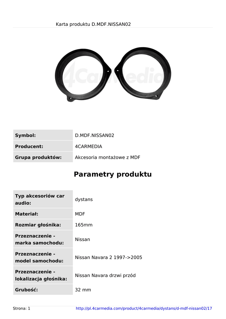 Karta produktu D.MDF.NISSAN02 Symbol: D.MDF.NISSAN02 Producent: 4CARMEDIA Grupa produktów: Akcesoria montażowe z MDF Parametry produktu Typ akcesoriów car audio: dystans Materiał: MDF Rozmiar głośnika: 165mm Przeznaczenie marka samochodu: Przeznaczenie model samochodu: Przeznaczenie lokalizacja głośnika: Grubość: Strona: 1 Nissan Nissan Navara 2 1997->2005 Nissan Navara drzwi przód 32 mm http://pl.4carmedia.com/product/4carmedia/dystans/d-mdf-nissan02/17 Karta produktu D.MDF.NISSAN02 Właściwości car audio: impregnowany Informacje dodatkowe Masa brutto: Strona: 2 0,331 kg http://pl.4carmedia.com/product/4carmedia/dystans/d-mdf-nissan02/17