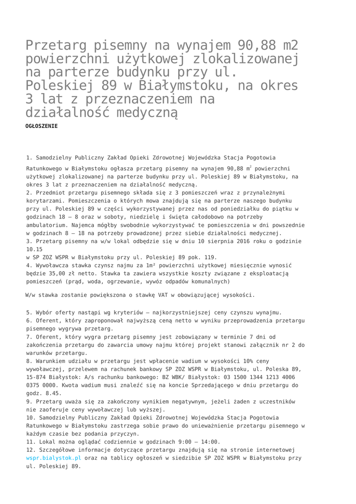 Przetarg pisemny na wynajem 90,88 m2 powierzchni użytkowej zlokalizowanej na parterze budynku przy ul. Poleskiej 89 w Białymstoku, na okres 3 lat z przeznaczeniem na działalność medyczną OGŁOSZENIE 1. Samodzielny Publiczny Zakład Opieki Zdrowotnej Wojewódzka Stacja Pogotowia Ratunkowego w Białymstoku ogłasza przetarg pisemny na wynajem 90,88 m2 powierzchni użytkowej zlokalizowanej na parterze budynku przy ul. Poleskiej 89 w Białymstoku, na okres 3 lat z przeznaczeniem na działalność medyczną. 2. Przedmiot przetargu pisemnego składa się z 3 pomieszczeń wraz z przynależnymi korytarzami. Pomieszczenia o których mowa znajdują się na parterze naszego budynku przy ul. Poleskiej 89 w części wykorzystywanej przez nas od poniedziałku do piątku w godzinach 18 – 8 oraz w soboty, niedzielę i święta całodobowo na potrzeby ambulatorium. Najemca mógłby swobodnie wykorzystywać te pomieszczenia w dni powszednie w godzinach 8 – 18 na potrzeby prowadzonej przez siebie działalności medycznej. 3. Przetarg pisemny na w/w lokal odbędzie się w dniu 10 sierpnia 2016 roku o godzinie 10.15 w SP ZOZ WSPR w Białymstoku przy ul. Poleskiej 89 pok. 119. 4. Wywoławcza stawka czynsz najmu za 1m² powierzchni użytkowej miesięcznie wynosić będzie 35,00 zł netto. Stawka ta zawiera wszystkie koszty związane z eksploatacją pomieszczeń (prąd, woda, ogrzewanie, wywóz odpadów komunalnych) W/w stawka zostanie powiększona o stawkę VAT w obowiązującej wysokości. 5. Wybór oferty nastąpi wg kryteriów – najkorzystniejszej ceny czynszu wynajmu. 6. Oferent, który zaproponował najwyższą ceną netto w wyniku przeprowadzenia przetargu pisemnego wygrywa przetarg. 7. Oferent, który wygra przetarg pisemny jest zobowiązany w terminie 7 dni od zakończenia przetargu do zawarcia umowy najmu której projekt stanowi załącznik nr 2 do warunków przetargu. 8. Warunkiem udziału w przetargu jest wpłacenie wadium w wysokości 10% ceny wywoławczej, przelewem na rachunek bankowy SP ZOZ WSPR w Białymstoku, ul. Poleska 89, 15-874 Białystok: A/s rachunku bankowego: BZ WBK/ Białystok: 03 1500 1344 1213 4006 0375 0000. Kwota wadium musi znaleźć się na koncie Sprzedającego w dniu przetargu do godz. 8.45. 9. Przetarg uważa się za zakończony wynikiem negatywnym, jeżeli żaden z uczestników nie zaoferuje ceny wywoławczej lub wyższej. 10. Samodzielny Publiczny Zakład Opieki Zdrowotnej Wojewódzka Stacja Pogotowia Ratunkowego w Białymstoku zastrzega sobie prawo do unieważnienie przetargu pisemnego w każdym czasie bez podania przyczyn. 11. Lokal można oglądać codziennie w godzinach 9:00 – 14:00. 12. Szczegółowe informacje dotyczące przetargu znajdują się na stronie internetowej wspr.bialystok.pl oraz na tablicy ogłoszeń w siedzibie SP ZOZ WSPR w Białymstoku przy ul. Poleskiej 89. warunki przetargu Białystok, dnia 20 lipca 2016 roku.