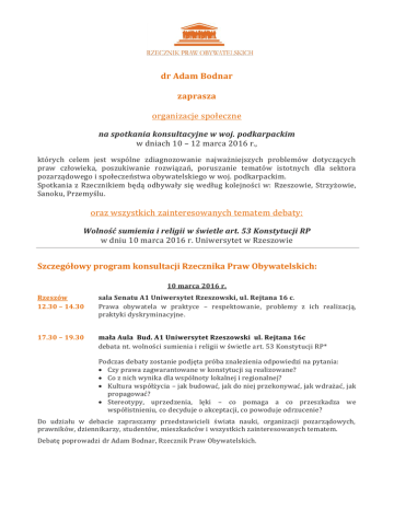 dr Adam Bodnar zaprasza organizacje społeczne na spotkania konsultacyjne w woj. podkarpackim w dniach 10 – 12 marca 2016 r., których celem jest wspólne zdiagnozowanie najważniejszych problemów dotyczących praw człowieka, poszukiwanie rozwiązań, poruszanie tematów istotnych dla sektora pozarządowego i społeczeństwa obywatelskiego w woj. podkarpackim. Spotkania z Rzecznikiem będą odbywały się według kolejności w: Rzeszowie, Strzyżowie, Sanoku, Przemyślu. oraz wszystkich zainteresowanych tematem debaty: Wolność sumienia i religii w świetle art. 53 Konstytucji RP w dniu 10 marca 2016 r. Uniwersytet w Rzeszowie Szczegółowy program konsultacji Rzecznika Praw Obywatelskich: 10 marca 2016 r. Rzeszów 12.30 – 14.30 sala Senatu A1 Uniwersytet Rzeszowski, ul. Rejtana 16 c. Prawa obywatela w praktyce – respektowanie, problemy z ich realizacją, praktyki dyskryminacyjne. 17.30 – 19.30 mała Aula Bud. A1 Uniwersytet Rzeszowski ul. Rejtana 16c debata nt. wolności sumienia i religii w świetle art. 53 Konstytucji RP* Podczas debaty zostanie podjęta próba znalezienia odpowiedzi na pytania:  Czy prawa zagwarantowane w konstytucji są realizowane?  Co z nich wynika dla wspólnoty lokalnej i regionalnej?  Kultura współżycia – jak budować, jak do niej przekonywać, jak wdrażać, jak propagować?  Stereotypy, uprzedzenia, lęki – co pomaga a co przeszkadza we współistnieniu, co decyduje o akceptacji, co powoduje odrzucenie? Do udziału w debacie zapraszamy przedstawicieli świata nauki, organizacji pozarządowych, prawników, dziennikarzy, studentów, mieszkańców i wszystkich zainteresowanych tematem. Debatę poprowadzi dr Adam Bodnar, Rzecznik Praw Obywatelskich. 11 marca 2016 r. Strzyżów sala nr 8 w Urzędzie Miejskim w Strzyżowie ul. Przecławczyka 5 9.00 – 11.00 Sanok 13.00 – 15.00 Prawa obywatela w praktyce – respektowanie, problemy z ich realizacją, praktyki dyskryminacyjne. Miejska Biblioteka Publiczna w Sanoku ul. Lenartowicza 2 Aktywność obywatelska, partycypacja, kondycja sektora społecznych. organizacji 12 marca 2016 r. Przemyśl Przemyska Biblioteka Publiczna Budynek A, sala wielofunkcyjna (I piętro), ul. Grodzka 8 10.00 – 12.00 Prawa obywatela w praktyce – respektowanie, problemy z ich realizacją, praktyki dyskryminacyjne. *Art. 53 Konstytucji RP: 1. Każdemu zapewnia się wolność sumienia i religii. 2. Wolność religii obejmuje wolność wyznawania lub przyjmowania religii według własnego wyboru oraz uzewnętrzniania indywidualnie lub z innymi, publicznie lub prywatnie, swojej religii przez uprawianie kultu, modlitwę, uczestniczenie w obrzędach, praktykowanie i nauczanie. Wolność religii obejmuje także posiadanie świątyń i innych miejsc kultu w zależności od potrzeb ludzi wierzących oraz prawo osób do korzystania z pomocy religijnej tam, gdzie się znajdują. 3. Rodzice mają prawo do zapewnienia dzieciom wychowania i nauczania moralnego i religijnego zgodnie ze swoimi przekonaniami. Przepis art. 48 ust. 1 stosuje się odpowiednio. 4. Religia kościoła lub innego związku wyznaniowego o uregulowanej sytuacji prawnej może by ć przedmiotem nauczania w szkole, przy czym nie może być naruszona wolność sumienia i religii innych osób. 5. Wolność uzewnętrzniania religii może być ograniczona jedynie w drodze ustawy i tylko wtedy, gdy jest to konieczne do ochrony bezpieczeństwa państwa, porządku publicznego, zdrowia, moralności lub wolności i praw innych osób. 6. Nikt nie może być zmuszany do uczestniczenia ani do nieuczestniczenia w praktykach religijnych. 7. Nikt nie może być obowiązany przez organy władzy publicznej do ujawnienia swojego światopoglądu, przekonań religijnych lub wyznania. Zgłoszenie uczestnictwa w wybranych spotkaniach (można wziąć udział w więcej niż jednym) należy dokonać poprzez formularz zgłoszeniowy na stronie: www.spotkaniaregionalne.rpo.gov.pl Przesłanie formularza zgłoszeniowego jest równoznaczne z zarejestrowaniem uczestnika. Nie wysyłamy potwierdzeń przyjęcia zgłoszenia. Wszelkie pytania prosimy kierować pod adres: [email protected] ZAPRASZAMY