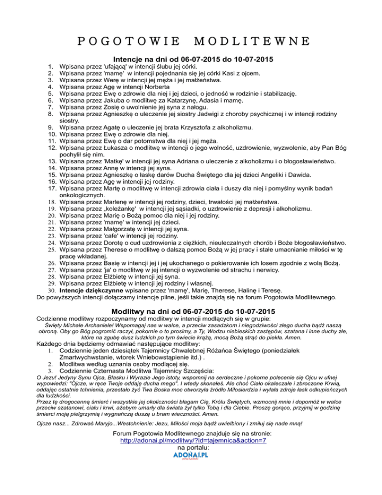 POGOTOWIE MODLITEWNE Intencje na dni od 06-07-2015 do 10-07-2015 1. 2. 3. 4. 5. 6. 7. 8. Wpisana przez 'ufającą' w intencji ślubu jej córki. Wpisana przez 'mamę' w intencji pojednania się jej córki Kasi z ojcem. Wpisana przez Werę w intencji jej męża i jej małżeństwa. Wpisana przez Agę w intencji Norberta Wpisana przez Ewę o zdrowie dla niej i jej dzieci, o jedność w rodzinie i stabilizację. Wpisana przez Jakuba o modlitwę za Katarzynę, Adasia i mamę. Wpisana przez Zosię o uwolnienie jej syna z nałogu. Wpisana przez Agnieszkę o uleczenie jej siostry Jadwigi z choroby psychicznej i w intencji rodziny siostry. 9. Wpisana przez Agatę o uleczenie jej brata Krzysztofa z alkoholizmu. 10. Wpisana przez Ewę o zdrowie dla niej. 11. Wpisana przez Ewę o dar potomstwa dla niej i jej męża. 12. Wpisana przez Łukasza o modlitwę w intencji o jego wolność, uzdrowienie, wyzwolenie, aby Pan Bóg pochylił się nim. 13. Wpisana przez 'Matkę' w intencji jej syna Adriana o uleczenie z alkoholizmu i o błogosławieństwo. 14. Wpisana przez Annę w intencji jej syna. 15. Wpisana przez Agnieszkę o łaskę darów Ducha Świętego dla jej dzieci Angeliki i Dawida. 16. Wpisana przez Agę w intencji jej rodziny. 17. Wpisana przez Martę o modlitwę w intencji zdrowia ciała i duszy dla niej i pomyślny wynik badań onkologicznych. 18. Wpisana przez Marlenę w intencji jej rodziny, dzieci, trwałości jej małżeństwa. 19. Wpisana przez „koleżankę' w intencji jej sąsiadki, o uzdrowienie z depresji i alkoholizmu. 20. Wpisana przez Marię o Bożą pomoc dla niej i jej rodziny. 21. Wpisana przez 'mamę' w intencji jej dzieci. 22. Wpisana przez Małgorzatę w intencji jej syna. 23. Wpisana przez 'cafe' w intencji jej rodziny. 24. Wpisana przez Dorotę o cud uzdrowienia z ciężkich, nieuleczalnych chorób i Boże błogosławieństwo. 25. Wpisana przez Therese o modlitwę o dalszą pomoc Bożą w jej pracy i stałe umacnianie miłości w tę pracę wkładanej. 26. Wpisana przez Basię w intencji jej i jej ukochanego o pokierowanie ich losem zgodnie z wolą Bożą. 27. Wpisana przez 'ja' o modlitwę w jej intencji o wyzwolenie od strachu i nerwicy. 28. Wpisana przez Elżbietę w intencji jej syna. 29. Wpisana przez Elżbietę w intencji jej rodziny i własnej. 30. Intencje dziękczynne wpisane przez 'mamę', Marię, Therese, Halinę i Teresę. Do powyższych intencji dołączamy intencje pilne, jeśli takie znajdą się na forum Pogotowia Modlitewnego. Modlitwy na dni od 06-07-2015 do 10-07-2015 Codzienne modlitwy rozpoczynamy od modlitwy w intencji modlących się w grupie: Święty Michale Archaniele! Wspomagaj nas w walce, a przeciw zasadzkom i niegodziwości złego ducha bądź naszą obroną. Oby go Bóg pogromić raczył, pokornie o to prosimy, a Ty, Wodzu niebieskich zastępów, szatana i inne duchy złe, które na zgubę dusz ludzkich po tym świecie krążą, mocą Bożą strąć do piekła. Amen. Każdego dnia będziemy odmawiać następujące modlitwy: 1. Codziennie jeden dziesiątek Tajemnicy Chwalebnej Różańca Świętego (poniedziałek Zmartwychwstanie, wtorek Wniebowstąpienie itd.) . 2. Modlitwa według uznania osoby modlącej się. 3. Codziennie Czternasta Modlitwa Tajemnicy Szczęścia: O Jezu! Jedyny Synu Ojca, Blasku i Wyrazie Jego istoty, wspomnij na serdeczne i pokorne polecenie się Ojcu w ufnej wypowiedzi: "Ojcze, w ręce Twoje oddaję ducha mego". I wtedy skonałeś. Ale choć Ciało okaleczałe i zbroczone Krwią, oddając ostatnie tchnienia, przestało żyć Twa Boska moc otworzyła źródło Miłosierdzia i wylała zdroje łask odkupieńczych dla ludzkości. Przez tę drogocenną śmierć i wszystkie jej okoliczności błagam Cię, Królu Świętych, wzmocnij mnie i dopomóż w walce przeciw szatanowi, ciału i krwi, ażebym umarły dla świata żył tylko Tobą i dla Ciebie. Proszę gorąco, przyjmij w godzinę śmierci moją pielgrzymią i wygnańczą duszę u bram wieczności. Amen. Ojcze nasz... Zdrowaś Maryjo...Westchnienie: Jezu, Miłości moja bądź uwielbiony i zmiłuj się nade mną! Forum Pogotowia Modlitewnego znajduje się na stronie: http://adonai.pl/modlitwy/?id=tajemnica&action=7 na portalu: Podgrupa modląca się w intencjach przyszłych mam i dzieci nienarodzonych Intencje na dni od 06-07-2015 do 10-07-2015 1. W intencji dzieci nienarodzonych ( zabijanych w łonach matek). 2. W intencji rodziców, których przerosło rodzicielstwo i nie radzą emocjonalnie z zaistniałą sytuacją i poprzez to 3. 4. krzywdzą swoje dzieci, a czasami z tego powodu dochodzi do tragedii. Panie Boże pomóż im i dodaj im siły w codziennych trudach macierzyństwa i spraw, żeby docenili jak wielki dar otrzymali od Ciebie - cud nowego życia. W intencji Ani o cud macierzyństwa. W intencji małżeństw mających problem z poczęciem dziecka. Modlitwa na dni od 06-07-2015 do 10-07-2015 RÓŻANIEC DO MATKI BOŻEJ MIŁOSIERDZIA Codziennie jeden dziesiątek Tajemnicy Radosnej do Matki Bożej Miłosierdzia (poniedziałek Zwiastowanie, wtorek Nawiedzenie Św. Elżbiety itd.) CZĘŚĆ RADOSNA 1. Zwiastowanie Maryi, iż jest Matką Syna Bożego. "Duch św. zstąpi na Ciebie i moc najwyższego osłoni Cię. Dlatego też Święte, które się narodzi, będzie nazwane Synem Bożym" (Łk.1,35). Cały świat zastygł przy Twoich ustach wyczekując ufnego "fiat"... "Maryjo, dotrzymał Bóg swego słowa, Ty w sobie Je nosi, bo Ten co włada wszechświatem, w Twym czystym łonie spoczywa"). Najmilsza Matko, dziękuję Ci za Twoje "tak" - ono przyniosło ludziom Zbawiciela świata. 2. Nawiedzenie świętej Elżbiety. " A skądże mi to, że matka mojego Pana przychodzi do mnie?" (Łk. 1,43) Maryjo, cała jesteś przepełniona miłością; Zawsze pojawiasz się tam, gdzie inni wyczekują pomocy. Przenikasz swym wejrzeniem wnętrze każdego człowieka, który znajduje się w potrzebie - a czynisz to z wielkim miłosierdziem, które uczy nas służebnego działania i wrażli