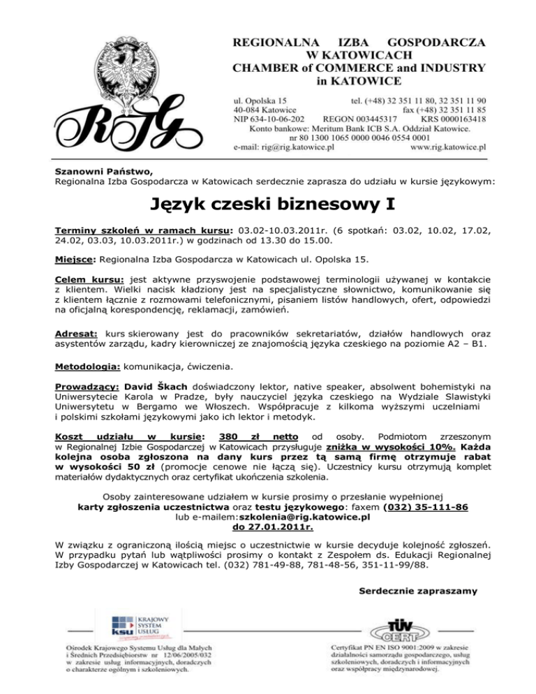 Szanowni Państwo, Regionalna Izba Gospodarcza w Katowicach serdecznie zaprasza do udziału w kursie językowym: Język czeski biznesowy I Terminy szkoleń w ramach kursu: 03.02-10.03.2011r. (6 spotkań: 03.02, 10.02, 17.02, 24.02, 03.03, 10.03.2011r.) w godzinach od 13.30 do 15.00. Miejsce: Regionalna Izba Gospodarcza w Katowicach ul. Opolska 15. Celem kursu: jest aktywne przyswojenie podstawowej terminologii używanej w kontakcie z klientem. Wielki nacisk kładziony jest na specjalistyczne słownictwo, komunikowanie się z klientem łącznie z rozmowami telefonicznymi, pisaniem listów handlowych, ofert, odpowiedzi na oficjalną korespondencję, reklamacji, zamówień. Adresat: kurs skierowany jest do pracowników sekretariatów, działów handlowych oraz asystentów zarządu, kadry kierowniczej ze znajomością języka czeskiego na poziomie A2 – B1. Metodologia: komunikacja, ćwiczenia. Prowadzący: David Škach doświadczony lektor, native speaker, absolwent bohemistyki na Uniwersytecie Karola w Pradze, były nauczyciel języka czeskiego na Wydziale Slawistyki Uniwersytetu w Bergamo we Włoszech. Współpracuje z kilkoma wyższymi uczelniami i polskimi szkołami językowymi jako ich lektor i metodyk. Koszt udziału w kursie: 380 zł netto od osoby. Podmiotom zrzeszonym w Regionalnej Izbie Gospodarczej w Katowicach przysługuje zniżka w wysokości 10%. Każda kolejna osoba zgłoszona na dany kurs przez tą samą firmę otrzymuje rabat w wysokości 50 zł (promocje cenowe nie łączą się). Uczestnicy kursu otrzymują komplet materiałów dydaktycznych oraz certyfikat ukończenia szkolenia. Osoby zainteresowane udziałem w kursie prosimy o przesłanie wypełnionej karty zgłoszenia uczestnictwa oraz testu językowego: faxem (032) 35-111-86 lub e-mailem:[email protected] do 27.01.2011r. W związku z ograniczoną ilością miejsc o uczestnictwie w kursie decyduje kolejność zgłoszeń. W przypadku pytań lub wątpliwości prosimy o kontakt z Zespołem ds. Edukacji Regionalnej Izby Gospodarczej w Katowicach tel. (032) 781-49-88, 781-48-56, 351-11-99/88. Serdecznie zapraszamy PROGRAM KURSU „Język czeski biznesowy I” 1. Umiejętności językowe potrzebne w pracy w kontakcie z czeskim klientem 2. Pisemne korespondencja administracyjna - listy, maile 3. Użyteczne słownictwo 4. Zaznajomienie z różnicami między językiem mówionym (hovorová čeština) a pisanym 5. Słownictwo tematyczne 6. Telefonowanie 7. Zaznajomienie z podstawami czeskiej stylistyki (wiadomość, formalny styl, życiorys, list urzędowy, list motywacyjny, protokół z zebrania) 8. Gramatyka i wymowa w zależności od potrzeb indywidualnych 9. Ćwiczenia na rozumienie ze słuchu przekazywanie i zostawianie wiadomości; 10. Ćwiczenie przydatnej gramatyki na poziomie B1 11. Pisanie Uprzejmie informujemy, iż każdy zdeklarowany uczestnik kursu może przesłać do prowadzącego pytania oraz kwestie budzące zainteresowanie do dnia 27.01.2011r. na numer faxu: (032) 351-11-86 lub e-mailem: [email protected] W trakcie kursu uzyskają Państwo odpowiedzi na nurtujące Państwa pytania. *Kurs realizujemy także w formie zamkniętej na indywidualne zlecenie klienta*