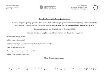 UNIA EUROPEJSKA PROGRAM OPERACYJNY POMOC ŻYWNOŚCIOWA 2014 – 2020 EUROPEJSKI FUNDUSZ POMOCY NAJBARDZIEJ POTRZEBUJĄCYM Ośrodek Pomocy Społecznej w Siewierzu w ramach Programu Operacyjnego Pomoc Żywnościowa 2014-2020 Europejskiego Funduszu Pomocy Najbardziej Potrzebującym FEAD realizowanego w Podprogramie 2015 organizuje Warsztaty dietetyczne cz. II, „Nie marnuj jedzenia i wartości odżywczych” Spotkanie odbędzie się dnia 20 października 2015r., o godz. 10.00. Warsztaty odbędą się w Urzędzie Miasta i Gminy Siewierz przy ulicy Żwirki i Wigury 16. W programie między innymi: Jak nie marnować żywności? Jak kupować rozsądnie, by unikać marnowania i jak gotować „z resztek”? Jak przechowywać jedzenie? Proste wykorzystywanie pozostałej żywności. Jak nie tracić wartości odżywczych? Chętnych serdecznie zapraszamy! Program współfinansowany jest ze środków Unii Europejskiej w ramach Europejskiego Funduszu Pomocy Najbardziej Potrzebującym.