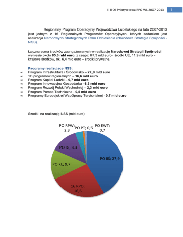 I i II Oś Priorytetowa RPO WL 2007-2013 2007 Regionalny Program Operacyjny Województwa Lubelskiego na lata 2007-2013 2007 jest jednym z 16 Regionalnych Programów Operacyjnych,, których zadaniem jest realizacja Narodowych Strategicznych Ram Odniesienia (Narodowa Strategia Spójności Spójno NSS). Łączna suma środków zaangaŜowanych w realizację Narodowej owej Strategii Spójności Spójno wyniesie około 85,6 mld euro, z czego: 67,3 mld euro- środki UE, 11,9 mld euro krajowe środków, ok. 6,4 mld euro – środki prywatne. • • • • • • • Programy realizujące NSS: Program Infrastruktura i Środowisko – 27,9 mld euro 16 programów regionalnych – 16,6 mld euro Program Kapitał Ludzki – 9,7 mld euro Program Innowacyjna Gospodarka –8,3 mld euro Program Rozwój Polski Wschodniej – 2,3 mld euro Program Pomoc Techniczna - 0,5 mld euro Programy Europejskiej Współpracy Terytorialnej - 0,7 mld euro Środki na realizację NSS (mld euro): PO RPW; PO EWT; PO PT; 0,5 2,3 0,7 PO IG; 8,3 PO IiŚ; 27,9 PO KL; 9,7 16 RPO; 16,6 1 I i II Oś Priorytetowa RPO WL 2007-2013 Regionalny Program Operacyjny Województwa Lubelskiego na lata 2007-21013 Cel główny: Podniesienie konkurencyjności Lubelszczyzny prowadzące do szybszego wzrostu gospodarczego oraz zwiększenia zatrudnienia z uwzględnieniem walorów naturalnych i kulturowych regionu Cele szczegółowe: Zwiększenie konkurencyjności regionu poprzez wsparcie rozwoju sektorów nowoczesnej gospodarki oraz przez stymulowanie innowacyjności Poprawa warunków inwestowania w województwie z poszanowaniem zasady zrównowaŜonego rozwoju Zwiększenie atrakcyjności Lubelszczyzny jako miejsca do zamieszkania, pracy i wypoczynku Środki finansowe: 1 636,77 mld euro, z czego: • 1 155,85 mld euro środki z Europejskiego Funduszu Rozwoju Regionalnego • 276,94 mld euro - środki prywatne • 203,97 mld euro - krajowe środki publiczne Instytucja zarządzająca: Zarząd Województwa Lubelskiego Instytucja Pośrednicząca II Stopnia we wdraŜaniu I i II Osi Priorytetowej RPO WL 2007-2013:: Lubelska Agencja Wspierania Przedsiębiorczości w Lublinie Osie Priorytetowe: Oś Priorytetowa I. II. III. Przedsiębiorczość i innowacje Infrastruktura ekonomiczna Atrakcyjność obszarów miejskich i tereny inwestycyjne IV. V. VI. VII. Społeczeństwo informacyjne Transport Środowisko i czysta energia Kultura, turystyka i współpraca międzyregionalna VIII. IX Infrastruktura społeczna Pomoc techniczna Ogółem: Środki EFRR mln euro 242,73 75,13 69,35 % 21 6,5 6 57,79 260,07 156,04 109,81 5 22,5 13,5 9,5 152,57 32,36 1 155,85 13,2 2,8 2 I i II Oś Priorytetowa RPO WL 2007-2013 2007 Realizacja celów szczegółowych RPO WL poprzez poszczególne priorytety RPO WL 2002-2013 OŚ PRIORYTETOWA I: PRZEDSIĘBIORCZO BIORCZOŚĆ I INNOWACJE 1.1. 1.2. 1.3. 1.4. 1.5. 1.6. 1.7. Dotacje dla nowopowstałych mikroprzedsiębiorstw mikroprzedsię Dotacje inwestycyjne dla mikroprzedsiębiorstw ębiorstw Dotacje inwestycyjne dla małych i średnich rednich przedsiębiorstw Dotacje inwestycyjne w zakresie dostosowania przedsiębiorstw do wymogów ochrony środowiska oraz w zakresie odnawialnych źródeł energii Dotacje inwestycyjne w dziedzinie turystyki Badania i nowoczesne technologie w strategicznych dla regionu dziedzinach Wzrost konkurencyjności przedsiębiorstw biorstw przez doradztwo. 3 I i II Oś Priorytetowa RPO WL 2007-2013 1.1. Dotacje dla nowopowstałych mikroprzedsiębiorstw Cel: Zwiększenie zdolności inwestycyjnej w początkowym okresie funkcjonowania mikroprzedsiębiorstw realizujących projekty na terenie województwa lubelskiego. Działanie ukierunkowane jest na zwiększenie konkurencyjności nowych mikroprzedsiębiorstw poprzez wyposaŜenie w nowoczesny sprzęt i technologie. Preferowane będą projekty uwzględniające rozwiązania innowacyjne Przykładowe rodzaje projektów: • • • wyposaŜenie niezbędne do prowadzenia i rozwoju działalności gospodarczej lub modernizacji środków produkcji prowadzące do zwiększenia zdolności inwestycyjnej i innowacyjności przedsiębiorstwa dywersyfikacja produkcji zakładu poprzez jego rozbudowę celem wprowadzenia nowych produktów/usług zasadnicza zmiana dotycząca procesu produkcyjnego istniejącego zakładu, rozbudowa przedsiębiorstwa (produkcyjnego/usługowego) Typ beneficjentów: Mikroprzedsiębiorstwa: przedsiębiorstwa zatrudniające mniej niŜ 10 osób, których obroty roczne i/lub roczna suma bilansowa nie przekracza 2 mln EUR (zgodnie z definicją w rozporządzeniu Komisji (WE) nr 364/2004 z dnia 25 lutego 2004 r. zmieniającego rozporządzenie (WE) nr 70/2001 i rozszerzającego jego zakres w celu włączenia pomocy dla badań i rozwoju). Ponadto mikroprzedsiębiorstwa ubiegające się o wsparcie muszą spełniać następujące warunki: - będą realizować projekt na terenie województwa lubelskiego - rozpoczęły działalność gospodarczą (dzień uzyskania wpisu do ewidencji działalności gospodarczej lub wpisu do rejestru przedsiębiorców) nie wcześniej niŜ 24 miesiące przed dniem złoŜenia wniosku Minimalna/Maksymalna wartość wsparcia: Minimalna wartość wsparcia wynosi 25 tys. PLN Maksymalna wartość wsparcia wynosi 500 tys. PLN 4 I i II Oś Priorytetowa RPO WL 2007-2013 Minimalna/Maksymalna wartość projektu: Minimalna wartość projektu wynosi 36 tys. PLN Maksymalna wartość projektu nie moŜe przekroczyć 8 mln PLN 1.2. Dotacje inwestycyjne dla mikroprzedsiębiorstw Cel: Poprawa konkurencyjności mikroprzedsiębiorstw prowadzących działalność gospodarczą dłuŜej niŜ 2 lata, realizujących innowacyjne projekty inwestycyjne na terenie województwa lubelskiego. Priorytetowo traktowane będą projekty przyczyniające się do utrzymania lub wzrostu zatrudnienia, jak równieŜ preferowane będą przedsięwzięcia innowacyjne w obszarach wskazanych w Regionalnej Strategii Innowacji. Przykładowe rodzaje projektów: • wyposaŜenie niezbędne do prowad