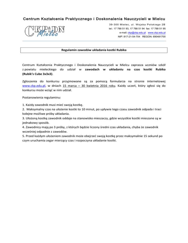 Centrum Kształcenia Praktycznego i Doskonalenia Nauczycieli w Mielcu 39-300 Mielec, ul. Wojska Polskiego 2B tel.: 17 788 51 93, 17 788 51 94 fax: 17 788 51 95 e-mail: [email protected] www.ckp.edu.pl NIP: 817-21-54-704 REGON: 690481700 Regulamin zawodów układania kostki Rubika Centrum Kształcenia Praktycznego i Doskonalenia Nauczycieli w Mielcu zaprasza uczniów szkół z powiatu mieleckiego do udział w zawodach w układaniu na czas kostki Rubika (Rubik’s Cube 3x3x3). Zgłoszenia do konkursu przyjmowane są za pomocą formularza na stronie internetowej www.ckp.edu.pl, w dniach 15 marca – 30 kwietnia 2016 roku. Każdy uczeń, który zgłosi się do konkursu może wziąć w nim udział. Postanowienia regulaminu: 1. Każdy zawodnik musi mieć swoją kostkę. 2. Maksymalny czas na ułożenie kostki to 10 minut, po upływie tego czasu zawodnik odpada i traci kolejne możliwe próby układania. 3. Ułożoną kostkę zawodnik oddaje na stanowisko mieszaczy, gdzie wszystkie kostki mieszane są w jednakowy sposób. 4. Zawodnicy mają po 3 próby, z których będzie liczony średni czas układania, chyba że zawodnik wcześniej odpadnie z zawodów. 5. Przed każdym ułożeniem zawodnik może obejrzeć swoją kostkę przez maksymalnie 15 sekund po czym uruchamia zegar mierzący czas i rozpoczyna układanie kostki.
