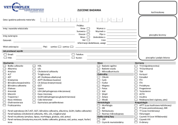 ZLECENIE BADANIA Data i godzina pobrania materiału D D M M R R Imię zwierzęcia Gatunek: Płeć: samiec G G : M M pieczątka lecznicy samica Jak przekazać wyniki Email: FAX: Biochemia Białko całkowite Albuminy Amylaza ALT AST Kreatynina Bilirubina bezpośrednia Bilirubina całkowita Glukoza Amoniak Mocznik Troponina I Kwas mlekowy Cholinoesteraza Fruktozamina R Próbka: Krew Wymaz z: Surowica Wycinek z: Osocze Płyn z: Mocz Zeskrobina z: Kał Inne Informacje dodatkowe, uwagi Imię i nazwisko właściciela Wiek zwierzęcia: R kod kreskowy Telefon: Kurier: HDL LDL Cholesterol całkowity Trójglicerydy AP ( fosfataza alkaliczna) ACPT (fosfataza kwaśna) CK (kinaza kreatyninowa) GGT Lipaza LDH (dehydrogenaza mleczanowa) Kwas moczowy GLDH (dehydrogenaza glutaminianowa) Ciała ketonowe Dysmutaza ponadtlenkowa Panel wątrobowy (ALT,AST, GGT, bilirubina całkowita, albumina, GLDH, białko całkowite) Panel lipidowy (cholesterol całkowity, HDL, LDL, trójglicerydy) Panel trzustkowy (amylaza, lipaza, morfologia, glukoza, sód, potas) Panel nerkowy (kreatynina,mocznik, białko całkowite, glukoza, sód, potas, wapń, fosfor) Inne: Mocz Badanie ogólne Badanie osadu Mikroalbuminuria Elektrolity Chlorki Cynk Fosfor Magnez Potas Sód Wapń Żelazo Miedź Hematologia Morfologia OB Retikulocyty Rozmaz mikroskopowy Białka ostrej fazy CRP Czynnik reumatoidalny pieczątka i podpis lekarza kikikieru Hormony T3 (trójjodotyronina) T4 (tyroksyna) TSH Kortyzol Estradiol fT3 fT4 Prolaktyna Progesteron Testosteron ACTH Insulina Relaksyna (test ciążowy, pies) Koagulologia APTT (czas kaolinowo-kefalinowy) PT (czas protrombinowy), INR TT (czas trombinowy) Fibrynogen Czynnik VII (von Willebranda) Czynnik VIII D-dimery Płyny ustrojowe Płyn mózgowo-rdzeniowy (badanie ogólne) Płyn mózgowo-rdzeniowy (badanie mikrobiologiczne) Kał Rotavirus – antygen (IC) Giardia spp. – antygen (IC) Parvovirus – antygen (IC) Test na krew utajoną Clostridium difficile – enterotoksyna Clostridium perfringens – enterotoksyna Badanie w kierunku pasożytów (m. mikroskopowa) Badanie w kierunku pasożytów (m. flotacyjna) Stopień strawienia Płyn z jam ciała (badanie ogólne) Próba Rivalta Płyn z jam ciała (badanie mikrobiologiczne) Mikrobiologia Badanie wymazu (bakterie) Badanie mikrobiologiczne – OLD Badanie wymazu (grzyby drożdżopodobne) Badanie mikrobiologiczne jaj Posiew krwi tlenowy Badanie mikrobiologiczne mleka Posiew krwi beztlenowy Badanie mikrobiologiczne wody Badanie w kierunku dermatofitów Badanie mikrobiologiczne nasion Badanie w kierunku Campylobacter spp. Wymazy czystościowe Badanie w kierunku Salmonella spp. Antybiogram Badanie w kierunku Yersinia spp. Mykogram Badanie w kierunku Staphylococcus aureus Identyfikacja szczepu bakteryjnego (API) Badanie ściółki w kierunku Salmonella spp. Sporal A Badanie ściółki w kierunku grzybów pleśniowych Sporal S Badanie mikrobiologiczne paszy (Salmonella spp., Staphylococcus spp., Clostridium spp., Enterobacteriaceae spp.) MIC (minimalne stężenie antybiotyku hamujące wzrost drobnoustroju) Inne VetComplex sp. z o.o. ul. Częstochowska 38/52 93-121 Łódź Tel. 42 298 55 40 Fax. 42 298 55 37 [email protected]
