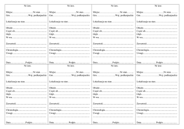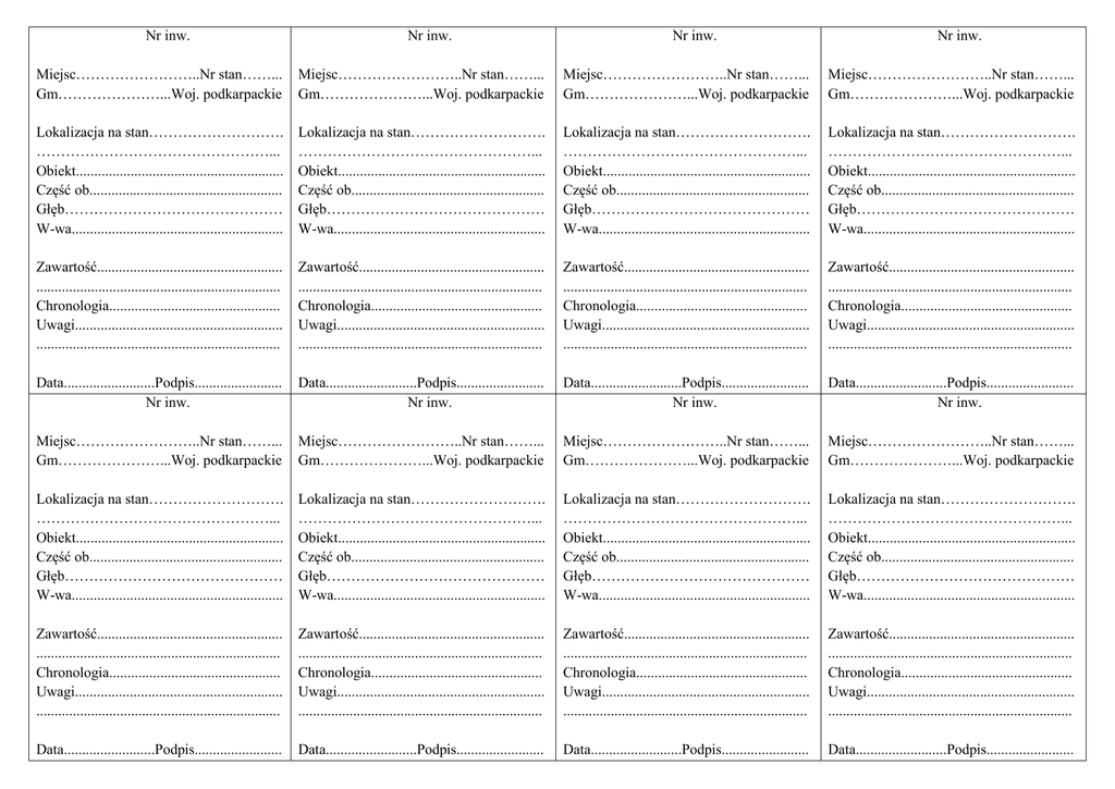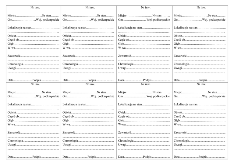 Nr inw. Nr inw. Nr inw. Nr inw. Miejsc……………………..Nr stan……... Gm…………………...Woj. podkarpackie Miejsc……………………..Nr stan……... Gm…………………...Woj. podkarpackie Miejsc……………………..Nr stan……... Gm…………………...Woj. podkarpackie Miejsc……………………..Nr stan……... Gm…………………...Woj. podkarpackie Lokalizacja na stan………………………. …………………………………………... Obiekt......................................................... Część ob..................................................... Głęb……………………………………… W-wa.......................................................... Lokalizacja na stan………………………. …………………………………………... Obiekt......................................................... Część ob..................................................... Głęb……………………………………… W-wa.......................................................... Lokalizacja na stan………………………. …………………………………………... Obiekt......................................................... Część ob..................................................... Głęb……………………………………… W-wa.......................................................... Lokalizacja na stan………………………. …………………………………………... Obiekt......................................................... Część ob..................................................... Głęb……………………………………… W-wa.......................................................... Zawartość................................................... ................................................................... Chronologia............................................... Uwagi......................................................... ................................................................... Zawartość................................................... ................................................................... Chronologia............................................... Uwagi......................................................... ................................................................... Zawartość................................................... ................................................................... Chronologia............................................... Uwagi......................................................... ................................................................... Zawartość................................................... ................................................................... Chronologia............................................... Uwagi......................................................... ................................................................... Data.........................Podpis........................ Nr inw. Data.........................Podpis........................ Nr inw. Data.........................Podpis........................ Nr inw. Data.........................Podpis........................ Nr inw. Miejsc……………………..Nr stan……... Gm…………………...Woj. podkarpackie Miejsc……………………..Nr stan……... Gm…………………...Woj. podkarpackie Miejsc……………………..Nr stan……... Gm…………………...Woj. podkarpackie Miejsc……………………..Nr stan……... Gm…………………...Woj. podkarpackie Lokalizacja na stan………………………. …………………………………………... Obiekt......................................................... Część ob..................................................... Głęb……………………………………… W-wa.......................................................... Lokalizacja na stan………………………. …………………………………………... Obiekt......................................................... Część ob..................................................... Głęb……………………………………… W-wa.......................................................... Lokalizacja na stan………………………. …………………………………………... Obiekt......................................................... Część ob..................................................... Głęb……………………………………… W-wa.......................................................... Lokalizacja na stan………………………. …………………………………………... Obiekt......................................................... Część ob..................................................... Głęb……………………………………… W-wa.......................................................... Zawartość................................................... ................................................................... Chronologia............................................... Uwagi......................................................... ................................................................... Zawartość................................................... ................................................................... Chronologia............................................... Uwagi......................................................... ................................................................... Zawartość................................................... ................................................................... Chronologia............................................... Uwagi......................................................... .....................