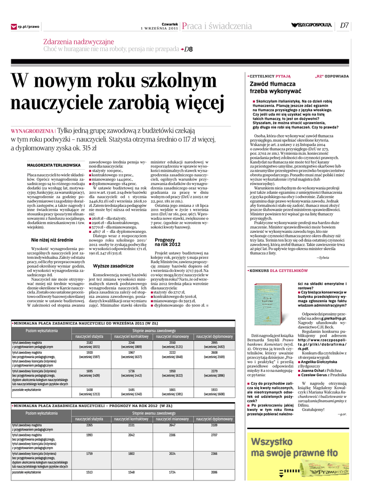Czwartek ◊ rp.pl/prawo 1 września 2011 Praca i świadczenia D7 Zdarzenia nadzwyczajne Choć w huraganie nie ma roboty, pensja nie przepada >D8 W nowym roku szkolnym nauczyciele zarobią więcej WYNAGRODZENIA | Tylko jedną grupę zawodową z budżetówki czekają w tym roku podwyżki – nauczycieli. Stażysta otrzyma średnio o 117 zł więcej, a dyplomowany zyska ok. 315 zł MAŁGORZATA TERLIKOWSKA Płaca nauczycieli to wiele składników. Oprócz wynagrodzenia zasadniczego są to różnego rodzaju dodatki (za wysługę lat, motywacyjny, funkcyjny, za warunki pracy), wynagrodzenie za godziny ponadwymiarowe i za godziny doraźnych zastępstw, a także nagrody i inne świadczenia wynikające ze stosunku pracy (poza tymi sfinansowanymi z funduszu socjalnego, dodatkiem mieszkaniowym i tzw. wiejskim). Nie niżej niż średnie Wysokość wynagrodzenia poszczególnych nauczycieli jest zatem indywidualna. Zależy od stażu pracy, od liczby przepracowanych ponad określony wymiar godzin, od wysokości wynagrodzenia zasadniczego itd. Nauczyciel nie może otrzymywać mniej niż średnie wynagrodzenie określone w Karcie nauczyciela. Zostało ono ustalone procentowo od kwoty bazowej określanej corocznie w ustawie budżetowej. W zależności od stopnia awansu zawodowego średnia pensja wynosi dla nauczyciela: ∑ stażysty 100 proc., ∑ kontraktowego 111 proc., ∑ mianowanego 144 proc., ∑ dyplomowanego 184 proc. W ustawie budżetowej na rok 2011 w art. 13 ust. 2 są dwie bazówki dla nauczycieli: od 1 stycznia 2446,82 zł i od 1 września 2618,10 zł. Zatem średnia płaca pedagogów nie może być niższa od września niż: ∑ 2618 zł – dla stażysty, ∑ 2906 zł – dla kontraktowego, ∑ 3770 zł – dla mianowanego, ∑ 4817 zł – dla dyplomowanego. Dlatego wraz z rozpoczęciem nowego roku szkolnego 2011/ 2012 osoby te zyskają podwyżkę w wysokości odpowiednio: 171 zł, 190 zł, 247 zł i 315 zł. Wyższe zasadnicze Konsekwencją nowej bazówki jest też zmiana wysokości minimalnych stawek podstawowego wynagrodzenia nauczycieli. Ich płaca zasadnicza zależy od stopnia awansu zawodowego, posiadanych kwalifikacji oraz wymiaru zajęć. Minimalne stawki określa minister edukacji narodowej w rozporządzeniu w sprawie wysokości minimalnych stawek wynagrodzenia zasadniczego nauczycieli, ogólnych warunków przyznawania dodatków do wynagrodzenia zasadniczego oraz wynagradzania za pracę w dniu wolnym od pracy (DzU z 2005 r. nr 22, poz. 181 ze zm.). Ostatnia jego zmiana z 18 lipca 2011 wejdzie w życie 1 września 2011 (DzU nr 161, poz. 967). Wprowadza nowe stawki, zwiększone o 7 proc. (zgodnie ze wzrostem wysokości kwoty bazowej). Prognozy na rok 2012 Projekt ustawy budżetowej na kolejny rok, przyjęty 5 maja przez Radę Ministrów, zawiera propozycję zmiany bazówki dopiero od 1 września do kwoty 2717,59 zł. Na co więc mogą liczyć nauczyciele w przyszłym roku? Na to, że od września 2012 średnia płaca wzrośnie dla nauczyciela: ∑ stażysty do 2717 zł, ∑ kontraktowego do 3016 zł, ∑ mianowanego do 3913 zł, ∑ dyplomowanego do 5000 zł. ∑ > CZYTELNICY PYTAJĄ Zawód tłumacza trzeba wykonywać ∑ Skończyłam italianistykę. Na co dzień robię tłumaczenia. Planuję jeszcze zdać egzamin na tłumacza przysięgłego z języka włoskiego. Czy jeśli uda mi się uzyskać wpis na listę takich tłumaczy, to jest on dożywotni? Słyszałam, że można stracić uprawnienia, gdy długo nie robi się tłumaczeń. Czy to prawda? Osoba, która chce wykonywać zawód tłumacza przysięgłego, musi spełniać określone kryteria. Wskazuje je art. 2 ustawy z 25 listopada 2004 o zawodzie tłumacza przysięgłego (DzU nr 273, poz. 2702 ze zm.). Wymienia m.in. konieczność posiadania pełnej zdolności do czynności prawnych. Kandydat na tłumacza nie może też być karany za przestępstwo umyślne, przestępstwo skarbowe lub za nieumyślne przestępstwo przeciwko bezpieczeństwu obrotu gospodarczego. Ponadto musi znać polski i mieć wyższe wykształcenie i tytuł magistra (lub równorzędny). Warunkiem niezbędnym do wykonywania profesji jest także zdanie egzaminu z umiejętności tłumaczenia z języka polskiego na obcy i odwrotnie. Zaliczenie egzaminu daje prawo wykonywania zawodu. Jednak aby formalności stało się zadość, tłumacz musi złożyć jeszcze ślubowanie przed ministrem sprawiedliwości. Minister powinien też wpisać go na listę tłumaczy przysięgłych. Praktyczne wykonywanie profesji ma bardzo duże znaczenie. Minister sprawiedliwości może bowiem zawiesić w wykonywaniu zawodu tego, kto nie wykonuje czynności tłumacza przez okres dłuższy niż trzy lata. Termin ten liczy się od dnia ostatniej czynności zawodowej, którą zrobił tłumacz. Takie zawieszenie trwa aż pięć lat. Po upływie tego okresu minister skreśla tłumacza z listy. —Sylwia > KONKURS DLA CZYTELNIKÓW ści na skład ki eme ry tal ne i rentowe? ∑ Czy bieżąca konserwacja w bu dyn ku przed się biorcy wy ma ga zgło sze nia te go faktu wła dzom ad mi ni stra cyj nym? >MINIMALNA PŁACA ZASADNICZA NAUCZYCIELI OD WRZEŚNIA 2011 (W ZŁ) Poziom wykształcenia nauczyciel stażysta tytuł zawodowy magistra z przygotowaniem pedagogicznym tytuł zawodowy magistra bez przygotowania pedagogicznego, tytuł zawodowy licencjata (inżyniera) z przygotowaniem pedagogicznym tytuł zawodowy licencjata (inżyniera) bez przygotowania pedagogicznego, dyplom ukończenia kolegium nauczycielskiego lub nauczycielskiego kolegium języków obcych pozostałe wykształcenie Stopnie awansu zawodowego nauczyciel kontraktowy nauczyciel mianowany nauczyciel dyplomowany 2182 (wcześniej 1815) 1920 (wcześniej 1597) 2246 (wcześniej 1869) 1967 (wcześniej 1637) 2550 (wcześniej 2121) 2222 (wcześniej 1848) 2995 (wcześniej 2492) 2608 (wcześniej 2169) 1695 (wcześniej 1409) 1736 (wcześniej 1443) 1950 (wcześniej 1622) 2279 (wcześniej 1896) 1458 (wcześniej 1213) 1491 (wcześniej 1240) 1661 (wcze