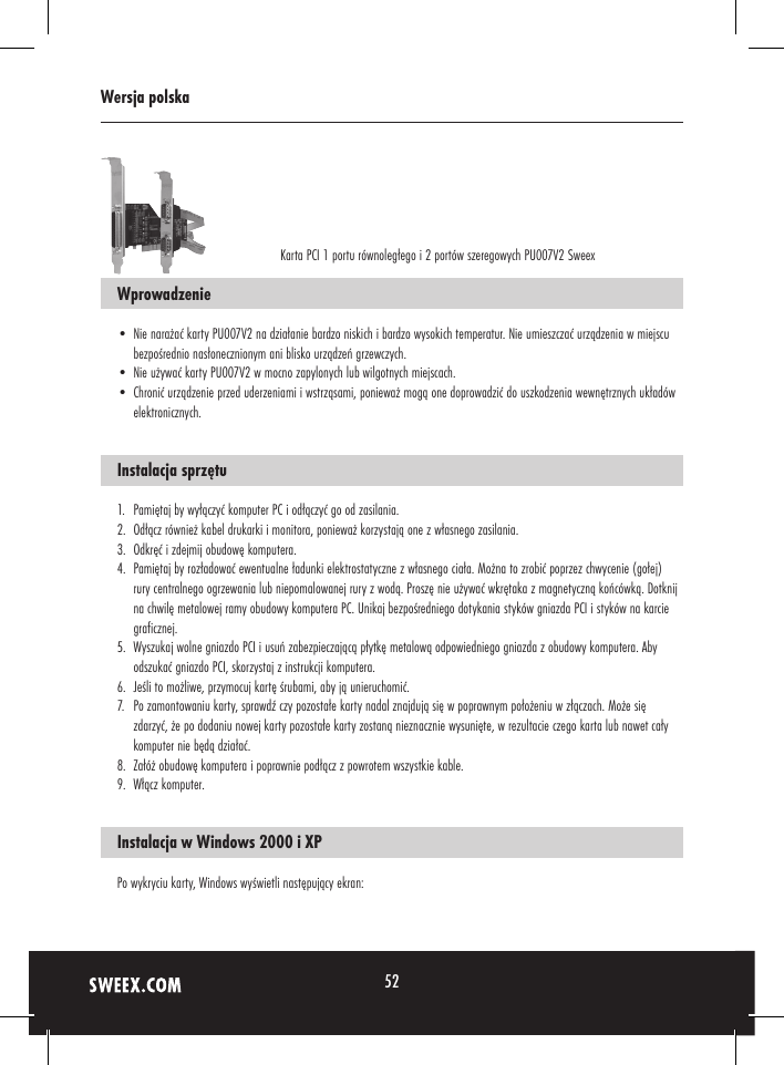 Wersja polska Karta PCI 1 portu równoległego i 2 portów szeregowych PU007V2 Sweex Wprowadzenie • Nie narażać karty PU007V2 na działanie bardzo niskich i bardzo wysokich temperatur. Nie umieszczać urządzenia w miejscu bezpośrednio nasłonecznionym ani blisko urządzeń grzewczych. • Nie używać karty PU007V2 w mocno zapylonych lub wilgotnych miejscach. • Chronić urządzenie przed uderzeniami i wstrząsami, ponieważ mogą one doprowadzić do uszkodzenia wewnętrznych układów elektronicznych. Instalacja sprzętu 1. 2. 3. 4. 5. 6. 7. 8. 9. Pamiętaj by wyłączyć komputer PC i odłączyć go od zasilania. Odłącz również kabel drukarki i monitora, ponieważ korzystają one z własnego zasilania. Odkręć i zdejmij obudowę komputera. Pamiętaj by rozładować ewentualne ładunki elektrostatyczne z własnego ciała. Można to zrobić poprzez chwycenie (gołej) rury centralnego ogrzewania lub niepomalowanej rury z wodą. Proszę nie używać wkrętaka z magnetyczną końcówką. Dotknij na chwilę metalowej ramy obudowy komputera PC. Unikaj bezpośredniego dotykania styków gniazda PCI i styków na karcie graficznej. Wyszukaj wolne gniazdo PCI i usuń zabezpieczającą płytkę metalową odpowiedniego gniazda z obudowy komputera. Aby odszukać gniazdo PCI, skorzystaj z instrukcji komputera. Jeśli to możliwe, przymocuj kartę śrubami, aby ją unieruchomić. Po zamontowaniu karty, sprawdź czy pozostałe karty nadal znajdują się w poprawnym położeniu w złączach. Może się zdarzyć, że po dodaniu nowej karty pozostałe karty zostaną nieznacznie wysunięte, w rezultacie czego karta lub nawet cały komputer nie będą działać. Załóż obudowę komputera i poprawnie podłącz z powrotem wszystkie kable. Włącz komputer. Instalacja w Windows 2000 i XP Po wykryciu karty, Windows wyświetli następujący ekran: 52 Wersja polska Kliknij ”Cancel” (Anuluj). Włóż płytę Sweex CD-ROM do napędu CD-ROM komputera. Płyta uruchomi się automatycznie. Wybierz instalację sterowników i kontynuuj instalację. Kliknij “Install” (Zainstaluj), aby rozpocząć instalację. Możliwe, że Windows wyświetli informację o braku certyfikatu sterownika. Nie stanowi to przeszkody w poprawnym działaniu karty. Wszystkie produkty Sweex i ich sterowniki są dokładnie sprawdzane. Wybierz opcję “Continue Anyway” (Kontynuuj mimo tego). Aby zakończyć, naciśnij “Exit” (Wyjdź). Po zainstalowaniu sterowników pojawi się okno przedstawione poniżej. Jeśli okno nie pojawi się automatycznie, uruchom komputer ponownie. 53 Wersja polska Wybierz opcję “No, not this time” (Nie, nie tym razem) i naciśnij “Next” (Dalej). Wybierz “Install the software automatically” (Zainstaluj oprogramowanie automatycznie) i kliknij “Next” (Dalej). Postępuj zgodnie z wyświetlanymi następnie instrukcjami, aby zakończyć instalację. Wybierz “Install the software automatically” (Zainstaluj oprogramowanie automatycznie) i kliknij “Next” (Dalej). Postępuj zgodnie z wyświetlanymi następnie instrukcjami, aby zakończyć instalację. Wymagane może być dwukrotne potwierdzenie ostatniego okna. Instalacja pod Windows Vista Po wykryciu karty, Windows wyświetli następujący ekran: 54 Wersja polska Kliknij ”Cancel” (Anuluj). Włóż płytę Sweex CD-ROM do napędu CD-ROM komputera. Płyta uruchomi się automatycznie. Wybierz instalację sterowników i kontynuuj instalację. Kliknij “Install” (Zainstaluj), aby rozpocząć instalację. Możliwe, że Windows wyświetli informację o braku certyfikatu sterownika. Nie stanowi to przeszkody w poprawnym działaniu karty. Wszystkie produkty Sweex i ich sterowniki są dokładnie sprawdzane. Wybierz opcję “Continue Anyway” (Kontynuuj mimo tego). Kliknij “Exit” (Wyjdź), aby zakończyć instalację i uruchomić komputer ponownie. Ustawienia portu równoległego Ustawienia portu LPT można wyświetlić i dostosować postępując zgodnie z opisem poniżej: Przejdź do START -> settings (ustawienia)-> control panel (panel sterowania) W tym oknie otwórz “System”. Przejdź do zakładki “Hardware” (Sprzęt) -> “device manager” (Menedżer urządzeń). W oknie menedżera urządzeń rozwiń listę “Ports (COM & LPT)” (Porty COM i LPT) i wybierz: Sweex 1 Port Parallel PCI Card Kliknij nazwę karty prawym przyciskiem myszy, aby otworzyć okno ustawień. 55 Wersja polska Pojawi się następujący ekran: Wybierz zakładkę “Port settings” (Ustawienia portu). Tutaj można wyświetlić lub zmienić port LPT komputera. Uważaj by nie wybrać portu, który już jest używany przez komputer. Można to spowodować powstanie konfliktu sprzętowego. Ustawienia portu szeregowego Ustawienia portów COM można wyświetlić i dostosować postępując zgodnie z opisem poniżej: Przejdź do START -> settings (ustawienia)-> control panel (panel sterowania) W tym oknie otwórz “System”. Przejdź do zakładki “Hardware” (Sprzęt) -> “device manager” (Menedżer urządzeń). W oknie menedżera urządzeń rozwiń listę “Ports (COM & LPT)” (Porty COM i LPT) i wybierz: PU007V2 Sweex 2 Port Serial (COMxx) Kliknij nazwę karty prawym przyciskiem myszy, aby otworzyć okno ustawień. Pojawi się następujący ekran: Wybierz zakładkę “Port settings” (Ustawienia portu) i kliknij “Advanced…” (Zaawansowane). Wybierz zakładkę “Port settings” (Ustawienia portu) i kliknij “Advanced…” (Zaawansowane). 56 Wersja polska Tutaj można wyświetlić lub zmienić port COM komputera. Uważaj by nie wybrać portu, który już jest używany przez komputer. Można to spowodować powstanie konfliktu sprzętowego. Ten produkt nie obsługuje wszystkich kluczy sprzętowych. Gwarancja Większość produktów Sweex jest objęta trzyletnią gwarancją. Karty graficzne i produkty elektroniki użytkowej są objęte dwuletnią gwarancją. Nie zapewniamy wsparcia technicznego ani gwarancji obejmującej dołączone opr