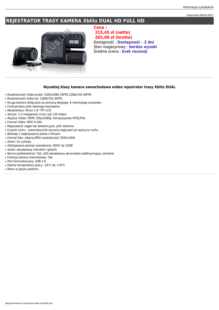 Informacje o produkcie Utworzono 08-03-2017 REJESTRATOR TRASY KAMERA Xblitz DUAL HD FULL HD Cena : 215,45 zł (netto) 265,00 zł (brutto) Dostępność : Dostępność - 3 dni Stan magazynowy : bardzo wysoki Średnia ocena : brak recenzji Wysokiej klasy kamera samochodowa wideo rejestrator trasy Xblitz DUAL ● ● ● ● ● ● ● ● ● ● ● ● ● ● ● ● ● ● ● ● Rozdzielczość Video przód: 1920x1080 25FPS,1280x720 30FPS Rozdzielczość Video tył: 1280x720 30FPS Druga kamera dołączana za pomocą długiego, 6 metrowego przewodu Funkcjonalny pilot zdalnego sterowania Wyświetlacz: Ekran 2.4" TFT LCD Sensor: 1.2-megapixeli cmos, kąt 120 stopni Wyjście Video: HDMI 720p/1080p, Kompozytowe NTSC/PAL Format Video: MOV H.264 Nagrywanie ciągłe lub sekwencyjne, pliki dzielone Czujnik ruchu - automatycznie zaczyna nagrywać po wykryciu ruchu Blokada / nadpisywanie pików z filmami Format foto: zdjęcia JPEG rozdzielczość 2592x1944 Zoom: 4x cyfrowy Obsługiwana pamięć zewnętrzna: SDHC do 32GB Audio: wbudowany mikrofon i głośnik Nocne podświetlenie: Tak, LED wbudowany akumulator podtrzymujący zasilanie Funkcja kamery internetowej: Tak Port komunikacyjny: USB 2.0 Zakres temperatury pracy: -20°C do +70°C Menu w języku polskim. Wygenerowano w programie www.oscGold.com