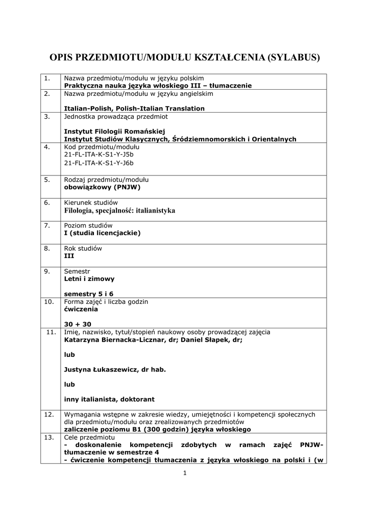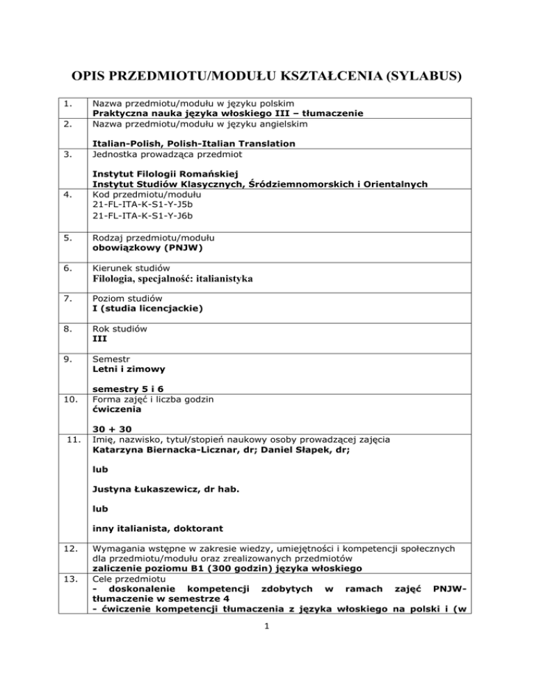 OPIS PRZEDMIOTU/MODUŁU KSZTAŁCENIA (SYLABUS) 1. 2. Nazwa przedmiotu/modułu w języku polskim Praktyczna nauka języka włoskiego III – tłumaczenie Nazwa przedmiotu/modułu w języku angielskim 3. Italian-Polish, Polish-Italian Translation Jednostka prowadząca przedmiot 4. Instytut Filologii Romańskiej Instytut Studiów Klasycznych, Śródziemnomorskich i Orientalnych Kod przedmiotu/modułu 21-FL-ITA-K-S1-Y-J5b 21-FL-ITA-K-S1-Y-J6b 5. Rodzaj przedmiotu/modułu obowiązkowy (PNJW) 6. Kierunek studiów Filologia, specjalność: italianistyka 7. Poziom studiów I (studia licencjackie) 8. Rok studiów III 9. Semestr Letni i zimowy 10. 11. semestry 5 i 6 Forma zajęć i liczba godzin ćwiczenia 30 + 30 Imię, nazwisko, tytuł/stopień naukowy osoby prowadzącej zajęcia Katarzyna Biernacka-Licznar, dr; Daniel Słapek, dr; lub Justyna Łukaszewicz, dr hab. lub inny italianista, doktorant 12. 13. Wymagania wstępne w zakresie wiedzy, umiejętności i kompetencji społecznych dla przedmiotu/modułu oraz zrealizowanych przedmiotów zaliczenie poziomu B1 (300 godzin) języka włoskiego Cele przedmiotu - doskonalenie kompetencji zdobytych w ramach zajęć PNJWtłumaczenie w semestrze 4 - ćwiczenie kompetencji tłumaczenia z języka włoskiego na polski i (w 1 mniejszym zakresie) z polskiego na włoski - zapoznanie studentów z podstawami przekładoznawstwa - ukazanie tłumaczenia jako złożonego aktu komunikacji - doskonalenie kompetencji językowych w zakresie języka włoskiego i polskiego - wstępne zapoznanie ze specyfiką pracy tłumacza przysięgłego Po zakończeniu cyklu zajęć (w sumie 90 godz.) student powinien wykazywać się zwiększoną dbałością o jakość językową i merytoryczną sporządzanych przez siebie tekstów pisemnych języku polskim i włoskim), kreatywnie poszukiwać rozwiązań problemów przekładowych, charakteryzować się krytyczną postawą w stosunku do przekładu (własnego i cudzego) oraz przekonaniem o konieczności stałego podnoszenia swoich kompetencji wobec złożoności zadań stojących przed tłumaczem oraz roli tłumacza jako pośrednika między kulturami. 14. Zakładane efekty kształcenia Symbole kierunkowych efektów kształcenia Student zna podstawową terminologię przekładoznawstwa z zakresu K_W02 zna podstawowe źródła wiedzy tłumacza i sposoby dotarcia do informacji K_W03 ma świadomość konieczności doskonalenia sprawności językowej w języku polskim K_W05 potrafi dokonać analizy tekstów w języku włoskim, rozpoznając różne jego rejestry; zauważa interferencje językowe i inne błędy w tekście przekładu; potrafi analizować niektóre problemy przekładowe i proponować rozwiązania K_U02 potrafi samodzielnie zdobywać zakresie przekładoznawstwa K-U03 wiedzę w potrafi, stosując odpowiednie narzędzia, strategie i techniki, tłumaczyć pisemnie wybrane typy prostych, krótkich tekstów z języka włoskiego na polski umie organizować swoją pracę, dostosować się do zaleceń i terminowo wykonywać powierzone zadania 2 K_U09 K_K03 ma świadomość znaczenia zasad etyki zawodowej i uczciwości intelektualnej, w tym zasad odnoszących się do prawa autorskiego w działaniach własnych i innych osób, postępuje zgodnie z tymi zasadami 15. K_K04 K_K05 Treści programowe - analiza tekstu do tłumaczenia: rozpoznawanie zjawisk językowych, odmian funkcjonalnych języka obcego występujących w tekście i występujących w nim odniesień do zjawisk kulturowych - identyfikacja i opis trudności językowych, merytorycznych, kulturowych i innych związanych z tłumaczeniem tekstu - wyszukiwanie dokumentacji potrzebnej do przetłumaczenia tekstu - tłumaczenie tekstu z zastosowaniem właściwych technik przekładu, w odpowiednim do sytuacji komunikacyjnej stylu, z wykorzystaniem odpowiednich technik informatycznych - etapy i organizacja procesu tłumaczenia - tłumaczenie podczas zajęć, przygotowanie do radzenia sobie w naturalnych warunkach i do pracy pod presją czasu - porównywanie oryginału i przekładu: analiza i klasyfikacja błędów, technik i strategii - wstępna informacja o specyfice pracy tłumacza przysięgłego; analiza przykładów tłumaczeń poświadczonych Zajęcia odbywają się w oparciu o wybór tekstów zaproponowanych przez wykładowcę i (w przypadku niektórych zadań) przez studentów. Dominujący typ tekstów (np. popularnonaukowe, techniczne, urzędowe, literackie) ustala prowadzący zajęcia. 16. Zalecana literatura Umberto Eco, Dire quasi la stessa cosa. Esperienza di traduzione, Bompiani, Milano 2003. Krzysztof Hejwowski, Kognitywno-komunikacyjna teoria przekładu, PWN, Warszawa 2004. Andrzej Voellnagel, Jak nie tłumaczyć tekstów technicznych, wyd. 4 popr. i rozsz., Wydawnictwo TEPIS, Warszawa 1998. Raccolta di documenti italiani, a cura di Teresa Skrodzka, Wydawnictwo Translegis, Warszawa 2008. Katarzyna Biernacka-Licznar, Ewa Żuchowska, Egzamin na tłumacza przysięgłego. Zbiór dokumentów włoskich, Wydawnictwo C.H. Beck, Warszawa 2012. Katarzyna Biernacka-Licznar, Ewa Żuchowska, Egzamin na tłumacza przysięgłego. Finanse i księgowość - zbiór dokumentów. Język włoski, Wydawnictwo C.H. Beck, Warszawa 2013. 3 Italica Wratislaviensia I: Między egzotyką a swojskością. O tłumaczeniu literatury włoskiej na język polski i polskiej na włoski, pod red. K. Biernackiej-Licznar i J. Łukaszewicz, 2010. Słowniki jedno- i dwujęzyczne Inne pozycje wskazane przez prowadzącego zajęcia. 17. Forma zaliczenia poszczególnych komponentów przedmiotu/modułu, sposób sprawdzenia osiągnięcia zamierzonych efektów kształcenia - tłumaczenia sporządzane w domu - indywidualne i grupowe (ocenie podlega tekst tłumaczenia oraz komentarz np. w formie słownika przekładu z uzasadnieniem dokonanych wyborów translatorskich); - tłumaczenia sporządzane w czasie zajęć (ocenie podlega tekst tłumaczenia, uzasadnienie wyboru ekwiwalentów, udział w dyskusji); - analiza przetłumaczon