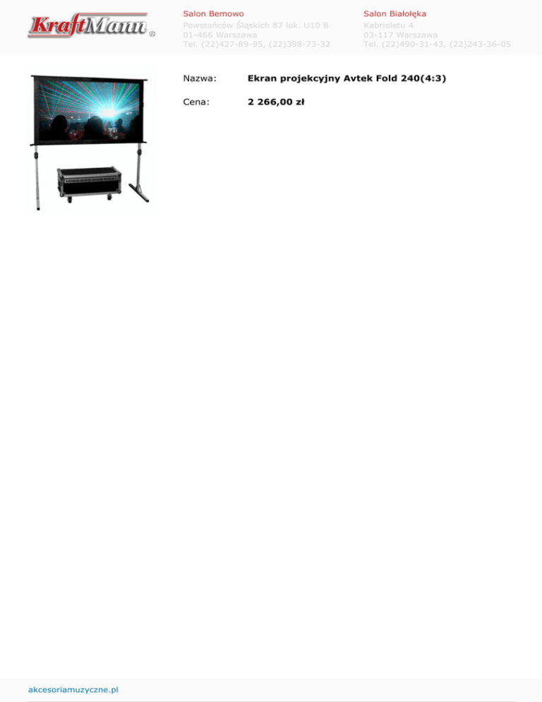 akcesoriamuzyczne.pl Salon Bemowo Salon Białołęka Powstańców Śląskich 87 lok. U10 B 01-466 Warszawa Tel. (22)427-89-95, (22)398-73-32 Kabrioletu 4 03-117 Warszawa Tel. (22)490-31-43, (22)243-36-05 Nazwa: Ekran projekcyjny Avtek Fold 240(4:3) Cena: 2 266,00 zł