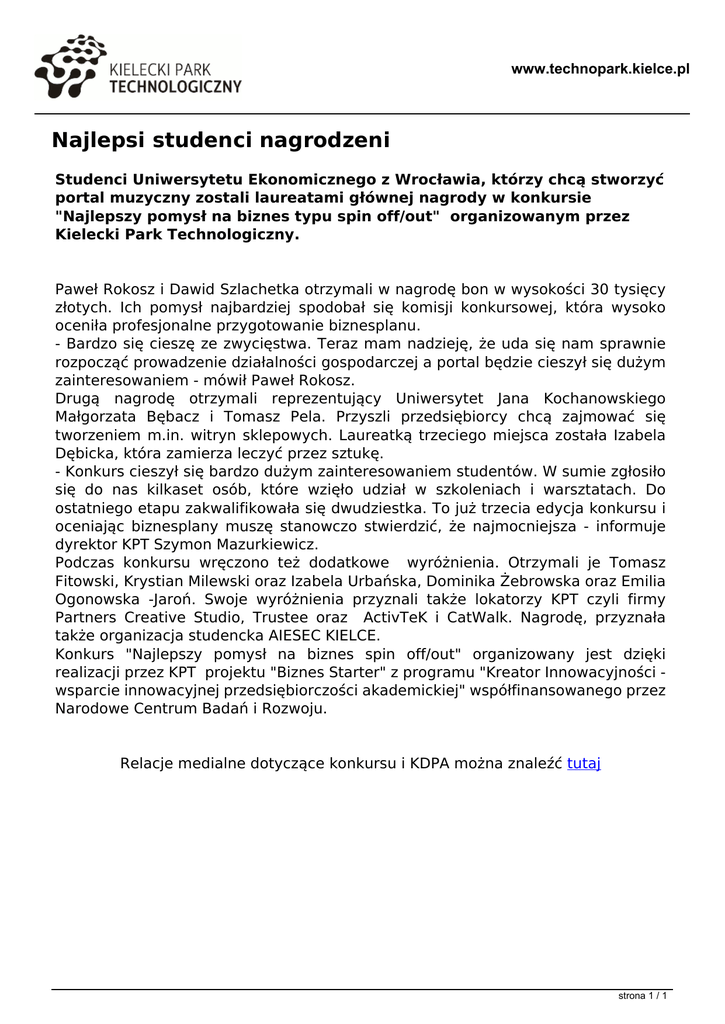 www.technopark.kielce.pl Najlepsi studenci nagrodzeni Studenci Uniwersytetu Ekonomicznego z Wrocławia, którzy chcą stworzyć portal muzyczny zostali laureatami głównej nagrody w konkursie "Najlepszy pomysł na biznes typu spin off/out" organizowanym przez Kielecki Park Technologiczny. Paweł Rokosz i Dawid Szlachetka otrzymali w nagrodę bon w wysokości 30 tysięcy złotych. Ich pomysł najbardziej spodobał się komisji konkursowej, która wysoko oceniła profesjonalne przygotowanie biznesplanu. - Bardzo się cieszę ze zwycięstwa. Teraz mam nadzieję, że uda się nam sprawnie rozpocząć prowadzenie działalności gospodarczej a portal będzie cieszył się dużym zainteresowaniem - mówił Paweł Rokosz. Drugą nagrodę otrzymali reprezentujący Uniwersytet Jana Kochanowskiego Małgorzata Bębacz i Tomasz Pela. Przyszli przedsiębiorcy chcą zajmować się tworzeniem m.in. witryn sklepowych. Laureatką trzeciego miejsca została Izabela Dębicka, która zamierza leczyć przez sztukę. - Konkurs cieszył się bardzo dużym zainteresowaniem studentów. W sumie zgłosiło się do nas kilkaset osób, które wzięło udział w szkoleniach i warsztatach. Do ostatniego etapu zakwalifikowała się dwudziestka. To już trzecia edycja konkursu i oceniając biznesplany muszę stanowczo stwierdzić, że najmocniejsza - informuje dyrektor KPT Szymon Mazurkiewicz. Podczas konkursu wręczono też dodatkowe wyróżnienia. Otrzymali je Tomasz Fitowski, Krystian Milewski oraz Izabela Urbańska, Dominika Żebrowska oraz Emilia Ogonowska -Jaroń. Swoje wyróżnienia przyznali także lokatorzy KPT czyli firmy Partners Creative Studio, Trustee oraz ActivTeK i CatWalk. Nagrodę, przyznała także organizacja studencka AIESEC KIELCE. Konkurs "Najlepszy pomysł na biznes spin off/out" organizowany jest dzięki realizacji przez KPT projektu "Biznes Starter" z programu "Kreator Innowacyjności wsparcie innowacyjnej przedsiębiorczości akademickiej" współfinansowanego przez Narodowe Centrum Badań i Rozwoju. Relacje medialne dotyczące konkursu i KDPA można znaleźć tutaj strona 1 / 1 Powered by TCPDF (www.tcpdf.org)