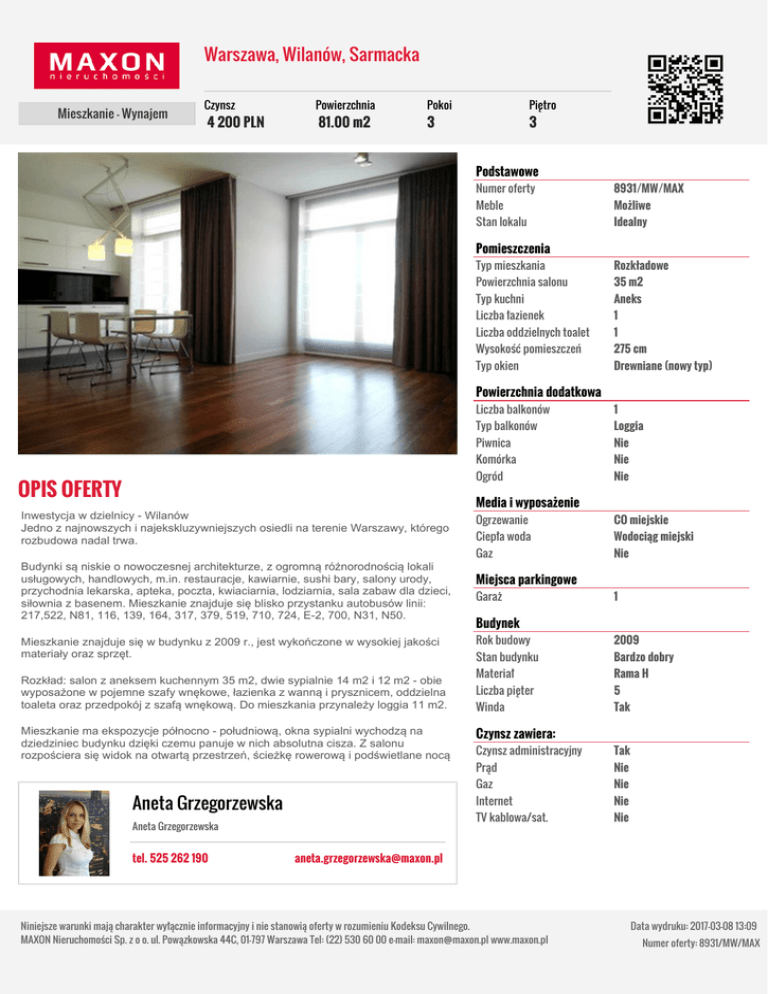 Warszawa, Wilanów, Sarmacka Mieszkanie - Wynajem Czynsz 4 200 PLN Powierzchnia 81.00 m2 Pokoi Piętro 3 3 Podstawowe Numer oferty 8931/MW/MAX Meble Możliwe Stan lokalu Idealny Pomieszczenia Typ mieszkania Rozkładowe Powierzchnia salonu 35 m2 Typ kuchni Aneks Liczba łazienek 1 Liczba oddzielnych toalet 1 Wysokość pomieszczeń 275 cm Typ okien Drewniane (nowy typ) Powierzchnia dodatkowa OPIS OFERTY Inwestycja w dzielnicy - Wilanów Jedno z najnowszych i najekskluzywniejszych osiedli na terenie Warszawy, którego rozbudowa nadal trwa. Budynki są niskie o nowoczesnej architekturze, z ogromną różnorodnością lokali usługowych, handlowych, m.in. restauracje, kawiarnie, sushi bary, salony urody, przychodnia lekarska, apteka, poczta, kwiaciarnia, lodziarnia, sala zabaw dla dzieci, siłownia z basenem. Mieszkanie znajduje się blisko przystanku autobusów linii: 217,522, N81, 116, 139, 164, 317, 379, 519, 710, 724, E-2, 700, N31, N50. Mieszkanie znajduje się w budynku z 2009 r., jest wykończone w wysokiej jakości materiały oraz sprzęt. Rozkład: salon z aneksem kuchennym 35 m2, dwie sypialnie 14 m2 i 12 m2 - obie wyposażone w pojemne szafy wnękowe, łazienka z wanną i prysznicem, oddzielna toaleta oraz przedpokój z szafą wnękową. Do mieszkania przynależy loggia 11 m2. Mieszkanie ma ekspozycje północno - południową, okna sypialni wychodzą na dziedziniec budynku dzięki czemu panuje w nich absolutna cisza. Z salonu rozpościera się widok na otwartą przestrzeń, ścieżkę rowerową i podświetlane nocą Aneta Grzegorzewska Aneta Grzegorzewska tel. 525 262 190 Liczba balkonów 1 Typ balkonów Loggia Piwnica Nie Komórka Nie Ogród Nie Media i wyposażenie Ogrzewanie CO miejskie Ciepła woda Wodociąg miejski Gaz Nie Miejsca parkingowe Garaż 1 Budynek Rok budowy 2009 Stan budynku Bardzo dobry Materiał Rama H Liczba pięter 5 Winda Tak Czynsz zawiera: Czynsz administracyjny Tak Prąd Nie Gaz Nie Internet Nie TV kablowa/sat. Nie [email protected] Niniejsze warunki mają charakter wyłącznie informacyjny i nie stanowią oferty w rozumieniu Kodeksu Cywilnego. MAXON Nieruchomości Sp. z o o. ul. Powązkowska 44C, 01-797 Warszawa Tel: (22) 530 60 00 e-mail: [email protected] www.maxon.pl Data wydruku: 2017-03-08 13:09 Numer oferty: 8931/MW/MAX