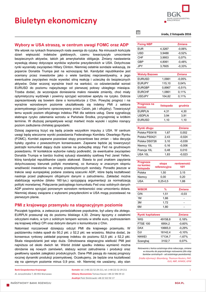 Biuletyn ekonomiczny środa, 2 listopada 2016 Wybory w USA straszą, w centrum uwagi FOMC oraz ADP Fixing NBP We wtorek na rynkach finansowych rosła awersja do ryzyka. Na minusach kończyła dzień większość indeksów giełdowych, czemu towarzyszyło umocnienie bezpiecznych aktywów, takich jak amerykańskie obligacje. Zmiany nastawienia wywołują obawy dotyczące wyników wyborów prezydenckich w USA. Dotychczas rynki wyceniały zwycięstwo Hillary Clinton. Niemniej ostatnie sondaże wskazują, że poparcie Donalda Trumpa jest na wznoszącej fali. Kandydat republikanów jest oceniany przez inwestorów jako o wiele bardziej nieprzewidywalny, a jego ewentualne zwycięstwo może wywołać silną reakcję i ucieczkę do bezpiecznych aktywów. Dolar wczoraj wyraźnie tracił na wartości, co odzwierciedlał wzrost EURUSD do poziomu najwyższego od pierwszej połowy ubiegłego miesiąca. Trzeba dodać, że wczorajsze doniesienia makro niewiele zmieniły, choć miały optymistyczny wydźwięk i powinny sprzyjać wzrostowi apetytu na ryzyko. Dobrze zaprezentowały się bowiem dane o koniunkturze z Chin. Powyżej prognoz i na wyraźnie wzrostowym poziomie ukształtowały się indeksy PMI z sektora przemysłowego (zarówno opracowywany przez Caixin, jak i oficjalny). Towarzyszył temu wysoki poziom oficjalnego indeksu PMI dla sektora usług. Dane sygnalizują słabnące ryzyko załamania wzrostu w Państwie Środka, przynajmniej w krótkim terminie. W dłuższej perspektywie wciąż martwić może wysoki i szybko rosnący poziom zadłużenia chińskiej gospodarki. EUR 4,3267 -0,06% USD 3,9488 -0,52% CHF 3,9953 0,07% GBP 4,8061 -0,48% JPY 3,7605 -0,33% Dzisiaj zagranicą liczyć się będą przede wszystkim impulsy z USA. W centrum uwagi będą wieczorne wyniki posiedzenia Federalnego Komitetu Otwartego Rynku (FOMC). Komitet zapewne pozostawi stopy procentowe bez zmian – taka decyzja byłaby zgodna z powszechnym konsensusem. Zapewne będzie jej towarzyszyć jastrzębi komunikat dający duże szanse na podwyżkę stopy Fed na grudniowym posiedzeniu. W kontekście wyborów należy podkreślić, że ewentualne zwycięstwo Donalda Trumpa w bardzo trudnej sytuacji stawiałoby szefową Fed Janet Yellen, którą kandydat republikanów często atakował. Stawia to pod znakiem zapytania dotychczasowy kierunek polityki monetarnej, co tłumaczy w znacznym stopniu wrażliwość inwestorów na zmiany przedwyborczych sondaży. Ponadto jeszcze w trakcie sesji europejskiej podane zostaną szacunki ADP, które będą kształtować nastroje przed piątkowymi oficjalnymi danymi o zatrudnieniu. Zakładać można stabilizację wyników (blisko 160 tys.) sprzyjającą argumentacji za normalizacją polityki monetarnej. Połączenie jastrzębiego komunikatu Fed oraz solidnych danych ADP powinno sprzyjać ponownym wzrostom rentowności oraz umocnieniu dolara. Niemniej obawy związane z wyborami prezydenckimi w USA mogą pozostawać na pierwszym planie. PMI z krajowego przemysłu na stagnacyjnym poziomie Początek tygodnia, a zwłaszcza poniedziałkowe popołudnie, był udany dla złotego. EURPLN przesunął się do poziomu bliskiego 4,30. Zmiany łączymy z ostatnimi odczytami makro, w tym z solidnym tempem wzrostu w strefie euro, podnoszeniem się krajowej inflacji CPI oraz dobrymi danymi o koniunkturze z Chin. Natomiast rozczarował dzisiejszy odczyt PMI dla krajowego przemysłu. W październiku indeks spadł do 50,2 pkt. z 52,2 pkt. we wrześniu. Można dodać, że konsensus rynkowy zakładał poprawę indeksu do poziomu 52,5 pkt. z 52,2 pkt. Skala niespodzianki jest więc duża. Odnotowana stagnacyjna wielkość PMI jest najniższa od około dwóch lat. Wśród źródeł spadku indeksu wymienić można obniżenie się nowych zamówień, słabszy wzrost zatrudnienia i produkcji oraz gwałtowny spadek zaległości produkcyjnych. Dane PMI pasują do naszej prognozy rocznej dynamiki produkcji przemysłowej. Oczekujemy, że będzie ona kształtować się na ujemnym poziomie minus 0,9 proc. rdr. Niemniej nie uważamy, aby stan Bank Gospodarstwa Krajowego Kontakt: tel. (+48 22) 52-29-211, tel. (+48 22) 52-29-211 Al. Jerozolimskie 7, 00-955 Warszawa Główny Ekonomista Tomasz Kaczor +48 22 596 59 13 Analityk Piotr Dmitrowski +48 22 522 92 17 Zmiana Waluty Bazowe Zmiana EURUSD 1,0981 EURJPY 115,10 0,04% EURGBP 0,8967 -0,51% EURCHF 1,0861 0,11% USDJPY 104,82 0,11% Prognoza na koniec EURPLN -0,05% listopada grudnia 4,31 4,30 USDPLN 3,94 3,91 EURUSD 1,10 1,10 Rynki długu Zmiana Polska PS0418 1,67 0,002 Polska PS0421 2,43 -0,024 Polska DS0726 3,10 -0,039 Niemcy 10L 0,16 -0,006 Francja 10L 0,48 0,010 USA 10L 1,83 -0,023 Prognoza na koniec listopada Polska stopa referencyjna rentowność 10Y 1,50 3,15 0,00 0,20 0,25-0,5 1,88 Niemcy USA WIBOR % Zmiana O/N 1,51 -0,03 1M 1,66 - 3M 1,72 - 6M 1,80 - Rynki kapitałowe Zmiana WIG 49158,8 0,18% FTSE 100 6954,2 -0,60% DAX 10665,0 -0,29% DJI 18142,4 -0,10% NIKKEI 17134,7 -1,67% Szanghaj 3102,7 0,07% Notowania z końca ostatniego dnia roboczego, zmiana w stosunku do poprzedniego notowania (dla stóp banków centralnych - od ostatniego posiedzenia). Źródła informacji: Bloomberg, Thomson Reuters, PAP, GUS, NBP, NYMEX, GPW 1 Biuletyn ekonomiczny środa, 2 listopada 2016 wyborów prezydenckich podnoszenia stopy Fed. koniunktury w krajowym przemyśle był tak zły. Trzeba podkreślić, że w minionym miesiącu mieliśmy do czynienia z silnie oddziałującym negatywnie kalendarzem. Poza mniejszą liczbą dni roboczych doszedł również efekt długiego weekendu, co wpływać mogło na wielkość indeksu. W tym kontekście warto także wspomnieć o innych publikacjach wskaźników koniunktury; choć indeksy SI (GUS) oraz ESI (KE) również obniżyły się, to jednak w mniejszej skali, a ich wielkości pozostają na solidnych poziomach. Dodatkowo perspektywy wzrostu polskiego sektora poprawiają lepsze nastroje zagranicą, zwłaszcza w strefie euro. Tak więc, w naszej ocenie z dzisiejszych
