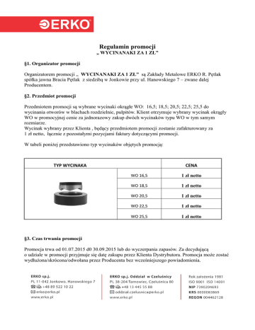 Regulamin promocji „ WYCINANAKI ZA 1 ZŁ” §1. Organizator promocji Organizatorem promocji „ WYCINANAKI ZA 1 ZŁ” są Zakłady Metalowe ERKO R. Pętlak spółka jawna Bracia Pętlak z siedzibą w Jonkowie przy ul. Hanowskiego 7 – zwane dalej Producentem. §2. Przedmiot promocji Przedmiotem promocji są wybrane wycinaki okrągłe WO: 16,5; 18,5; 20,5; 22,5; 25,5 do wycinania otworów w blachach rozdzielnic, pulpitów. Klient otrzymuje wybrany wycinak okrągły WO w promocyjnej cenie za jednorazowy zakup dwóch wycinaków typu WO w tym samym rozmiarze. Wycinak wybrany przez Klienta , będący przedmiotem promocji zostanie zafakturowany za 1 zł netto, łącznie z pozostałymi pozycjami faktury dotyczącymi promocji. W tabeli poniżej przedstawiono typ wycinaków objętych promocją: TYP WYCINAKA CENA WO 16,5 1 zł netto WO 18,5 1 zł netto WO 20,5 1 zł netto WO 22,5 1 zł netto WO 25,5 1 zł netto §3. Czas trwania promocji Promocja trwa od 01.07.2015 d0 30.09.2015 lub do wyczerpania zapasów. Za decydującą o udziale w promocji przyjmuje się datę zakupu przez Klienta Dystrybutora. Promocja może zostać wydłużona/skrócona/odwołana przez Producenta bez wcześniejszego powiadomienia. §4. Uczestnicy promocji Promocja obejmuje wszystkich Klientów Producenta oraz Klientów jego Dystrybutora, którzy podczas trwania promocji zakupią jednorazowo dwa wycinaki typu WO w tym samym rozmiarze i nie posiadają wobec niego zaległości płatniczych. §5. Warunki promocji Zakupiony promocyjnie towar nie podlega zwrotowi, ani wymianie. §6. Postanowienia końcowe Producent zastrzega sobie prawo do zmiany zasad i warunków promocji bez wcześniejszego powiadomienia. Producent nie ponosi odpowiedzialności w stosunku do żadnego Klienta za jakiekolwiek straty finansowe poniesione przez niego w wyniku odmowy, anulacji lub wycofania Promocji oraz za niewykorzystanie przez Klienta lub niemożność skorzystania z Promocji z jakichkolwiek powodów. Uczestnikom promocji nie przysługuje prawo otrzymania ekwiwalentu pieniężnego lub rzeczowego z tytułu promocji. Michał Pętlak Dyrektor Handlowy .