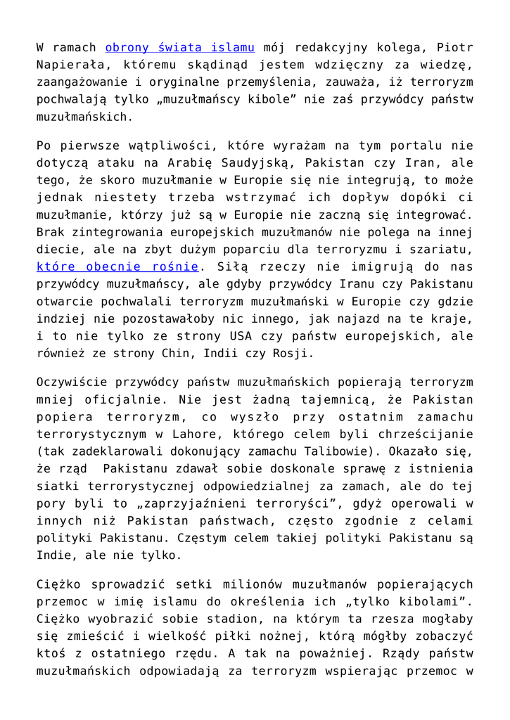 W ramach obrony świata islamu mój redakcyjny kolega, Piotr Napierała, któremu skądinąd jestem wdzięczny za wiedzę, zaangażowanie i oryginalne przemyślenia, zauważa, iż terroryzm pochwalają tylko „muzułmańscy kibole” nie zaś przywódcy państw muzułmańskich. Po pierwsze wątpliwości, które wyrażam na tym portalu nie dotyczą ataku na Arabię Saudyjską, Pakistan czy Iran, ale tego, że skoro muzułmanie w Europie się nie integrują, to może jednak niestety trzeba wstrzymać ich dopływ dopóki ci muzułmanie, którzy już są w Europie nie zaczną się integrować. Brak zintegrowania europejskich muzułmanów nie polega na innej diecie, ale na zbyt dużym poparciu dla terroryzmu i szariatu, które obecnie rośnie. Siłą rzeczy nie imigrują do nas przywódcy muzułmańscy, ale gdyby przywódcy Iranu czy Pakistanu otwarcie pochwalali terroryzm muzułmański w Europie czy gdzie indziej nie pozostawałoby nic innego, jak najazd na te kraje, i to nie tylko ze strony USA czy państw europejskich, ale również ze strony Chin, Indii czy Rosji. Oczywiście przywódcy państw muzułmańskich popierają terroryzm mniej oficjalnie. Nie jest żadną tajemnicą, że Pakistan popiera terroryzm, co wyszło przy ostatnim zamachu terrorystycznym w Lahore, którego celem byli chrześcijanie (tak zadeklarowali dokonujący zamachu Talibowie). Okazało się, że rząd Pakistanu zdawał sobie doskonale sprawę z istnienia siatki terrorystycznej odpowiedzialnej za zamach, ale do tej pory byli to „zaprzyjaźnieni terroryści”, gdyż operowali w innych niż Pakistan państwach, często zgodnie z celami polityki Pakistanu. Częstym celem takiej polityki Pakistanu są Indie, ale nie tylko. Ciężko sprowadzić setki milionów muzułmanów popierających przemoc w imię islamu do określenia ich „tylko kibolami”. Ciężko wyobrazić sobie stadion, na którym ta rzesza mogłaby się zmieścić i wielkość piłki nożnej, którą mógłby zobaczyć ktoś z ostatniego rzędu. A tak na poważniej. Rządy państw muzułmańskich odpowiadają za terroryzm wspierając przemoc w imię islamu, na przykład karę śmierci za apostazję i inne brutalne, nieludzkie i chore okrucieństwa wypływające z prawa szariatu. Nawet w słynącej z tolerancji Tunezji ogromne prześladowania zgodne z prawem mogą spotkać dziewczynę, która ośmieli się związać z niemuzułmaninem. Gdzie indziej, poza może jeszcze Turcją i Marokiem jest tylko i wyłącznie gorzej. Rządy tolerujące a nawet propagujące brutalną przemoc w imię islamu ulegają oczywiście swoim społeczeństwom. Jest to wzajemnie nakręcająca się spirala okrucieństwa, której motorem jest religia silniej niż inne dzieląca świat na wiernych i niewiernych. Czasem zdarzają się wielcy i bohaterscy idealiści, chcący tę spiralę koranicznego okrucieństwa przeciąć. Dziś jest takim bohaterem prezydent Egiptu al-Sisi, kiedyś był takim człowiekiem Ataturk w Turcji. Oczywiście przecinanie islamicznej pętli okrucieństwa wymaga działań skrajnie stanowczych. Fanatyków z Bractwa Muzułmańskiego zarówno w Egipcie, jak i w Turcji siły laickie traktowały jako niebezpiecznych zbrodniarzy, choć oczywiście bywali też mili i pokojowi Bracia Muzułmanie, którzy tylko „duchowo” odcinali się od niewiernych, a nie z pomocą brutalnej siły i nawoływania do niej. Dziedzictwem Bractwa Muzułmańskiego są al-Kaida i ISIS. Widziałem kiedyś znakomity indyjski film „Kabul Express”. Jego reżyser uczynił jednym z bohaterów Taliba, postać tragiczną. Film był szczerym obrazem Afganistanu – wśród Talibów są też mili i kochający ludzie, ale jeśli chcemy ratować innych, nie można się cofać. Wśród nazistów też byli jakoś tam sympatyczni ludzie, którzy „nie mogli inaczej, bo wszyscy byli tam”. Idealista może stwierdzić, że Sisi czy Ataturk należą/należeli do gatunku dyktatorów i łamali prawa człowieka, często prawa krwawego dżihadysty, ale nie tylko, czasem prawa osoby, która znalazła się za blisko dżihadyzmu. Ale coś trzeba wybrać, albo Fatah as – Sisi, albo Bractwo Muzułmańskie. Większość przywódców muzułmańskich nie walczy jednak z fanatyzmem swoich społeczeństw, z ich „kibolstwem” jakby chciał to nazwać Piotr, choć ja nie widziałem jednak kiboli aż tak okrutnych jak Talibowie, wojownicy Hamasu, Fatahu czy ISIS. Większość przywódców świata islamu okrucieństwo szariatu wspiera lub napędza. Od codziennego okrucieństwa prawnego jest wtedy już tylko krok do terroryzmu, do walki z heretykami i niewiernymi. Los mniejszości religijnych w świecie islamu to jakby krok pośredni pomiędzy przemocą domową a mniej lub bardziej oficjalnym wspieraniem światowego terroryzmu. Inna rzecz, że państwo hodujące terrorystów za sprawą skrajnie brutalnego szariackiego prawa walczy z innymi terrorystami, a czasem nawet z własnymi, którzy niejako „wracają rykoszetem”. Tym niemniej Arabia Saudyjska hojnie budując na całym świecie salafickie meczety wspiera agresywny, wojowniczy i krwawy islam, stając się mecenasem terrorystycznych inspiracji. Ale nie tylko Arabia Saudyjska – o Pakistanie już wspomniałem, a to tylko wierzchołek góry lodowej…