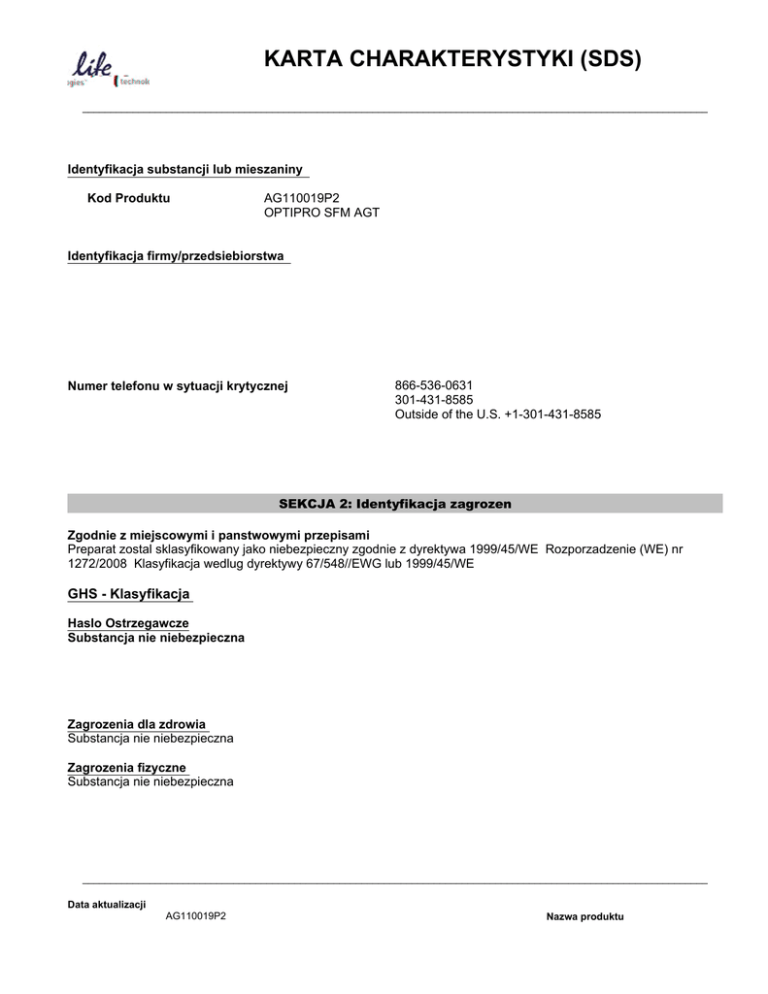 KARTA CHARAKTERYSTYKI (SDS) ________________________________________________________________________________________________________________ Identyfikacja substancji lub mieszaniny Kod Produktu AG110019P2 OPTIPRO SFM AGT Identyfikacja firmy/przedsiebiorstwa Numer telefonu w sytuacji krytycznej 866-536-0631 301-431-8585 Outside of the U.S. +1-301-431-8585 SEKCJA 2: Identyfikacja zagrozen Zgodnie z miejscowymi i panstwowymi przepisami Preparat zostal sklasyfikowany jako niebezpieczny zgodnie z dyrektywa 1999/45/WE Rozporzadzenie (WE) nr 1272/2008 Klasyfikacja wedlug dyrektywy 67/548//EWG lub 1999/45/WE GHS - Klasyfikacja Haslo Ostrzegawcze Substancja nie niebezpieczna Zagrozenia dla zdrowia Substancja nie niebezpieczna Zagrozenia fizyczne Substancja nie niebezpieczna ________________________________________________________________________________________________________________ Data aktualizacji AG110019P2 Nazwa produktu Unia Europejska Substancja nie niebezpieczna Zwroty wskazujace na szczególne zagrozenia UE R -zdanie(a) Zaden(-a,-e) Zwroty S S22 - Nie wdychac pylu Potencjalne skutki zdrowotne OCZY skóra wdychanie SPOZYCIE Moze dzialac drazniaco na oczy u osób wrazliwych. Moze dzialac drazniaco na skóre u osób wrazliwych. Moze dzialac szkodliwie przy wdychaniu. SUBSTANCJA MOZE BYC SZKODLIWA W PRZYPADKU SPOZYCIA. Dzialania szczególne Dzialania rakotwórcze DZIALANIA MUTAGENNE Toksycznosc rozrodcza Uczulenie Zaden(-a,-e) Zaden(-a,-e) Zaden(-a,-e) Zaden(-a,-e) Dzialanie na organy docelowe Brak znanych dzialan w normalnych warunkach stosowania SEKCJA 3: Sklad/informacja o skladnikach Nazwa chemiczna Sodium selenite Ammonium Metavanadate Nr CAS 10102-18-8 7803-55-6 Nr EINECS - Procent wagowy <0.00011 <0.1 Niniejszy produkt nie zawiera zadnych substancji, które w podanych stezeniach uwaza sie za niebezpieczne dla zdrowia. Zalecamy obslugi wszystkich chemikaliów z ostroznoscia. Contact with acids or bleach liberates toxic gases. DO NOT ADD acids or bleach to any liquid wastes containing this product. SEKCJA 4: Srodki pierwszej pomocy Kontakt ze skóra Kontakt z oczyma SPOZYCIE wdychanie Uwagi dla lekarza Ostroznie plukac woda przez kilka minut. W przypadku wystapienia objawów, nalezy zasiegnac porady medycznej. Bezzwlocznie przeplukiwac duza iloscia wody przez co najmniej 15 minut, takze pod powiekami. Jesli objawy nie ustepuja, wezwac lekarza. Nigdy nie podawac niczego doustnie osobie nieprzytomnej. Jesli objawy nie ustepuja, wezwac lekarza. Nie wywolywac wymiotów bez uprzedniego zasiegniecia porady medycznej. Usunac na swieze powietrze. Jesli objawy nie ustepuja, wezwac lekarza. W przypadku braku oddychania zastosowac sztuczne oddychanie. Leczyc objawowo. SEKCJA 5: Postepowanie w przypadku pozaru ________________________________________________________________________________________________________________ Data aktualizacji Kod Produktu 04-Jun-2014 AG110019P2 Strona 2 / 6 Nazwa produktu OPTIPRO SFM AGT www.lifetechnologies.com Rozpylona woda. Dwutlenek wegla (CO2). Piana. Sucha substancja chemiczna. Stosowac niezalezny aparat oddechowy oraz odziez ochronna. Odpowiednie srodki gasnicze Specjalne wyposazenie ochronne dla strazaków SEKCJA 6: Postepowanie w przypadku niezamierzonego uwolnienia do srodowiska Indywidualne srodki ostroznosci Stosowac wyposazenie ochrony indywidualnej. Zebrac mechanicznie, umiescic w odpowiednich pojemnikach w celu utylizacji. Metody usuwania Srodki ostroznosci w zakresie ochrony srodowiska O ile jest to bezpieczne, nalezy zapobiec dalszemu uwalnianiu lub wyciekaniu. Patrz: sekcja 12 po dalsze informacje. SEKCJA 7: Postepowanie z substancjami i mieszaninami oraz ich magazynowanie Unikac kontaktu ze skóra, oczami i ubraniem. Stosowac srodki ochrony osobistej. Trzymac w suchym, chlodnym i dobrze wentylowanym miejscu. Postepowanie Przechowywanie SEKCJA 8: Kontrola narazenia/srodki ochrony indywidualnej Wartosci graniczne narazenia Nazwa chemiczna Sodium selenite 10102-18-8 Ammonium Metavanadate 7803-55-6 EU OEL (TWA) Zaden(-a,-e) EU OEL (STEL) Zaden(-a,-e) EU Skin Notation Zaden(-a,-e) Zaden(-a,-e) Zaden(-a,-e) Zaden(-a,-e) Austria 0.1 mg/m3 Belgium (TWA) 0.2 mg/m3 Denmark (TWA) 0.1 mg/m3 Finland OEL (TWA) Zaden(-a,-e) Zaden(-a,-e) Zaden(-a,-e) Zaden(-a,-e) Zaden(-a,-e) Nazwa chemiczna Sodium selenite 10102-18-8 Ammonium Metavanadate 7803-55-6 France OEL (VME) Zaden(-a,-e) Germany OEL (TWA) 0.05 mg/m3 exposure factor 1 Zaden(-a,-e) Ireland (TWA) 0.1 mg/m3 Italy OEL (TWA) Zaden(-a,-e) Zaden(-a,-e) Zaden(-a,-e) Nazwa chemiczna Sweden - Occupational Exposure Limits - TLVs (LLVs) 0.1 mg/m3 LLV (except Hydrogen selenide, total dust, as Se) Zaden(-a,-e) Netherlands OEL (MAC) Spain OEL (TWA) Wielka Brytania Zaden(-a,-e) 0.1 mg/m3 Zaden(-a,-e) Zaden(-a,-e) Zaden(-a,-e) Zaden(-a,-e) Unia Europejska Zaden(-a,-e) Wielka Brytania Zaden(-a,-e) France OEL (VME) Zaden(-a,-e) Zaden(-a,-e) Zaden(-a,-e) Zaden(-a,-e) Germany OEL (TWA) 0.05 mg/m3 exposure factor 1 Zaden(-a,-e) Nazwa chemiczna Sodium selenite 10102-18-8 Ammonium Metavanadate 7803-55-6 Sodium selenite 10102-18-8 Ammonium Metavanadate 7803-55-6 Nazwa chemiczna Sodium selenite 10102-18-8 Ammonium Metavanadate 7803-55-6 Zaden(-a,-e) ________________________________________________________________________________________________________________ Data aktualizacji Kod Produktu 04-Jun-2014 AG110019P2 Strona 3 / 6 Nazwa produktu OPTIPRO SFM AGT www.lifetechnologies.com Nazwa chemiczna Sodium selenite 10102-18-8 Ammonium Metavanadate 7803-55-6 Italy OEL (TWA) Zaden(-a,-e) Portugalia Zaden(-a,-e) Netherlands OEL (MAC) Zaden(-a,-e) Finland OEL (TWA) Zaden(-a,-e) Zaden(-a,-e) Zaden(-a,-e) Zaden(-a,-e) Zaden(-a,-e) Nazwa chemiczna Sodium selenite 10102-18-8 Ammonium Metavanadate 7803-55-6 Austria 0.1 mg/m3 Dania Zaden(-a,-e) Polska Zaden(-a,-e) Szwajcaria Zaden(-a,-e) Zaden(-a,-e) Zaden(-a,-e) Zaden(-a,-e) Zaden(-a,-e) Nazwa chemiczna Sodium selenite 10102-18-8 Ammonium Metavanadate 7803-55-6 Irlandia Zaden(-a,-e) Norwegia Z