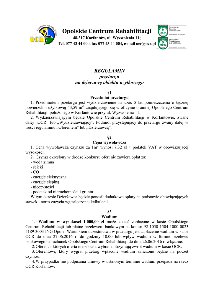 Regulamin przetargu - Opolskie Centrum Rehabilitacji w