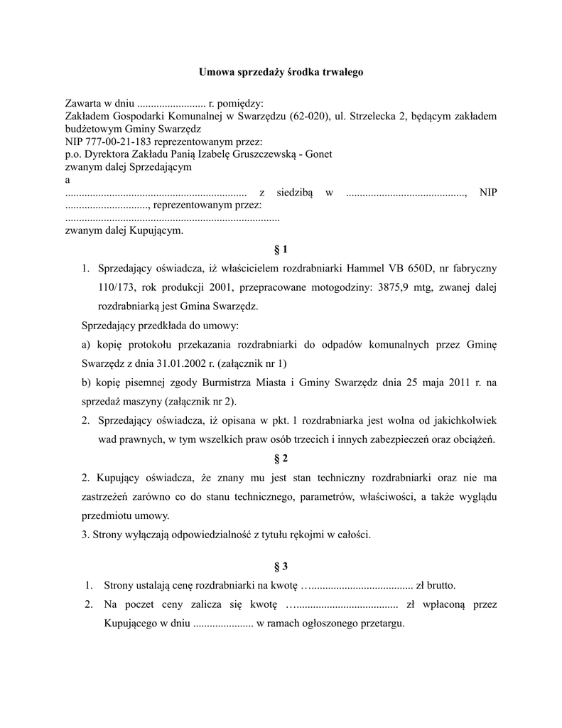 Umowa sprzedaży środka trwałego Zawarta w dniu ......................... r. pomiędzy: Zakładem Gospodarki Komunalnej w Swarzędzu (62-020), ul. Strzelecka 2, będącym zakładem budżetowym Gminy Swarzędz NIP 777-00-21-183 reprezentowanym przez: p.o. Dyrektora Zakładu Panią Izabelę Gruszczewską - Gonet zwanym dalej Sprzedającym a .................................................................. z siedzibą w ..........................................., NIP .............................., reprezentowanym przez: .............................................................................. zwanym dalej Kupującym. §1 1. Sprzedający oświadcza, iż właścicielem rozdrabniarki Hammel VB 650D, nr fabryczny 110/173, rok produkcji 2001, przepracowane motogodziny: 3875,9 mtg, zwanej dalej rozdrabniarką jest Gmina Swarzędz. Sprzedający przedkłada do umowy: a) kopię protokołu przekazania rozdrabniarki do odpadów komunalnych przez Gminę Swarzędz z dnia 31.01.2002 r. (załącznik nr 1) b) kopię pisemnej zgody Burmistrza Miasta i Gminy Swarzędz dnia 25 maja 2011 r. na sprzedaż maszyny (załącznik nr 2). 2. Sprzedający oświadcza, iż opisana w pkt. 1 rozdrabniarka jest wolna od jakichkolwiek wad prawnych, w tym wszelkich praw osób trzecich i innych zabezpieczeń oraz obciążeń. §2 2. Kupujący oświadcza, że znany mu jest stan techniczny rozdrabniarki oraz nie ma zastrzeżeń zarówno co do stanu technicznego, parametrów, właściwości, a także wyglądu przedmiotu umowy. 3. Strony wyłączają odpowiedzialność z tytułu rękojmi w całości. §3 1. Strony ustalają cenę rozdrabniarki na kwotę …..................................... zł brutto. 2. Na poczet ceny zalicza się kwotę …..................................... zł wpłaconą przez Kupującego w dniu ...................... w ramach ogłoszonego przetargu. 3. Wydanie przedmiotu umowy nastąpi na terenie składowiska odpadów w Rabowicach niezwłocznie po podpisaniu niniejszej umowy. Wraz z wydaniem przedmiotu umowy Sprzedający przekaże Kupującemu komplet kluczyków, pilot zdalnego sterowania oraz instrukcję obsługi rozdrabniarki. 4. Koszty wydania, transportu rozdrabniarki oraz wszystkie koszty zawarcia niniejszej umowy ponosi Kupujący. §4 Wszelkie zmiany niniejszej umowy wymagają formy pisemnej pod rygorem jej nieważności. §5 Ewentualne spory będzie rozstrzygał Sąd właściwy dla siedziby Sprzedającego. §6 W sprawach nie uregulowanych niniejszą umową mają zastosowanie przepisy Kodeksu Cywilnego. §7 1. Umowę sporządzono w dwóch jednobrzmiących egzemplarzach, po jednym dla każdej ze stron. 2. Załącznik nr 3 do umowy stanowi opis przedmiotu umowy. SPRZEDAJĄCY KUPUJACY