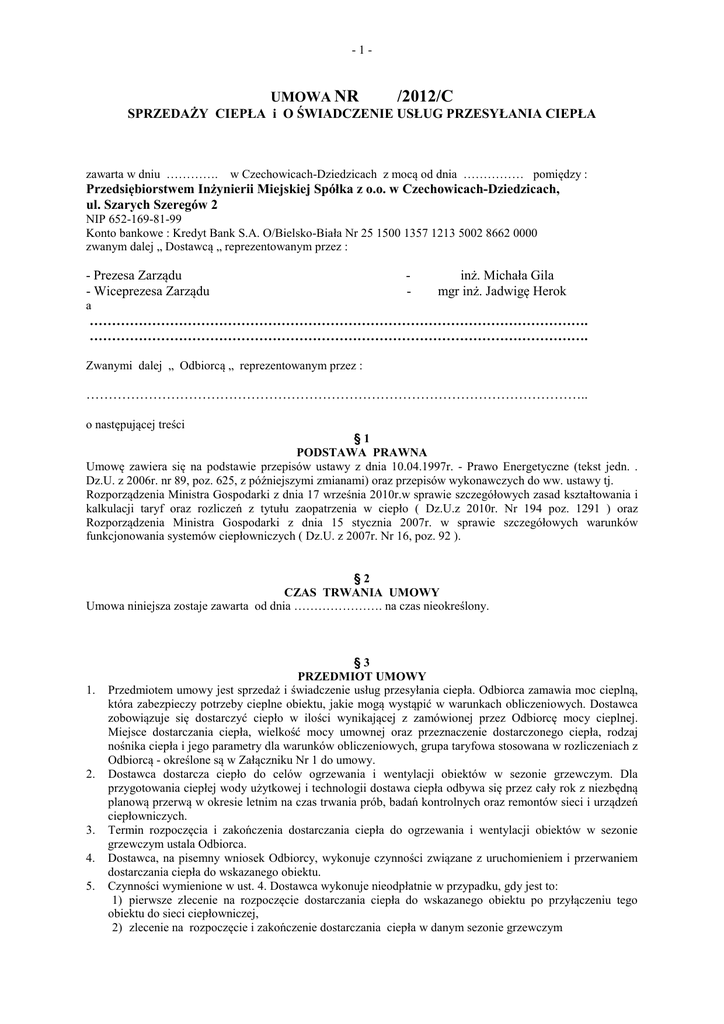-1- UMOWA NR /2012/C SPRZEDAŻY CIEPŁA i O ŚWIADCZENIE USŁUG PRZESYŁANIA CIEPŁA zawarta w dniu …………. w Czechowicach-Dziedzicach z mocą od dnia …………… pomiędzy : Przedsiębiorstwem Inżynierii Miejskiej Spółka z o.o. w Czechowicach-Dziedzicach, ul. Szarych Szeregów 2 NIP 652-169-81-99 Konto bankowe : Kredyt Bank S.A. O/Bielsko-Biała Nr 25 1500 1357 1213 5002 8662 0000 zwanym dalej „ Dostawcą „ reprezentowanym przez : - Prezesa Zarządu - Wiceprezesa Zarządu - inż. Michała Gila mgr inż. Jadwigę Herok a …………………………………………………………………………………………………. …………………………………………………………………………………………………. Zwanymi dalej „ Odbiorcą „ reprezentowanym przez : ………………………………………………………………………………………………….. o następującej treści §1 PODSTAWA PRAWNA Umowę zawiera się na podstawie przepisów ustawy z dnia 10.04.1997r. - Prawo Energetyczne (tekst jedn. . Dz.U. z 2006r. nr 89, poz. 625, z późniejszymi zmianami) oraz przepisów wykonawczych do ww. ustawy tj. Rozporządzenia Ministra Gospodarki z dnia 17 września 2010r.w sprawie szczegółowych zasad kształtowania i kalkulacji taryf oraz rozliczeń z tytułu zaopatrzenia w ciepło ( Dz.U.z 2010r. Nr 194 poz. 1291 ) oraz Rozporządzenia Ministra Gospodarki z dnia 15 stycznia 2007r. w sprawie szczegółowych warunków funkcjonowania systemów ciepłowniczych ( Dz.U. z 2007r. Nr 16, poz. 92 ). §2 CZAS TRWANIA UMOWY Umowa niniejsza zostaje zawarta od dnia …………………. na czas nieokreślony. 1. 2. 3. 4. 5. §3 PRZEDMIOT UMOWY Przedmiotem umowy jest sprzedaż i świadczenie usług przesyłania ciepła. Odbiorca zamawia moc cieplną, która zabezpieczy potrzeby cieplne obiektu, jakie mogą wystąpić w warunkach obliczeniowych. Dostawca zobowiązuje się dostarczyć ciepło w ilości wynikającej z zamówionej przez Odbiorcę mocy cieplnej. Miejsce dostarczania ciepła, wielkość mocy umownej oraz przeznaczenie dostarczonego ciepła, rodzaj nośnika ciepła i jego parametry dla warunków obliczeniowych, grupa taryfowa stosowana w rozliczeniach z Odbiorcą - określone są w Załączniku Nr 1 do umowy. Dostawca dostarcza ciepło do celów ogrzewania i wentylacji obiektów w sezonie grzewczym. Dla przygotowania ciepłej wody użytkowej i technologii dostawa ciepła odbywa się przez cały rok z niezbędną planową przerwą w okresie letnim na czas trwania prób, badań kontrolnych oraz remontów sieci i urządzeń ciepłowniczych. Termin rozpoczęcia i zakończenia dostarczania ciepła do ogrzewania i wentylacji obiektów w sezonie grzewczym ustala Odbiorca. Dostawca, na pisemny wniosek Odbiorcy, wykonuje czynności związane z uruchomieniem i przerwaniem dostarczania ciepła do wskazanego obiektu. Czynności wymienione w ust. 4. Dostawca wykonuje nieodpłatnie w przypadku, gdy jest to: 1) pierwsze zlecenie na rozpoczęcie dostarczania ciepła do wskazanego obiektu po przyłączeniu tego obiektu do sieci ciepłowniczej, 2) zlecenie na rozpoczęcie i zakończenie dostarczania ciepła w danym sezonie grzewczym -2- 6. Każde dodatkowe zlecenie Odbiorcy dotyczące przerwania lub rozpoczęcia dostarczania ciepła do obiektu oraz przerwanie lub wznowienie dostarczania ciepła z przyczyn określonych w § 13 ust. 3 pkt 4 i 5 umowy Dostawca wykonuje odpłatnie. §4 PODSTAWY I SPOSOBY PROWADZENIA ROZLICZEŃ I OBLICZANIA NALEŻNOŚCI 1. Z tytułu dostarczania ciepła Dostawca pobiera opłaty według cen i stawek oraz na warunkach stosowania cen i stawek opłat określonych w obowiązujących Taryfach dla ciepła Dostawcy oraz wytwórcy ciepła – Tauron Wytwarzanie S.A. w Katowicach. Stosowana Taryfa dla ciepła Dostawcy oraz wytwórcy zatwierdzana jest każdorazowo decyzją Prezesa Urzędu Regulacji Energetyki. 1a. W rozliczeniach za ciepło Dostawca pobiera opłaty: 1) opłatę za zamówioną moc – miesięczna rata opłaty za zamówioną moc cieplną pobierana jest za każdy miesiąc w roku i stanowi iloczyn zamówionej mocy cieplnej oraz 1/12 ceny za zamówioną moc cieplną dla danej grupy taryfowej, w wysokości określonej w Taryfie wytwórcy (źródło ciepła - EC II), 2) opłatę za ciepło – opłata pobierana za każdy miesiąc, w którym nastąpił pobór ciepła i stanowi iloczyn ilości dostarczonego ciepła ustalonej na podstawie odczytów wskazań układu pomiarowo-rozliczeniowego oraz ceny ciepła dla danej grupy taryfowej, w wysokości określonej w Taryfie wytwórcy (źródło ciepła – EC II), 3) opłatę za nośnik ciepła – opłata pobierana za każdy miesiąc, w którym nastąpił pobór nośnika ciepła, stanowi iloczyn ilości nośnika ciepła dostarczonego do napełniania i uzupełnienia ubytków wody w instalacjach odbiorczych, ustalonej na podstawie odczytów wskazań układu pomiarowo-rozliczeniowego oraz ceny nośnika ciepła dla danej grupy taryfowej, w wysokości określonej w Taryfie wytwórcy (źródło ciepła - EC II), 4) opłatę stałą za usługi przesyłowe – miesięczna rata opłaty stałej za usługi przesyłowe pobierana za każdy miesiąc w roku, stanowi iloczyn zamówionej mocy cieplnej oraz 1/12 stawki opłaty stałej za usługi przesyłowe dla danej grupy taryfowej, w wysokości określonej w Taryfie Dostawcy, 5) opłatę zmienną za usługi przesyłowe – opłata pobierana jest za każdy miesiąc, w którym nastąpił pobór ciepła, stanowi iloczyn ilości dostarczonego ciepła ustalonej na podstawie odczytów wskazań układu pomiarowo-rozliczeniowego oraz stawki opłaty zmiennej za usługi przesyłowe dla danej grupy taryfowej, w wysokości określonej w Taryfie Dostawcy. 1b. Zmiana Taryfy dla ciepła, cen i stawek opłat za ciepło następuje na podstawie decyzji Prezesa Urzędu Regulacji Energetyki i nie wymaga zmiany umowy. Dostawca powiadamia Odbiorcę o zm