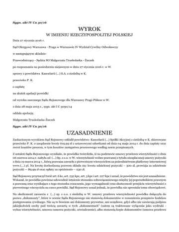 Sygn. akt IV Ca 30/16 WYROK W IMIENIU RZECZYPOSPOLITEJ POLSKIEJ Dnia 27 stycznia 2016 r. Sąd Okręgowy Warszawa - Praga w Warszawie IV Wydział Cywilny Odwoławczy w następującym składzie: Przewodniczący - Sędzia SO Małgorzata Truskolaska - Żuczek po rozpoznaniu na posiedzeniu niejawnym w dniu 27 stycznia 2016 r. w W. sprawy z powództwa Kancelarii (...) S.A. z siedzibą w K. przeciwko P. K. o zapłatę na skutek apelacji powódki od wyroku zaocznego Sądu Rejonowego dla Warszawy Pragi-Północ w W. z dnia 28 maja 2015 r., sygn. akt I C 3050/14 oddala apelację. Małgorzata Truskolaska-Żuczek Sygn. akt IV Ca 30/16 UZASADNIENIE Zaskarżonym wyrokiem Sąd Rejonowy oddalił powództwo Kancelarii (...) Spółki Akcyjnej z siedzibą w K. skierowane przeciwko P. K. o zasądzenie kwoty 619,99 zł z ustawowymi odsetkami od dnia 04 maja 2014 r. do dnia zapłaty oraz zwrot kosztów procesu, w tym kosztów zastępstwa procesowego według norm przepisanych. Z ustaleń Sądu Rejonowego wynikało, że powódka twierdziła, iż na podstawie umowy przelewu wierzytelności z dnia 06 czerwca 2014 r. nabyła od (...) Sp. z o.o. w W. wierzytelność wobec pozwanej z tytułu niespłaconej umowy pożyczki z dnia 19 marca 2014 r., którą pozwana zawarła z pierwotnym wierzycielem za pośrednictwem platformy internetowej www.(...) pl. Na kwotę dochodzoną pozwem składa się: kwota udzielonej pożyczki – 300 zł, prowizja za udzielenie pożyczki — 89,99 zł oraz opłaty za opóźnienie – 230 zł. Sąd Rejonowy przytoczył treść art. 6 kc, art. 232 kpc, art. 3 kpc i art. 227 kpc i uznał, że powództwo nie jest uzasadnione. Wskazał, że powódka powinna udowodnić istnienie stosunku zobowiązaniowego między jej poprzednikiem prawnym a pozwaną oraz wynikające z tego stosunku roszczenie, jego wymagalność oraz skuteczność przejścia wierzytelności z pierwotnego wierzyciela na rzecz powódki. Sąd Rejonowy uznał jednak, że powódka nie sprostała temu obowiązkowi. Na okoliczność zawarcia z (...) sp. z o.o. z siedzibą w W. umowy przelewu wierzytelności powódka dołączyła do pozwu „dokumenty", które w ocenie Sądu Rejonowego nie stanowią dokumentów w rozumieniu przepisów kodeksu postępowania cywilnego. Nie są to bowiem ani dokumenty prywatne, ani urzędowe, gdyż albo nie zawierają podpisu jakiejkolwiek osoby pod treścią zawartą w tych „dokumentach" (zatem są traktowane wyłącznie jako wydruki wykaz wierzytelności, umowa ramowa pożyczki, oświadczenie), albo stanowią kopie dokumentów (umowa przelewu wierzytelności) nieuwierzytelnione przez pełnomocnika procesowego powódki zgodnie z art. 6 ust. 3 ustawy o radcach prawnych. Sąd Rejonowy wskazał, że kserokopie dokumentów nie mają żadnej mocy dowodowej i nie można ich traktować jako innego środka dowodowego w rozumieniu art. 308 kpc. Powódka nie wykazała zatem przejęcia wierzytelności wobec pozwanej od (...) sp. z o.o. w W.. Umowa pożyczki ma zaś charakter ramowy i nie wynika z niej, że sporne wierzytelności istnieją i są wymagalne, a po drugie, że zostały skutecznie przeniesione na powódkę. Na podstawie niepoświadczonej kserokopii umowy przelewu wierzytelności oraz Załącznika nr l do niej nie sposób uznać, że w skład zbywanych wierzytelności wchodziła wymagalna wierzytelność wobec pozwanej i została ona przeniesiona poprzez zawarcie załączonej do pozwu umowy na powódkę. Sąd Rejonowy wskazując na treść art. 38 kc zauważył ponadto, że powódka nie wykazała, iż umowę przelewu podpisała osoba upoważniona do składania oświadczeń woli za (...) sp. z o.o. w W.. Sąd nie mógł zatem stwierdzić, czy umowa jest ważna. Ponadto powódka nie wykazała istnienia stosunku zobowiązaniowego między pozwaną, a jego poprzednikiem prawnym, bowiem na powyższą okoliczność przedstawiła jedynie wydruk niepodpisanej umowy ramowej pożyczki, który nie może stanowić jakiegokolwiek dowodu na istnienie stosunku zobowiązaniowego i wynikającego z niego roszczenia. Powódka nie wykazała zatem, że posiada legitymację procesową czynną do występowania w niniejszym procesie. Sąd wskazał ponadto na treść art. 339 kpc podzielając stanowisko, zgodnie z którym jeżeli w świetle przytoczonych przez powoda okoliczności brak jest podstaw do uwzględnienia żądania pozwu, sąd wyrokiem zaocznym oddala powództwo. W złożonej apelacji powódka zaskarżyła wyrok w całości wnosząc o jego zmianę i zasądzenie od pozwanej na jej rzecz kwoty 619,99 zł z ustawowymi odsetkami za zwłokę liczonymi od dnia 04 maja 2014 r. do dnia zapłaty wraz z kosztami postępowania oraz kosztami zastępstwa procesowego, według norm przepisanych, ewentualnie o uchylenie wyroku i przekazanie sprawy Sądowi I instancji do ponownego rozpoznania. Zarzuciła naruszenie przepisów prawa materialnego poprzez jego błędną wykładnię, w szczególności: art. 5 pkt 13 ustawy o kredycie konsumenckim w zw. z art. 6 ustawy o ochronie niektórych praw konsumentów oraz o odpowiedzialności za szkodę wyrządzoną przez produkt niebezpieczny, w zakresie, w jakim Sąd przyjął, że z powodu braku podpisanego przez pożyczkobiorcę dokumentu nie doszło do zawarcia umowy oraz art. 29 ustawy o kredycie konsumenckim poprzez przyjęcie, że w razie braku formy pisemnej nie doszło do zawarcia umowy. Zarzuciła ponadto naruszenie przepisów prawa procesowego, które miało wpływ na wynik sprawy, tj.: art. 232 kpc poprzez przyjęcie, że powódka nie przedstawiła dowodów na potwierdzenie zasadności roszczenia; art. 308 kpc poprzez przyjęcie, że dokumenty przedłożone przez powódkę nie posiadają mocy dowodowej; art. 339 § 2 kpc poprzez przyjęcie, że twierdzenia powódki budzą uzasadnione wątpliwości. Sąd Okręgowy zważył, co następuje: Apelacja podlegała oddaleniu, jako nieuzasadniona. Sąd Okręgowy podziela w całości ustalenia faktyczne poczynione przez Sąd I instancji oraz ich 