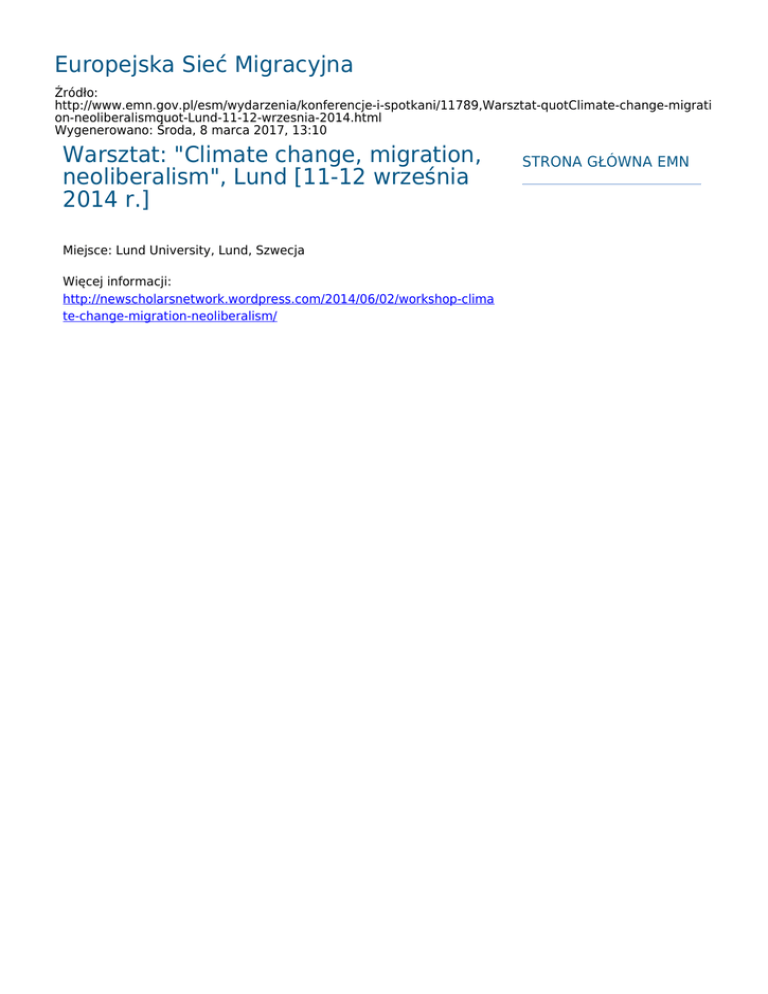 Europejska Sieć Migracyjna Źródło: http://www.emn.gov.pl/esm/wydarzenia/konferencje-i-spotkani/11789,Warsztat-quotClimate-change-migrati on-neoliberalismquot-Lund-11-12-wrzesnia-2014.html Wygenerowano: Środa, 8 marca 2017, 13:10 Warsztat: "Climate change, migration, neoliberalism", Lund [11-12 września 2014 r.] Miejsce: Lund University, Lund, Szwecja Więcej informacji: http://newscholarsnetwork.wordpress.com/2014/06/02/workshop-clima te-change-migration-neoliberalism/ STRONA GŁÓWNA EMN
