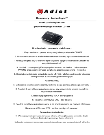 Komputery , technologie IT Instrukcja obsługi zestawu głośnomówiącego bluetooth LD -168 Uruchamianie i parowanie z telefonem : 1. Włącz zestaw - z prawej strony znajdziesz przełącznik ON/OFF 2. Uruchom bluetooth w telefonie komórkowym i wciśnij wyszukiwanie urządzeń ( należy pamiętać aby w telefonie była włączona opcja widoczności bluetooth dla wszystkich urządzeń ) 3. Naciśnij i przytrzymaj główny przycisk zestawu na środku . Usłyszysz głos PARING oraz zacznie mrugać lampka na przemian czerwona i niebieska 4. Oczekuj aż w telefonie pojawi sie model LD-168 - telefon powinien się wówczas sam sparować z zestawem głośnomówiącym. Kod PIN : 0000 5. Odbieranie oraz kończenie rozmów odbywa się za pomocą głównego przycisku . 6. Naciśnij 2 razy główny przycisk zestawu aby połączyć się szybko z ostatnim wybieranym numerem. 7. Naciśnij i przytrzymaj VOL+ aby pogłośnić 8. Naciśnij i przytrzymaj VOL- aby ściszyć 9. Naciśnij raz główny przycisk zestaw a po chwili uruchomi się muzyka z telefonu. Klawiszem VOL- oraz VOL+ można przełączać piosenki . Parowanie dwóch telefonów: 9. Wykonaj czynność parowania pierwszego telefonu. Wykonaj taką samą czynność z drugim telefonem. Zestaw jest sparowany z dwoma telefonami. Może zajść konieczność ponownego uruchomienia zestawu w celu sparowania dwóch telefonów.