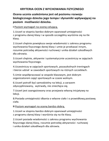 KRYTERIA OCEN Z WYCHOWANIA FIZYCZNEGO Ocena ucznia uzależniona jest od poziomu rozwoju biologicznego dziecka jego tempa i dynamiki wpływającej na poziom możliwości dziecka. I Poziom wymagań na ocenę celującą. 1.Uczeń w stopniu bardzo dobrym opanował umiejętności z programu danej klasy i w sposób szczególny wyróżnia się na tle klasy. 2.Uczeń chętnie powiększa swoje wiadomości z zakresu programu wychowania fizycznego danej klasy i umie je przekazać innym, rozumie potrzebę aktywności ruchowej i unika działań szkodliwych dla zdrowia. 3.Uczeń chętnie, aktywnie i systematycznie uczestniczy w zajęciach wychowania fizycznego. 4.Uczestniczy w zajęciach sportowych, pozaszkolnych treningach i bierze udział w zawodach sportowych na różnych szczeblach. 5.Umie współpracować w zespole klasowym, jest dobrym organizatorem zajęć sportowych w czasie wolnym. 6.Uczeń potrafi być samodzielny na lekcji, a zarazem zdyscyplinowany, wytrwały, nie zniechęca się. 7.Uczeń jest zaangażowany oraz przejawia własną inicjatywę na lekcji. 8.Posiada umiejętności dbania o własne ciało i o prawidłową postawę ciała. II Poziom wymagań na ocenę bardzo dobrą. 1.Uczeń w stopniu bardzo dobrym opanował umiejętności z programu danej klasy i wyróżnia się na tle klasy. 2.Uczeń posiada wiadomości z zakresu programu wychowania fizycznego danej klasy, rozumie potrzebę aktywności ruchowej i unika działań szkodliwych dla zdrowia. 3.Uczeń chętnie, aktywnie i systematycznie uczestniczy w zajęciach wychowania fizycznego. 4. Uczeń wykazuje postępy w poziomie rozwoju sprawności i wydolności wyznaczane poprzez testy sprawności fizycznej. 5.Umie współpracować w zespole klasowym, jest dobrym organizatorem zajęć sportowych w czasie wolnym. 6.Uczeń potrafi być samodzielny na lekcji, zdyscyplinowany, wytrwały w działaniu, zaangażowany. 7.Posiada umiejętność dbania o własne ciało i o prawidłową postawę ciała. III Poziom wymagań na ocenę dobrą. 1. Uczeń w stopniu dobrym opanował umiejętności z programu danej klasy. 2.Uczeń posiada wiadomości z zakresu programu wychowania fizycznego danej klasy i unika działań szkodliwych dla zdrowia. 3.Uczeń systematycznie uczestniczy w zajęciach wychowania fizycznego. 4.Uczeń wykazuję postępy w poziomie rozwoju sprawności i wydolności organizmu wyznaczane przez testy sprawności fizycznej. 5.Umie współpracować w zespole klasowym. 6.Uczeń jest zdyscyplinowany na lekcji, zaangażowany. 7.Posiada umiejętność dbania o własne ciało i o prawidłową postawę ciała. IV Poziom wymagań na ocenę dostateczną. 1. Uczeń w stopniu dostatecznym opanował umiejętności z zakresu programu danej klasy. 2.Uczeń posiada podstawowe wiadomości z zakresu programu wychowania fizycznego danej klasy. 3.Uczeń niesystematycznie uczestniczy w zajęciach wychowania fizycznego. 4.Uczeń wykazuje słabe postępy w poziomie rozwoju sprawności i wydolności organizmu, wyznaczane przez test sprawności fizycznej. 5.Uczeń jest mało zdyscyplinowany na lekcji, brak u niego zaangażowania, nie potrafi być samodzielnym, biernie naśladuje nauczyciela lub kolegów. 6.Uczeń wie jak dbać o własne ciało i prawidłową postawę ciała, ale nie umie tych wiadomości zastosować w działaniu. V Poziom wymagań na ocenę dopuszczającą. 1. Uczeń opanował podstawowe elementy umiejętności z zakresu programu danej klasy, nie umiejąc ich wykorzystać w czasie wolnym. 2.Uczeń posiada słabe i wybiórcze wiadomości z zakresu programu wychowania fizycznego danej klasy. 3.Uczeń niesystematycznie uczestniczy w zajęciach wychowania fizycznego, ćwiczy niechętnie, z oporami. 4.Uczeń wykazuje słabe postępy w poziomie rozwoju sprawności i wydolności organizmu. 5.Uczeń jest mało zdyscyplinowany na lekcji, brak u niego zaangażowania, zainteresowania tematem, nie potrafi być samodzielny, biernie naśladuje nauczyciela lub kolegów. 6.Uczeń słabo dba o własne ciało i o prawidłową postawę ciała. VI Ocenę niedostateczną otrzymuje uczeń, który : 1.Jest daleki od spełnienia wymagań stawianych przez program. 2. Ma lekceważący stosunek do zajęć i nie wykazuje żadnych postępów w usprawnieniu. 3. Nie ćwiczy na lekcjach, nie nosi stroju sportowego. 4. Charakteryzuje się praktycznie niewiedzą w zakresie kultury fizycznej. 5. na zajęciach wykazuje duże braki w zakresie wychowania społecznego. KRYTERIUM OCENY DODATKOWEJ - ocena za systematyczne noszenie stroju, - za aktywność na lekcji, - systematyczny udział w zajęciach pozalekcyjnych i reprezentowanie szkoły na zawodach, - starty na imprezach masowych, organizowanych przez szkoły i instytucje sportowe działające na terenie miasta (np. „Bieg Powsinogi”, „Pokaż co potrafisz”, „Kwietna Mila”), - pomoc w organizacji zawodów (sędziowanie, pisanie protokołu), -wykonanie gazetki tematycznej, przygotowanie referatu czy prezentacji o tematyce sportowej i prozdrowotnej itp. ZAWSZE PRZY OCENIE UCZNIA BIERZE SIĘ POD UWAGĘ JEGO ZAANGAŻOWANIE, WYSIŁEK, MOŻLIWOŚCI, STOSUNEK DO PRZEDMIOTU I NAUCZYCIELA!