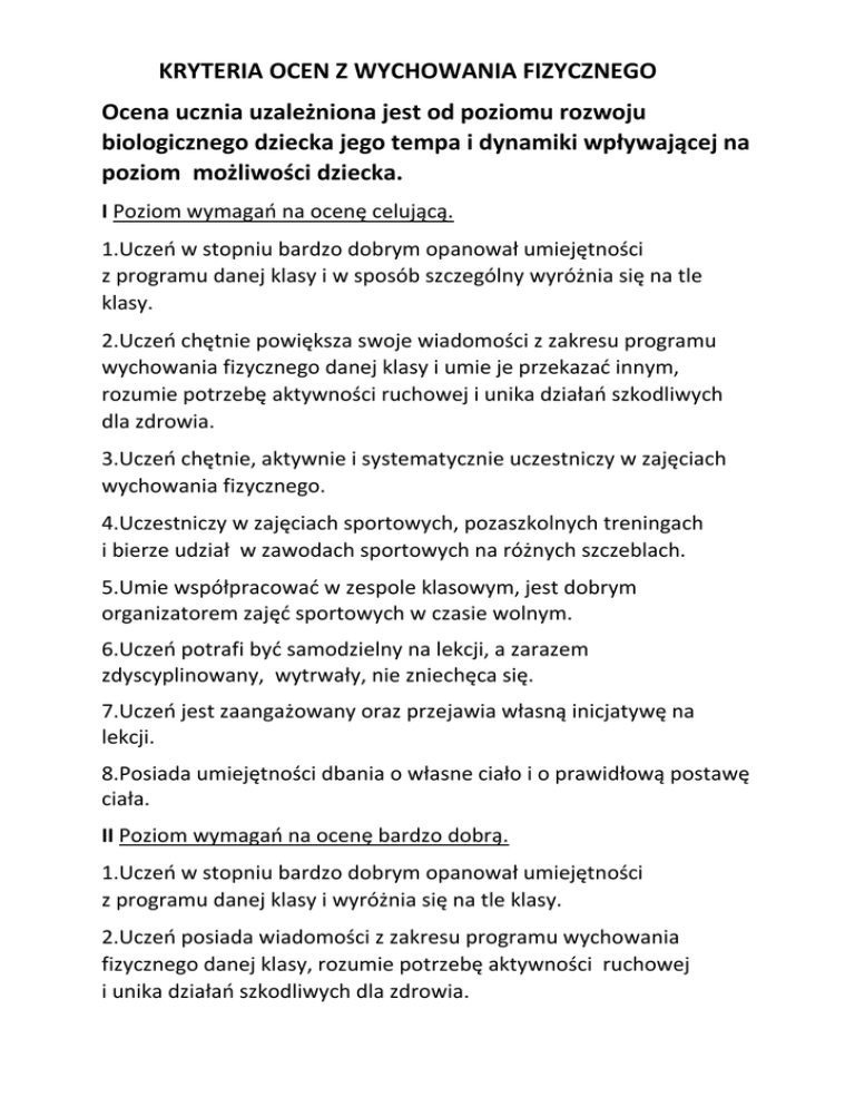 KRYTERIA OCEN Z WYCHOWANIA FIZYCZNEGO Ocena ucznia