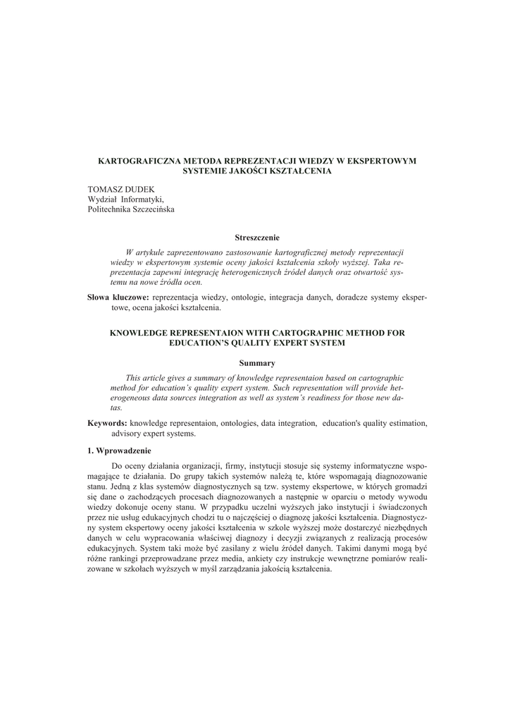 Słowa kluczowe: reprezentacja wiedzy, ontologie, integracja danych, doradcze systemy ekspertowe, ocena jakoci kształcenia.
