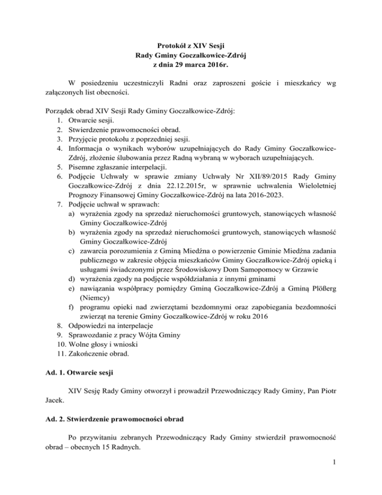 Protokół z XIV Sesji Rady Gminy Goczałkowice-Zdrój z dnia 29 marca 2016r. W posiedzeniu uczestniczyli Radni oraz zaproszeni goście i mieszkańcy wg załączonych list obecności. Porządek obrad XIV Sesji Rady Gminy Goczałkowice-Zdrój: 1. Otwarcie sesji. 2. Stwierdzenie prawomocności obrad. 3. Przyjęcie protokołu z poprzedniej sesji. 4. Informacja o wynikach wyborów uzupełniających do Rady Gminy GoczałkowiceZdrój, złożenie ślubowania przez Radną wybraną w wyborach uzupełniających. 5. Pisemne zgłaszanie interpelacji. 6. Podjęcie Uchwały w sprawie zmiany Uchwały Nr XII/89/2015 Rady Gminy Goczałkowice-Zdrój z dnia 22.12.2015r, w sprawnie uchwalenia Wieloletniej Prognozy Finansowej Gminy Goczałkowice-Zdrój na lata 2016-2023. 7. Podjęcie uchwał w sprawach: a) wyrażenia zgody na sprzedaż nieruchomości gruntowych, stanowiących własność Gminy Goczałkowice-Zdrój b) wyrażenia zgody na sprzedaż nieruchomości gruntowych, stanowiących własność Gminy Goczałkowice-Zdrój c) zawarcia porozumienia z Gminą Miedźna o powierzenie Gminie Miedźna zadania publicznego w zakresie objęcia mieszkańców Gminy Goczałkowice-Zdrój opieką i usługami świadczonymi przez Środowiskowy Dom Samopomocy w Grzawie d) wyrażenia zgody na podjęcie współdziałania z innymi gminami e) nawiązania współpracy pomiędzy Gminą Goczałkowice-Zdrój a Gminą Plößerg (Niemcy) f) programu opieki nad zwierzętami bezdomnymi oraz zapobiegania bezdomności zwierząt na terenie Gminy Goczałkowice-Zdrój w roku 2016 8. Odpowiedzi na interpelacje 9. Sprawozdanie z pracy Wójta Gminy 10. Wolne głosy i wnioski 11. Zakończenie obrad. Ad. 1. Otwarcie sesji XIV Sesję Rady Gminy otworzył i prowadził Przewodniczący Rady Gminy, Pan Piotr Jacek. Ad. 2. Stwierdzenie prawomocności obrad Po przywitaniu zebranych Przewodniczący Rady Gminy stwierdził prawomocność obrad – obecnych 15 Radnych. 1 Przewodniczący Rady Gminy poinformował, że posiedzenie zostanie poszerzone o punkt 7g. – odczytanie protokołu z ostatniego posiedzenia Komisji Rewizyjnej. Przewodniczący Rady Gminy poddał zmianę porządku obrad pod głosowanie. Za – 15 Przeciw – 0 Wstrzymujące się – 0 Zmianę porządku obrad przyjęto jednogłośnie. Porządek obrad XIV Sesji Rady Gminy Goczałkowice-Zdrój po przegłosowanej zmianie: 1. Otwarcie sesji. 2. Stwierdzenie prawomocności obrad. 3. Przyjęcie protokołu z poprzedniej sesji. 4. Informacja o wynikach wyborów uzupełniających do Rady Gminy GoczałkowiceZdrój, złożenie ślubowania przez Radną wybraną w wyborach uzupełniających. 5. Pisemne zgłaszanie interpelacji. 6. Podjęcie Uchwały w sprawie zmiany Uchwały Nr XII/89/2015 Rady Gminy Goczałkowice-Zdrój z dnia 22.12.2015r, w sprawnie uchwalenia Wieloletniej Prognozy Finansowej Gminy Goczałkowice-Zdrój na lata 2016-2023. 7. Podjęcie uchwał w sprawach: a) wyrażenia zgody na sprzedaż nieruchomości gruntowych, stanowiących własność Gminy Goczałkowice-Zdrój b) wyrażenia zgody na sprzedaż nieruchomości gruntowych, stanowiących własność Gminy Goczałkowice-Zdrój c) zawarcia porozumienia z Gminą Miedźna o powierzenie Gminie Miedźna zadania publicznego w zakresie objęcia mieszkańców Gminy Goczałkowice-Zdrój opieką i usługami świadczonymi przez Środowiskowy Dom Samopomocy w Grzawie d) wyrażenia zgody na podjęcie współdziałania z innymi gminami e) nawiązania współpracy pomiędzy Gminą Goczałkowice-Zdrój a Gminą Plößerg (Niemcy) f) programu opieki nad zwierzętami bezdomnymi oraz zapobiegania bezdomności zwierząt na terenie Gminy Goczałkowice-Zdrój w roku 2016 g) odczytanie protokołu z ostatniego posiedzenia Komisji Rewizyjnej. 8. Odpowiedzi na interpelacje 9. Sprawozdanie z pracy Wójta Gminy 10. Wolne głosy i wnioski 11. Zakończenie obrad. Ad. 3. Przyjęcie protokołów z poprzednich sesji Następnie Przewodniczący poprosił Radnych o głosowanie w sprawie przyjęcia protokołu z XIII sesji Rady Gminy Goczałkowice-Zdrój z dnia 23.02.2016r. Za – 13 Przeciw – 0 Wstrzymujących się – 2 2 Ad. 4. Informacja o wynikach wyborów uzupełniających do Rady Gminy GoczałkowiceZdrój, złożenie ślubowania przez Radną wybraną w wyborach uzupełniających Przewodniczący Rady Gminy poprosił przewodniczącą gminnej komisji wyborczej – Panią Annę Mrzyk o odczytanie wyników wyborów uzupełniających do Rady Gminy Goczałkowice-Zdrój w okręgu wyborczym Nr 3 zarządzonych na dzień 20 marca 2016 roku. Pani Mrzyk poinformowała, że w wyborach uzupełniających na radnego startowały trzy osoby. Ogierman Izabela Wiesława, zgłoszona przez KWW Jedność mieszkańców; Kost Grzegorz Józef, zgłoszony przez KWW Mieszkańcy z inicjatywą; Waliczek Grażyna Maria, zgłoszona przez KWW Grażyny Waliczek. Poinformowano, że uprawnionych do głosowania było 279 osób natomiast liczba wyborców, którzy wzięli udział w głosowaniu wyniosła 44 osoby, zatem frekwencja wyniosła 15,77%. Największą liczbą głosów w wyborach otrzymała Pani Ogierman Izabela Wiesława, co pozwoliło jej na uzyskanie mandatu radnej. Po odczytaniu wyników wyborów uzupełniających do Rady Gminy, Pani Mrzyk wręczyła Radnej Izabeli Ogierman zaświadczenie o wyborze na radną. Następnie Przewodniczący Rady Gminy poprosił wszystkich o powstanie, a nową Radną o złożenie uroczystego ślubowania. Ad. 5. Pisemne zgłaszanie interpelacji Radny Zbigniew Jacek złożył interpelację w sprawie udzielenia odpowiedzi na pytania dotyczące Uzdrowiska w Gminie Goczałkowice-Zdrój. Radna Małgorzata Paszek złożyła interpelację zagospodarowania terenu obok starego dworca pod plac zabaw. w sprawie planowania Radna Krystyna Świerkot-Żmij złożyła interpelację Komisji Oświaty i Spraw Społecznych w sprawie przywrócenia organizacji sportowych obozów letnich na obiektach oświatowo-sportowych Gminy Goczałkowice-Zdrój. Radna Krystyna Świerkot-Żmij złoży