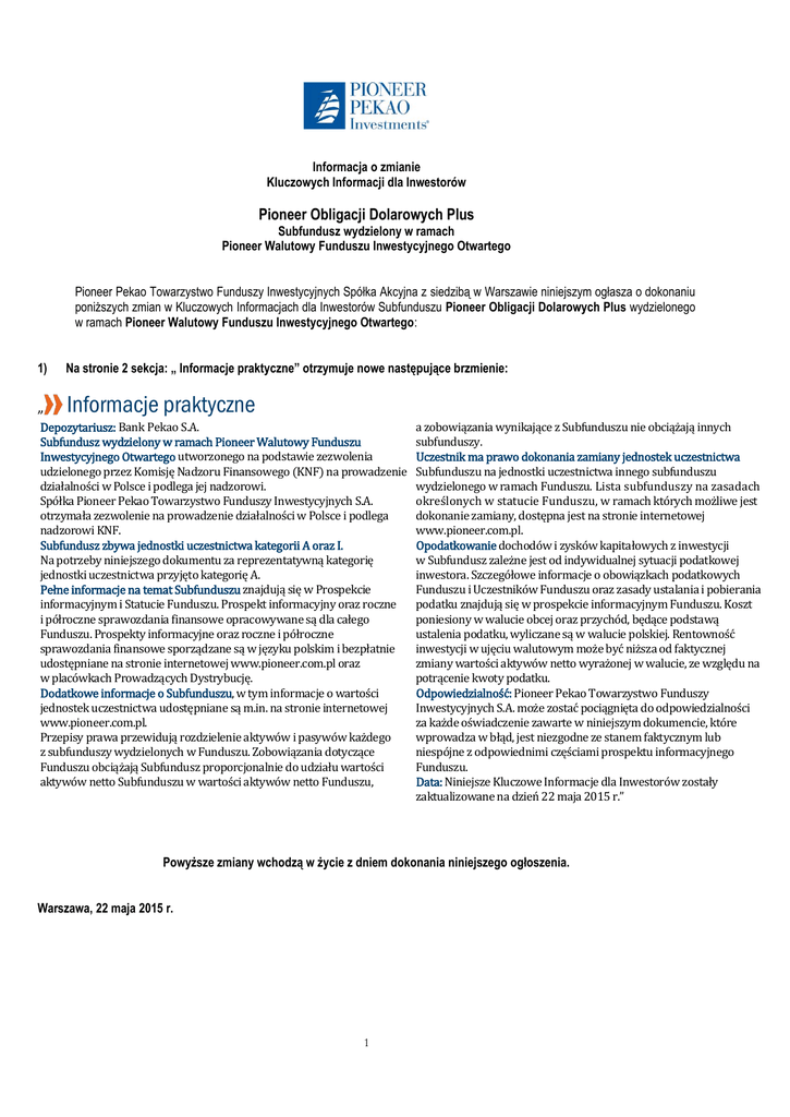 Informacja o zmianie Kluczowych Informacji dla Inwestorów Pioneer Obligacji Dolarowych Plus Subfundusz wydzielony w ramach Pioneer Walutowy Funduszu Inwestycyjnego Otwartego Pioneer Pekao Towarzystwo Funduszy Inwestycyjnych Spółka Akcyjna z siedzibą w Warszawie niniejszym ogłasza o dokonaniu poniższych zmian w Kluczowych Informacjach dla Inwestorów Subfunduszu Pioneer Obligacji Dolarowych Plus wydzielonego w ramach Pioneer Walutowy Funduszu Inwestycyjnego Otwartego: 1) Na stronie 2 sekcja: „ Informacje praktyczne” otrzymuje nowe następujące brzmienie: „ Informacje praktyczne Depozytariusz: Bank Pekao S.A. Subfundusz wydzielony w ramach Pioneer Walutowy Funduszu Inwestycyjnego Otwartego utworzonego na podstawie zezwolenia udzielonego przez Komisję Nadzoru Finansowego (KNF) na prowadzenie działalności w Polsce i podlega jej nadzorowi. Spółka Pioneer Pekao Towarzystwo Funduszy Inwestycyjnych S.A. otrzymała zezwolenie na prowadzenie działalności w Polsce i podlega nadzorowi KNF. Subfundusz zbywa jednostki uczestnictwa kategorii A oraz I. Na potrzeby niniejszego dokumentu za reprezentatywną kategorię jednostki uczestnictwa przyjęto kategorię A. Pełne informacje na temat Subfunduszu znajdują się w Prospekcie informacyjnym i Statucie Funduszu. Prospekt informacyjny oraz roczne i półroczne sprawozdania finansowe opracowywane są dla całego Funduszu. Prospekty informacyjne oraz roczne i półroczne sprawozdania finansowe sporządzane są w języku polskim i bezpłatnie udostępniane na stronie internetowej www.pioneer.com.pl oraz w placówkach Prowadzących Dystrybucję. Dodatkowe informacje o Subfunduszu, w tym informacje o wartości jednostek uczestnictwa udostępniane są m.in. na stronie internetowej www.pioneer.com.pl. Przepisy prawa przewidują rozdzielenie aktywów i pasywów każdego z subfunduszy wydzielonych w Funduszu. Zobowiązania dotyczące Funduszu obciążają Subfundusz proporcjonalnie do udziału wartości aktywów netto Subfunduszu w wartości aktywów netto Funduszu, a zobowiązania wynikające z Subfunduszu nie obciążają innych subfunduszy. Uczestnik ma prawo dokonania zamiany jednostek uczestnictwa Subfunduszu na jednostki uczestnictwa innego subfunduszu wydzielonego w ramach Funduszu. Lista subfunduszy na zasadach określonych w statucie Funduszu, w ramach których możliwe jest dokonanie zamiany, dostępna jest na stronie internetowej www.pioneer.com.pl. Opodatkowanie dochodów i zysków kapitałowych z inwestycji w Subfundusz zależne jest od indywidualnej sytuacji podatkowej inwestora. Szczegółowe informacje o obowiązkach podatkowych Funduszu i Uczestników Funduszu oraz zasady ustalania i pobierania podatku znajdują się w prospekcie informacyjnym Funduszu. Koszt poniesiony w walucie obcej oraz przychód, będące podstawą ustalenia podatku, wyliczane są w walucie polskiej. Rentowność inwestycji w ujęciu walutowym może być niższa od faktycznej zmiany wartości aktywów netto wyrażonej w walucie, ze względu na potrącenie kwoty podatku. Odpowiedzialność: Pioneer Pekao Towarzystwo Funduszy Inwestycyjnych S.A. może zostać pociągnięta do odpowiedzialności za każde oświadczenie zawarte w niniejszym dokumencie, które wprowadza w błąd, jest niezgodne ze stanem faktycznym lub niespójne z odpowiednimi częściami prospektu informacyjnego Funduszu. Data: Niniejsze Kluczowe Informacje dla Inwestorów zostały zaktualizowane na dzień 22 maja 2015 r.” Powyższe zmiany wchodzą w życie z dniem dokonania niniejszego ogłoszenia. Warszawa, 22 maja 2015 r. 1