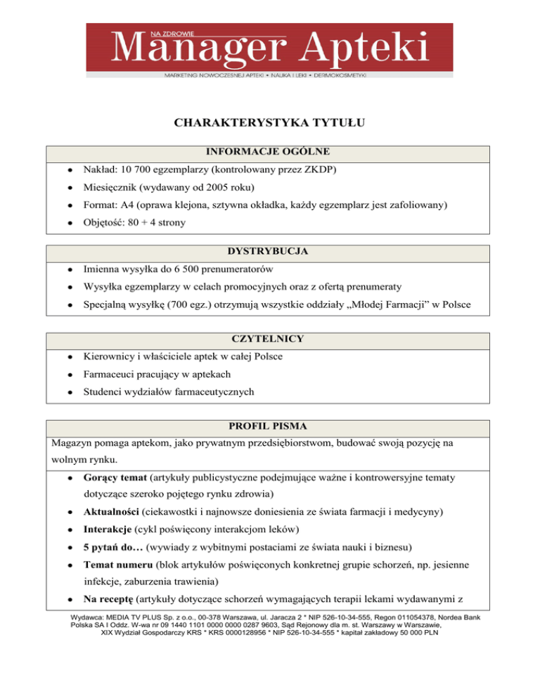 CHARAKTERYSTYKA TYTUŁU INFORMACJE OGÓLNE Nakład: 10 700 egzemplarzy (kontrolowany przez ZKDP) Miesięcznik (wydawany od 2005 roku) Format: A4 (oprawa klejona, sztywna okładka, każdy egzemplarz jest zafoliowany) Objętość: 80 + 4 strony DYSTRYBUCJA Imienna wysyłka do 6 500 prenumeratorów Wysyłka egzemplarzy w celach promocyjnych oraz z ofertą prenumeraty Specjalną wysyłkę (700 egz.) otrzymują wszystkie oddziały „Młodej Farmacji” w Polsce CZYTELNICY Kierownicy i właściciele aptek w całej Polsce Farmaceuci pracujący w aptekach Studenci wydziałów farmaceutycznych PROFIL PISMA Magazyn pomaga aptekom, jako prywatnym przedsiębiorstwom, budować swoją pozycję na wolnym rynku. Gorący temat (artykuły publicystyczne podejmujące ważne i kontrowersyjne tematy dotyczące szeroko pojętego rynku zdrowia) Aktualności (ciekawostki i najnowsze doniesienia ze świata farmacji i medycyny) Interakcje (cykl poświęcony interakcjom leków) 5 pytań do… (wywiady z wybitnymi postaciami ze świata nauki i biznesu) Temat numeru (blok artykułów poświęconych konkretnej grupie schorzeń, np. jesienne infekcje, zaburzenia trawienia) Na receptę (artykuły dotyczące schorzeń wymagających terapii lekami wydawanymi z Wydawca: MEDIA TV PLUS Sp. z o.o., 00-378 Warszawa, ul. Jaracza 2 * NIP 526-10-34-555, Regon 011054378, Nordea Bank Polska SA I Oddz. W-wa nr 09 1440 1101 0000 0000 0287 9603, Sąd Rejonowy dla m. st. Warszawy w Warszawie, XIX Wydział Gospodarczy KRS * KRS 0000128956 * NIP 526-10-34-555 * kapitał zakładowy 50 000 PLN przepisu lekarza) Bez recepty (artykuły dotyczące dolegliwości, które mogą być leczone preparatami OTC) Dermatologia (artykuły poświęcone schorzeniom dermatologicznym, a także pielęgnacji skóry) Biznes i marketing (artykuły z zakresu marketingu aptecznego, neuromarketingu, prawa, finansów, recenzje książek przydatnych w prowadzeniu apteki, rubryki poradnicze: „Jak sprzedawać dermokosmetyki?”, „Prawnik radzi…”) Po godzinach (artykuły dotyczące historii farmacji, podróży, sztuki, felietony) Rynek farmaceutyczny (prezentacje produktów dostępnych na rynku mające na celu zwiększenie zainteresowania farmaceutów tymi produktami) Angielski dla farmaceutów (cykliczne lekcje języka angielskiego z ćwiczeniami i słowniczkiem; każda lekcja dotyczy innego schorzenia) Artykuły medyczne są pisane wyłącznie przez lekarzy i farmaceutów. Artykuły w dziale „Biznes i marketing” są autorstwa wybitnych specjalistów w danej dziedzinie. NAGRODA PROFESORÓW FARMACJI Od 3 lat wydawca „Managera Apteki” jest wyłącznym organizatorem Nagrody Profesorów Farmacji – jedynego eksperckiego wyróżnienia tworzącego podstawy standaryzacji na polskim rynku suplementów diety. W skład Zespołu Ekspertów wchodzą: prof. dr hab. Elżbieta Lidia Anuszewska, prof. Iwona Wawer, prof. Anna Wędzisz, prof. dr. hab. Ludwik Czerwiecki, prof. Aleksander Mazurek, dr n. farm. Grażyna Sygitowicz, dr n. farm. Sławomir Białek AKCJE SPOŁECZNE „Manager Apteki” wspólnie z aptekami podejmuje akcje społeczne, np. zbiórki funduszy na budowę apteki dla niepełnosprawnych farmaceutów, akcję badań profilaktycznych „Uwaga nerki!”, zbieranie podpisów pod petycją do minister zdrowia w sprawie chorób nerwowomięśniowych. Wydawca: MEDIA TV PLUS Sp. z o.o., 00-378 Warszawa, ul. Jaracza 2 * NIP 526-10-34-555, Regon 011054378, Nordea Bank Polska SA I Oddz. W-wa nr 09 1440 1101 0000 0000 0287 9603, Sąd Rejonowy dla m. st. Warszawy w Warszawie, XIX Wydział Gospodarczy KRS * KRS 0000128956 * NIP 526-10-34-555 * kapitał zakładowy 50 000 PLN WYDAWNICTWO Wydawca niezależny (rok założenia: 1995) Właściciel platformy multimedialnej, w skład której wchodzą magazyny: „Manager Apteki”, „Świat Lekarza”, „Na zdrowie. Dostępne bez recepty” oraz Nagroda Zaufania „Złoty OTIS”, Nagroda Profesorów Farmacji, wortal nazdrowie.pl PROMOCJA Na wortalu www.nazdrowie.pl Aktywny telemarketing działu prenumeraty Okresowe telefoniczne badanie opinii czytelników Wydawca: MEDIA TV PLUS Sp. z o.o., 00-378 Warszawa, ul. Jaracza 2 * NIP 526-10-34-555, Regon 011054378, Nordea Bank Polska SA I Oddz. W-wa nr 09 1440 1101 0000 0000 0287 9603, Sąd Rejonowy dla m. st. Warszawy w Warszawie, XIX Wydział Gospodarczy KRS * KRS 0000128956 * NIP 526-10-34-555 * kapitał zakładowy 50 000 PLN