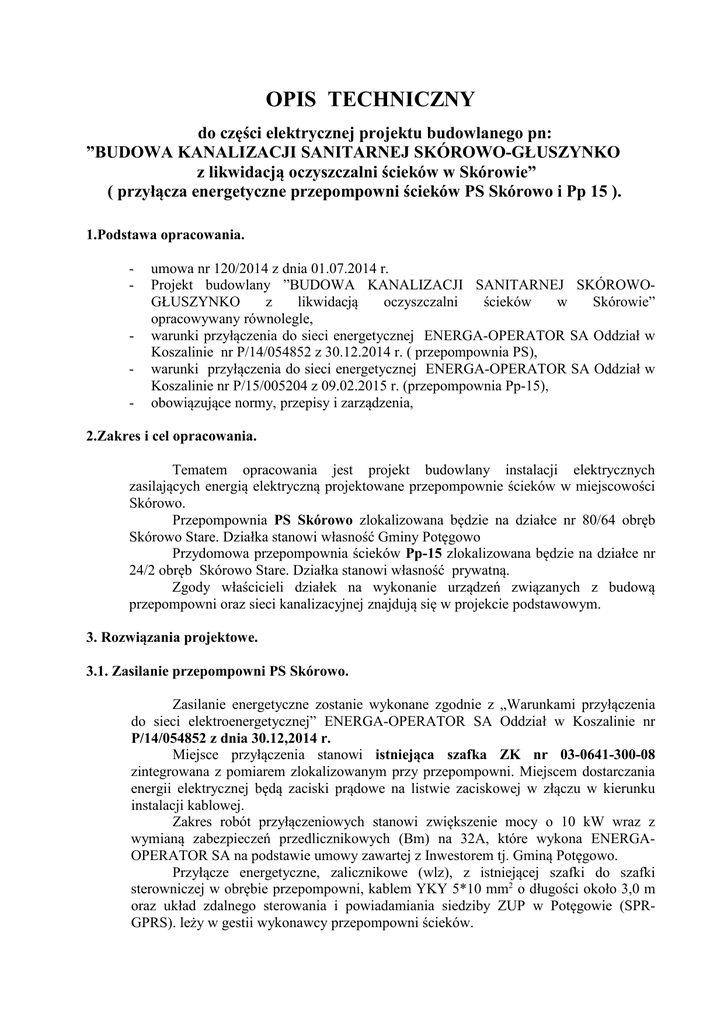 OPIS TECHNICZNY do części elektrycznej projektu budowlanego pn: ”BUDOWA KANALIZACJI SANITARNEJ SKÓROWO-GŁUSZYNKO z likwidacją oczyszczalni ścieków w Skórowie” ( przyłącza energetyczne przepompowni ścieków PS Skórowo i Pp 15 ). 1.Podstawa opracowania. - - umowa nr 120/2014 z dnia 01.07.2014 r. Projekt budowlany ”BUDOWA KANALIZACJI SANITARNEJ SKÓROWOoczyszczalni ścieków w Skórowie” GŁUSZYNKO z likwidacją opracowywany równolegle, warunki przyłączenia do sieci energetycznej ENERGA-OPERATOR SA Oddział w Koszalinie nr P/14/054852 z 30.12.2014 r. ( przepompownia PS), warunki przyłączenia do sieci energetycznej ENERGA-OPERATOR SA Oddział w Koszalinie nr P/15/005204 z 09.02.2015 r. (przepompownia Pp-15), obowiązujące normy, przepisy i zarządzenia, 2.Zakres i cel opracowania. Tematem opracowania jest projekt budowlany instalacji elektrycznych zasilających energią elektryczną projektowane przepompownie ścieków w miejscowości Skórowo. Przepompownia PS Skórowo zlokalizowana będzie na działce nr 80/64 obręb Skórowo Stare. Działka stanowi własność Gminy Potęgowo Przydomowa przepompownia ścieków Pp-15 zlokalizowana będzie na działce nr 24/2 obręb Skórowo Stare. Działka stanowi własność prywatną. Zgody właścicieli działek na wykonanie urządzeń związanych z budową przepompowni oraz sieci kanalizacyjnej znajdują się w projekcie podstawowym. 3. Rozwiązania projektowe. 3.1. Zasilanie przepompowni PS Skórowo. Zasilanie energetyczne zostanie wykonane zgodnie z „Warunkami przyłączenia do sieci elektroenergetycznej” ENERGA-OPERATOR SA Oddział w Koszalinie nr P/14/054852 z dnia 30.12,2014 r. Miejsce przyłączenia stanowi istniejąca szafka ZK nr 03-0641-300-08 zintegrowana z pomiarem zlokalizowanym przy przepompowni. Miejscem dostarczania energii elektrycznej będą zaciski prądowe na listwie zaciskowej w złączu w kierunku instalacji kablowej. Zakres robót przyłączeniowych stanowi zwiększenie mocy o 10 kW wraz z wymianą zabezpieczeń przedlicznikowych (Bm) na 32A, które wykona ENERGAOPERATOR SA na podstawie umowy zawartej z Inwestorem tj. Gminą Potęgowo. Przyłącze energetyczne, zalicznikowe (wlz), z istniejącej szafki do szafki sterowniczej w obrębie przepompowni, kablem YKY 5*10 mm2 o długości około 3,0 m oraz układ zdalnego sterowania i powiadamiania siedziby ZUP w Potęgowie (SPRGPRS). leży w gestii wykonawcy przepompowni ścieków. Wymagany stopień skompensowania mocy biernej: tg fi≤0,4. Kable energetyczne należy ułożyć w ziemi na głębokości 0,7 m i oznaczyć folią koloru niebieskiego. Przy wyprowadzeniu kabli pozostawić 2,5-metrowe zapasy. Ochronę od porażeń prądem elektrycznym jako zabezpieczenie przedlicznikowe zabezpieczy rozłącznik bezpiecznikowy przystosowany do plombowania, wyposażony w bezpieczniki topikowe o prądzie znamionowym 32 A, zamontowany w ZK Całość prac związanych z zalicznikowym zasilaniem energetycznym oraz sterowaniem pracą przepompowni uwzględnić należy w ramach montażu przepompowni. Schemat przepompowni pokazano na załączonym rysunku a lokalizację przedstawiono na planie sytuacyjno-wysokościowym. 3.2. Zasilanie przydomowej przepompowni ścieków Pp-15. Zasilanie energetyczne zostanie wykonane zgodnie z „Warunkami przyłączenia do sieci elektroenergetycznej” ENERGA-OPERATOR SA Oddział w Koszalinie nr P/15/005204 z dnia 09.02,2015 r. Miejsce dostarczenia energii elektrycznej stanowią zaciski prądowe przewodów zasilającej budynek, skąd przyłączyć należy szafkę pomiarowo-sterowniczą, wykonaną na konstrukcji wsporczej na ścianie podłączanego budynku. Kable zasilające szafkę (YKY 5*1,5 mm2), po murze wykonać w rurze osłonowej DVK. Instalację pomiaru do szafki wykona ENERGA-OPERATOR SA na podstawie umowy zawartej z Inwestorem tj. Gminą Potęgowo. Przyłącze zalicznikowe do projektowanej przepompowni ścieków (wlz) kablem YKKY 5*1,5 mm2 długości 4,0 m, szafkę pomiarowa połączoną z szafką sterowniczą zamontowaną na ścianie budynku zrealizuje wykonawca przepompowni. Wymagany stopień skompensowania mocy biernej: tg fi≤0,4. W szafce pomiarowej zainstalować wyłącznik instalacyjny nadmiarowo-prądowy o prądzie znamionowym 20 A. Schemat przepompowni pokazano na załączonym rysunku a lokalizację przedstawiono na planie sytuacyjno-wysokościowym. Szafka sterownicza z automatyką i sterowaniem realizowana jest przez producenta przepompowni ścieków, który przekaże niezbędne atesty i aprobaty techniczne. 4. Ochrona od porażeń. Dla zapewnienia ochrony przeciwporażeniowej zastosowano wyłącznik różnicoprądowy i połączenia wyrównawcze. System ochrony dodatkowej przed niebezpiecznym napięciem dotyku w układzie sieci zasilającej – samoczynne szybkie wyłączenie zasilania t < 5 sek. – układ TN-C według normy PN-HD 60364-4 „Instalacje elektryczne w obiektach budowlanych. Ustalenie ogólnych charakterystyk”. Sposób wykonania dodatkowej ochrony powinien odpowiadać normie PN-HD 60364-4 ark. 41-61 „Instalacje elektryczne w obiektach budowlanych. Ochrona zapewniająca bezpieczeństwo. Ochrona przeciwporażeniowa” Po wykonaniu instalacji wykonać pomiary sprawdzające zgodnie z normą PNIEC 60364-6-61 „Instalacje elektryczne w obiektach budowlanych. Sprawdzanie odbiorcze”. W instalacji odbiorczej przepompowni ścieków – samoczynne szybkie wyłączenie zasilania t< 2.sek. – układ TN-S. Złącze kablowe będzie pracować w układzie TN-C-S z uziemnionym punktem rozdziału przewodu PEN na przewód neutralny N i ochronny PE. 5. Uwagi końcowe. Całość robót należy wykonać zgodnie z obowiązującymi przepisami wynikającymi z Rozporządzenia Ministra Gospodarki Przestrzennej i Budownictwa z dnia 14.12.1994 r. w sprawie „Warunków technicznych, jakim powinny odpowiadać budynki i ich usytuowanie, przepisami BHP i normami PN-HD 60364-4. W celu zapewnienia właściwej ochrony wszystkie dostępn