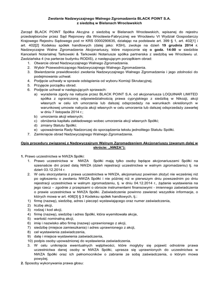 Zwołanie Nadzwyczajnego Walnego Zgromadzenia BLACK POINT S.A. z siedzibą w Bielanach Wrocławskich Zarząd BLACK POINT Spółka Akcyjna z siedzibą w Bielanach Wrocławskich, wpisanej do rejestru przedsiębiorców przez Sąd Rejonowy dla Wrocławia-Fabrycznej we Wrocławiu VI Wydział Gospodarczy Krajowego Rejestru Sądowego pod nr KRS 0000290635, działając na podstawie art. 399 § 1, art. 402[1] i art. 402[2] Kodeksu spółek handlowych (dalej jako: KSH), zwołuje na dzień 19 grudnia 2014 r. Nadzwyczajne Walne Zgromadzenie Akcjonariuszy, które rozpocznie się o godz. 14:00 w siedzibie Kancelarii Notarialnej Tarkowski & Tarkowski Notariusze spółka partnerska z siedzibą we Wrocławiu ul. Zaolziańska 4 (na parterze budynku RODIS), z następującym porządkiem obrad: 1. Otwarcie obrad Nadzwyczajnego Walnego Zgromadzenia. 2. Wybór Przewodniczącego Nadzwyczajnego Walnego Zgromadzenia. 3. Stwierdzenie prawidłowości zwołania Nadzwyczajnego Walnego Zgromadzenia i jego zdolności do podejmowania uchwał. 4. Podjęcie uchwały w sprawie odstąpienia od wyboru Komisji Skrutacyjnej. 5. Przyjęcie porządku obrad. 6. Podjęcie uchwał w następujących sprawach: a) wyrażenia zgody na nabycie przez BLACK POINT S.A. od akcjonariusza LOQUINAR LIMITED spółka z ograniczoną odpowiedzialnością prawa cypryjskiego z siedzibą w Nikozji, akcji własnych w celu ich umorzenia lub dalszej odsprzedaży na warunkach określonych w warunkowej umowie nabycia akcji własnych w celu umorzenia lub dalszej odsprzedaży zawartej w dniu 7 listopada 2014 r.; b) umorzenia akcji własnych; c) obniżenia kapitału zakładowego wobec umorzenia akcji własnych Spółki; d) zmiany Statutu Spółki; e) upoważnienia Rady Nadzorczej do sporządzenia tekstu jednolitego Statutu Spółki. 7. Zamknięcie obrad Nadzwyczajnego Walnego Zgromadzenia. Opis procedury związanej z Nadzwyczajnym Walnym Zgromadzeniem Akcjonariuszy (zwanym dalej w skrócie: „NWZA”): 1. Prawo uczestnictwa w NWZA Spółki: 1. Prawo uczestnictwa w NWZA Spółki mają tylko osoby będące akcjonariuszami Spółki na szesnaście dni przed datą NWZA (dzień rejestracji uczestnictwa w walnym zgromadzeniu) tj. na dzień 03.12.2014 r. 2. W celu skorzystania z prawa uczestnictwa w NWZA, akcjonariusz powinien złożyć nie wcześniej niż po ogłoszeniu o zwołaniu NWZA Spółki i nie później niż w pierwszym dniu powszednim po dniu rejestracji uczestnictwa w walnym zgromadzeniu, tj. w dniu 04.12.2014 r., żądanie wystawienia na jego rzecz – zgodnie z przepisami o obrocie instrumentami finansowymi - imiennego zaświadczenia o prawie uczestnictwa w NWZA Spółki. Zaświadczenie powinno zawierać wszystkie informacje, o których mowa w art. 406[3] § 3 Kodeksu spółek handlowych, tj.: 1) firmę (nazwę), siedzibę, adres i pieczęć wystawiającego oraz numer zaświadczenia, 2) liczbę akcji, 3) rodzaj i kod akcji, 4) firmę (nazwę), siedzibę i adres Spółki, która wyemitowała akcje, 5) wartość nominalną akcji, 6) imię i nazwisko albo firmę (nazwę) uprawnionego z akcji, 7) siedzibę (miejsce zamieszkania) i adres uprawnionego z akcji, 8) cel wystawienia zaświadczenia, 9) datę i miejsce wystawienia zaświadczenia, 10) podpis osoby upoważnionej do wystawienia zaświadczenia. 3. W celu uniknięcia ewentualnych wątpliwości, które mogłyby się pojawić odnośnie prawa uczestnictwa danej osoby w NWZA Spółki, uprasza się uprawnionych do uczestnictwa w NWZA Spółki oraz ich pełnomocników o zabranie ze sobą zaświadczenia, o którym mowa powyżej. 2. Sposoby wykonywania prawa głosu: 1) Akcjonariusz będący osobą fizyczną może uczestniczyć w walnym zgromadzeniu oraz wykonywać prawo głosu osobiście lub przez pełnomocnika. Akcjonariusz, który nie jest osobą fizyczną, może uczestniczyć w walnym zgromadzeniu oraz wykonywać prawo głosu przez osobę uprawnioną do składania oświadczeń woli w jego imieniu lub przez pełnomocnika. 2) Prawo do reprezentowania akcjonariusza nie będącego osobą fizyczną przez osobę uprawnioną do składania oświadczeń woli w jego imieniu albo przez pełnomocnika powinno być potwierdzone okazanym przy sporządzaniu listy obecności odpisie z właściwego rejestru lub innymi dokumentami urzędowymi, przy czym zastrzeżenie dotyczące dokumentów urzędowych nie dotyczy pełnomocnictwa. 3) Pełnomocnik wykonuje wszystkie uprawnienia akcjonariusza na walnym zgromadzeniu, chyba że co innego wynika z treści pełnomocnictwa. Pełnomocnik może udzielić dalszego pełnomocnictwa, jeżeli wynika to z treści pełnomocnictwa. Pełnomocnik może reprezentować więcej niż jednego akcjonariusza i głosować odmiennie z akcji każdego akcjonariusza. Akcjonariusz posiadający akcje zapisane na rachunku zbiorczym może ustanowić oddzielnych pełnomocników do wykonywania praw z akcji zapisanych na tym rachunku. Akcjonariusz posiadający akcje zapisane na więcej niż jednym rachunku papierów wartościowych może ustanowić oddzielnych pełnomocników do wykonywania praw z akcji zapisanych na każdym z rachunków. 4) Pełnomocnictwo do uczestniczenia w NWZA Spółki i wykonywania prawa głosu może być udzielone w formie pisemnej lub w postaci elektronicznej. Udzielenie pełnomocnictwa w postaci elektronicznej nie wymaga opatrzenia bezpiecznym podpisem elektronicznym weryfikowanym przy pomocy ważnego kwalifikowanego certyfikatu. 5) O udzieleniu pełnomocnictwa w postaci elektronicznej akcjonariusz zawiadamia Spółkę, przesyłając pocztą elektroniczną na adres [email protected] dokument w formacie PDF zawierający tekst pełnomocnictwa oraz podpis akcjonariusza. Formularz zawierający wzór pełnomocnictwa dostępny jest od dnia publikacji niniejszego ogłoszenia na stronie internetowej pod adresem www.blackpoint.pl w zakładce „DLA INWESTORÓW”. 6) Spółka ze swojej strony podejmie działania służące identyfikacji mocodawcy i pełnomocnika w celu potwierdzenia skuteczności u
