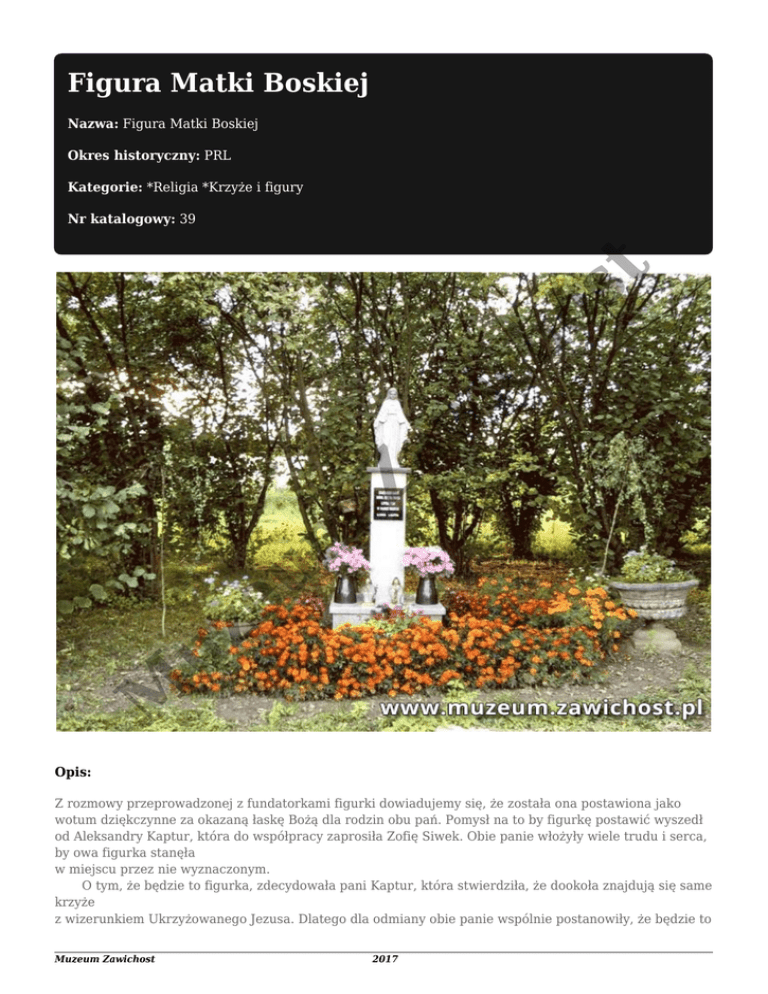 Figura Matki Boskiej Nazwa: Figura Matki Boskiej Okres historyczny: PRL Kategorie: *Religia *Krzyże i figury M uz eu m Za w ic ho s t Nr katalogowy: 39 Opis: Z rozmowy przeprowadzonej z fundatorkami figurki dowiadujemy się, że została ona postawiona jako wotum dziękczynne za okazaną łaskę Bożą dla rodzin obu pań. Pomysł na to by figurkę postawić wyszedł od Aleksandry Kaptur, która do współpracy zaprosiła Zofię Siwek. Obie panie włożyły wiele trudu i serca, by owa figurka stanęła w miejscu przez nie wyznaczonym. O tym, że będzie to figurka, zdecydowała pani Kaptur, która stwierdziła, że dookoła znajdują się same krzyże z wizerunkiem Ukrzyżowanego Jezusa. Dlatego dla odmiany obie panie wspólnie postanowiły, że będzie to Muzeum Zawichost 2017 M uz eu m Za w ic ho s t wizerunek Matki Bożej. Właścicielem terenu, na którym ustawiono figurkę jest pani Siwek. Znajduje się on w Zawichoście, w środkowej części ulicy Polnej, a dokładnie na rozstaju ulic Polnej i Sadowej. Jednak postawienie rzeźby w tym miejscu okazało się nie takie proste. Konieczne było bowiem wykonanie projektu i jego uzgodnienie. Dopiero po uzyskaniu zgody na jej postawienie we wskazanej lokalizacji, fundatorki złożyły u kamieniarza w Ożarowie zmówienie na wykonanie figurki. Rzeźba została wykuta w granicie, który jest materiałem trwałym i łatwym do utrzymania, bowiem jak powiedziała pani Siwek granit jest łatwy w czyszczeniu i nawet za kilkadziesiąt lat, jak nie będzie miał kto o niego dbać, sama przyroda się nim zaopiekuje. Dzięki temu być może nie spotka jej los figurek kamiennych, które w wielu przypadkach w ciszy i zapomnieniu szarzeją i porastają mchem. Na cokole figurki planowano umieszczenie napisu Matko Boska Nieustającej Pomocy, ale po konsultacji z proboszczem parafii Wniebowzięcia Najświętszej Maryi Panny w Zawichoście ostatecznie ustalono, że będzie on miał następujące brzmienie: Szafarko Łask Módl się za Nami. Figurka została poświęcona pod koniec maja 2011 r., w uroczystości tej udział wzięło wielu mieszkańców Zawichostu. Podczas niej niebo się zachmurzyło i zerwał się silny wiatr, ale bezdeszczowa aura utrzymała się do samego końca ceremonii. Poświęcenia dokonał ksiądz proboszcz - Marek Rusak. Pod figurką podczas nabożeństw majowych modlą się wspólnie mieszkańcy Zawichostu. Muzeum Zawichost 2017