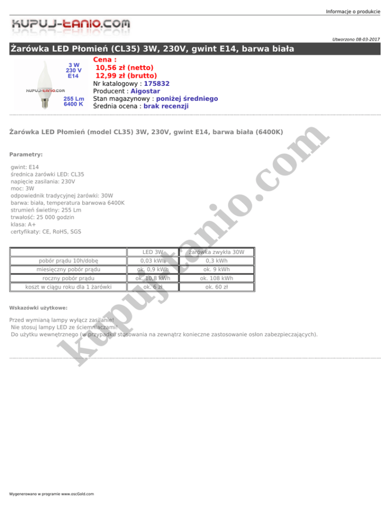 Informacje o produkcie Utworzono 08-03-2017 Żarówka LED Płomień (CL35) 3W, 230V, gwint E14, barwa biała Cena : 10,56 zł (netto) 12,99 zł (brutto) Nr katalogowy : 175832 Producent : Aigostar Stan magazynowy : poniżej średniego Średnia ocena : brak recenzji io .c om Żarówka LED Płomień (model CL35) 3W, 230V, gwint E14, barwa biała (6400K) Parametry: an gwint: E14 średnica żarówki LED: CL35 napięcie zasilania: 230V moc: 3W odpowiednik tradycyjnej żarówki: 30W barwa: biała, temperatura barwowa 6400K strumień świetlny: 255 Lm trwałość: 25 000 godzin klasa: A+ certyfikaty: CE, RoHS, SGS miesięczny pobór prądu roczny pobór prądu ku p Wskazówki użytkowe: 0,03 kWh 0,3 kWh ok. 0,9 kWh ok. 9 kWh ok. 10,8 kWh ok. 108 kWh ok. 6 zł ok. 60 zł uj koszt w ciągu roku dla 1 żarówki żarówka zwykła 30W -t pobór prądu 10h/dobę LED 3W Przed wymianą lampy wyłącz zasilanie! Nie stosuj lampy LED ze ściemniaczami! Do użytku wewnętrznego (w przypadku stosowania na zewnątrz konieczne zastosowanie osłon zabezpieczających). Wygenerowano w programie www.oscGold.com